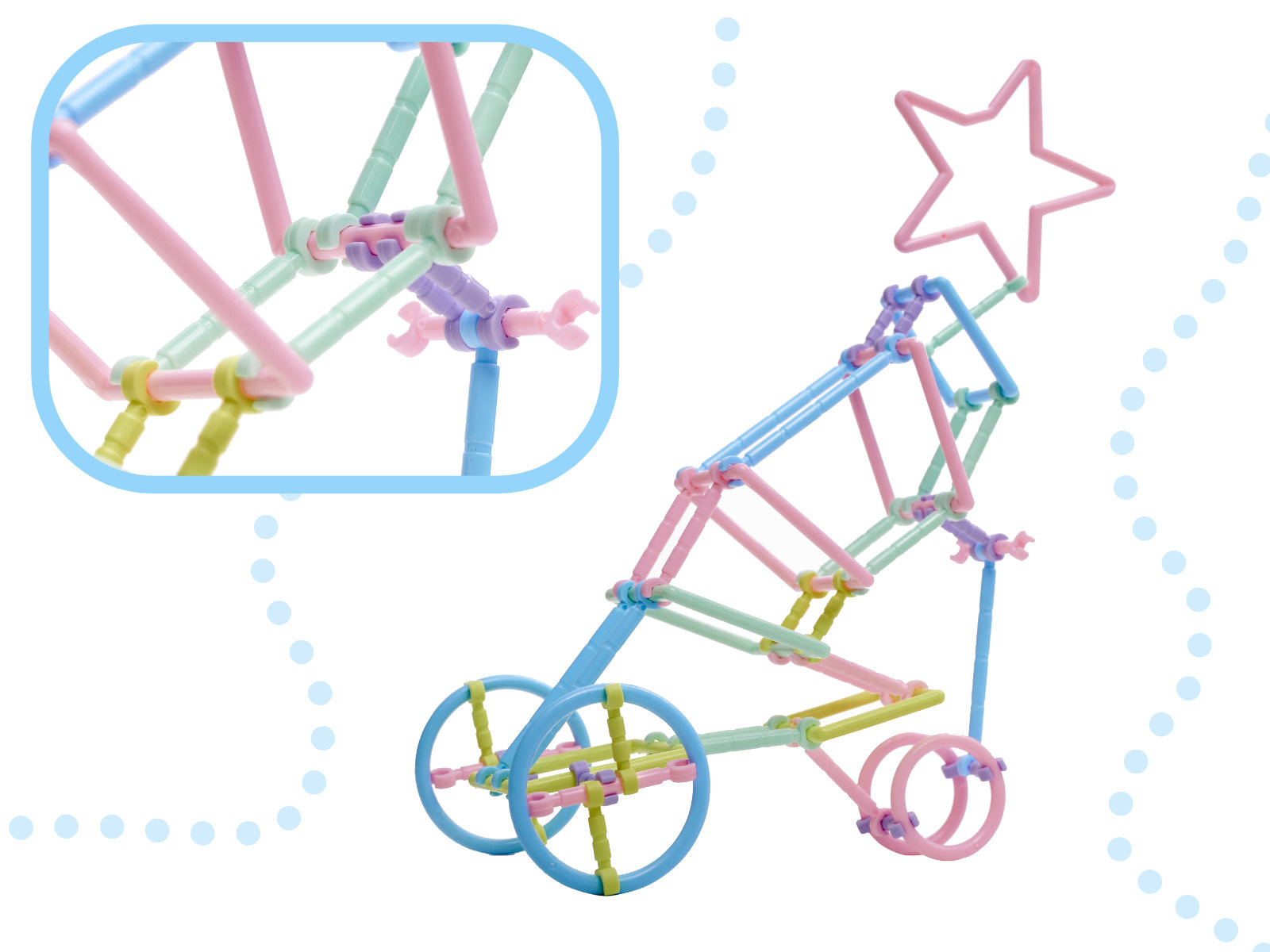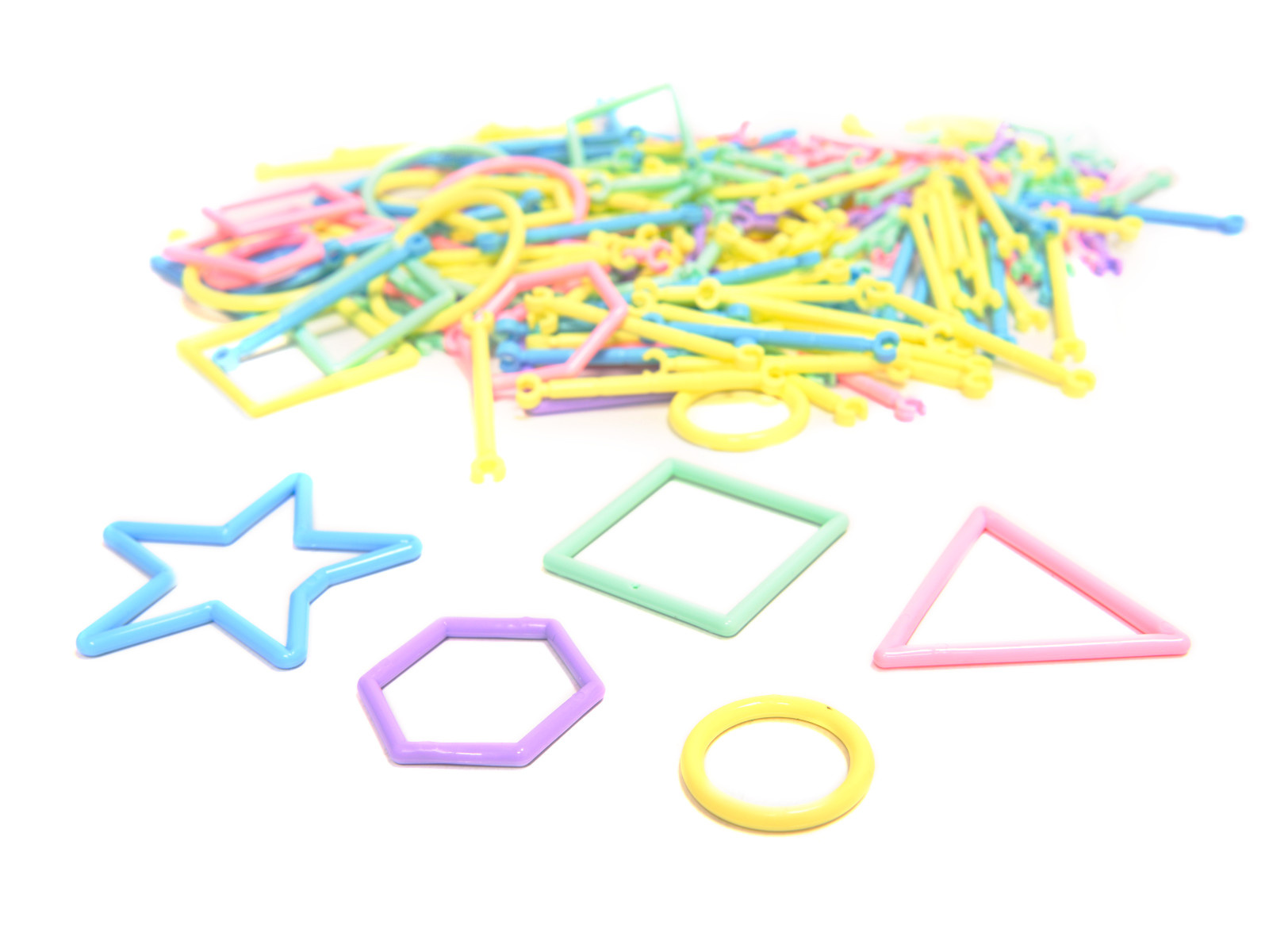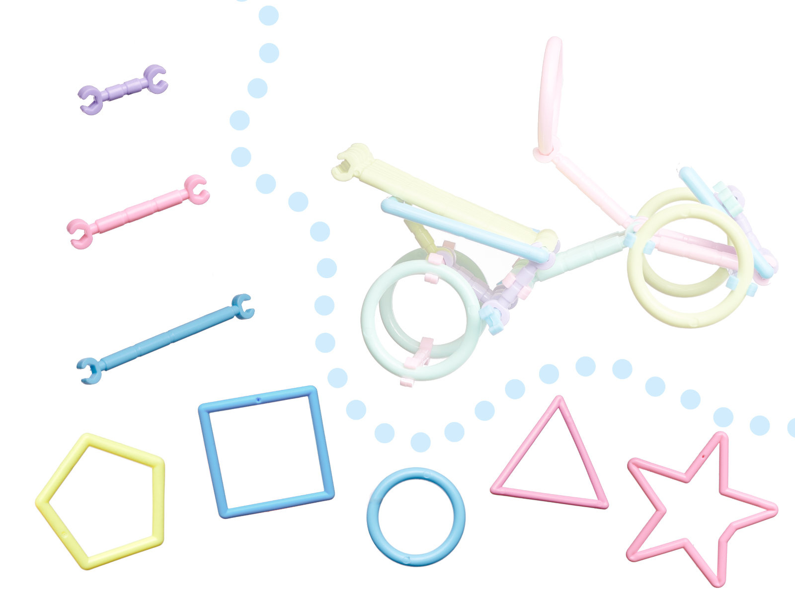 Kunststoffbausatz - Stäbe und andere Formen für den Bau von 3D-Modellen. Zunächst erstellen wir eine flache Form, dann fügen wir Verbindungselemente hinzu und erweitern das Gebäude in den Raum. Es bietet unzählige Möglichkeiten für kleine Bauherren.