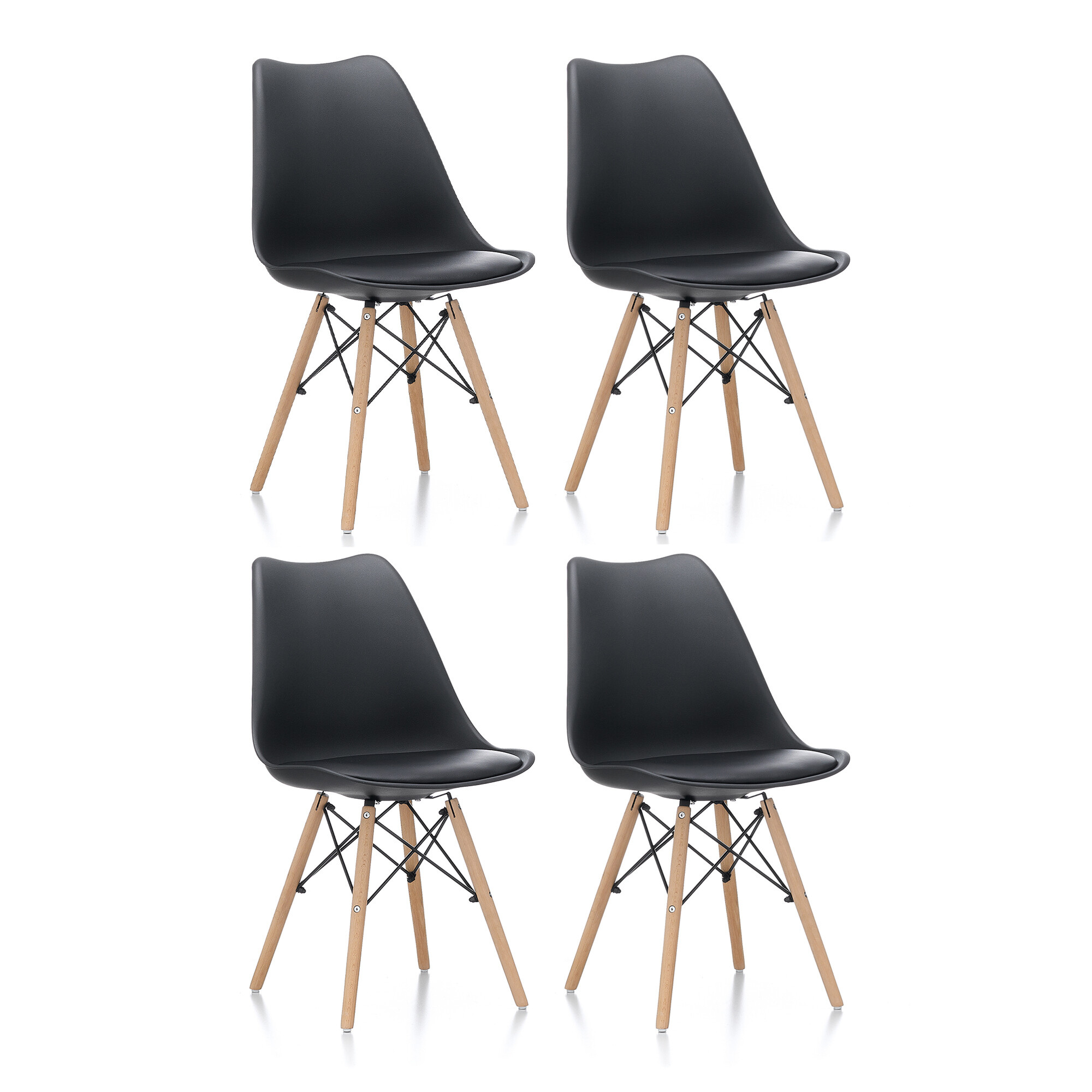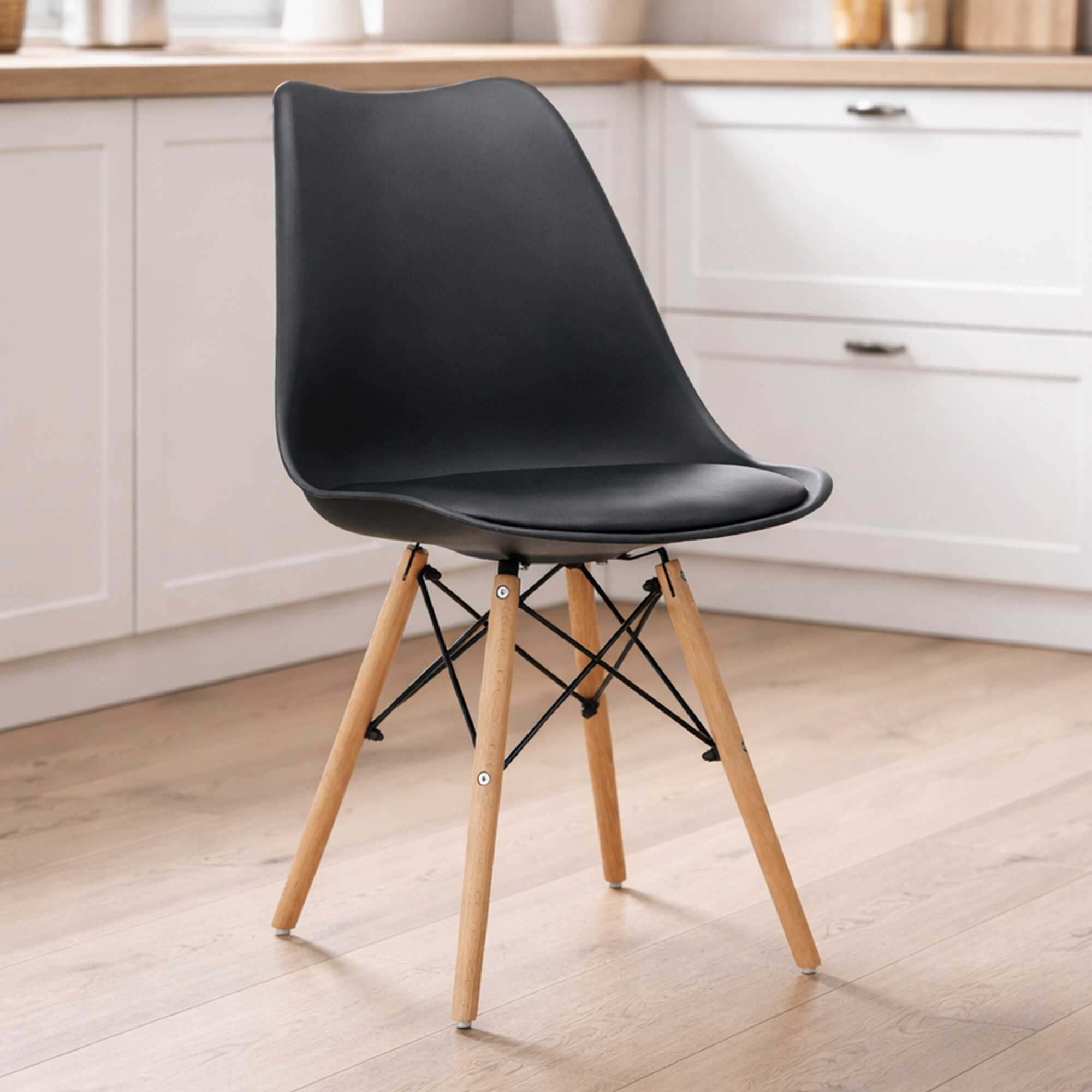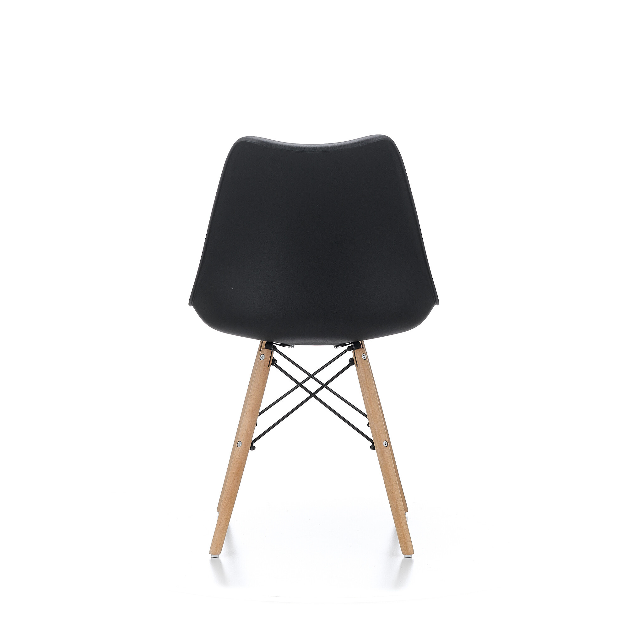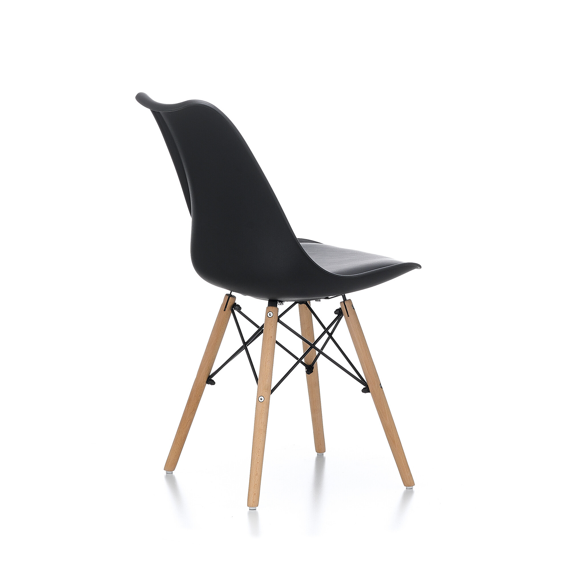 Der Stuhl ist aus hochwertigem und strapazierfähigem Polypropylen mit einem Kissen mit Kunstlederbezug in Kombination mit einem Buchenholzgestell gefertigt.