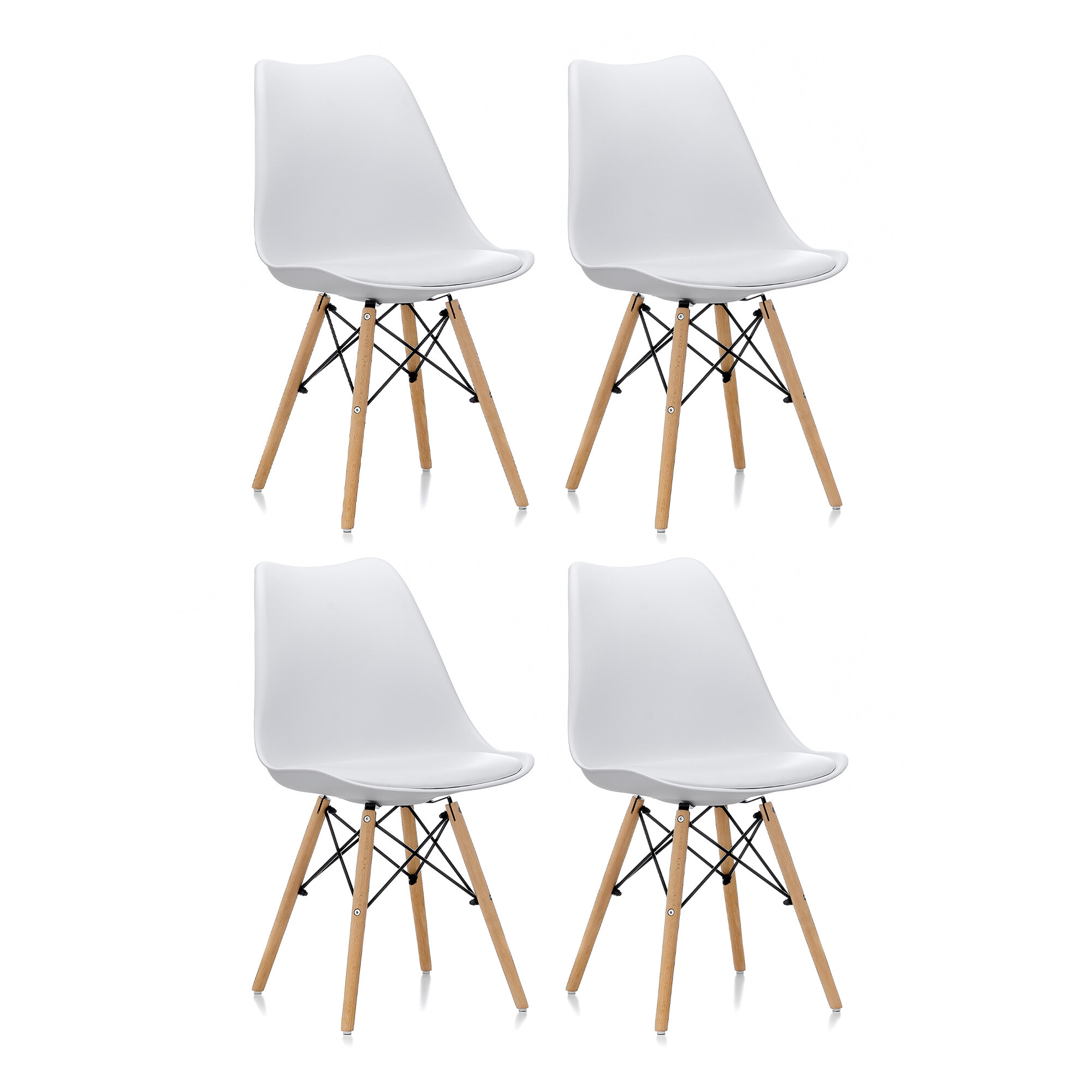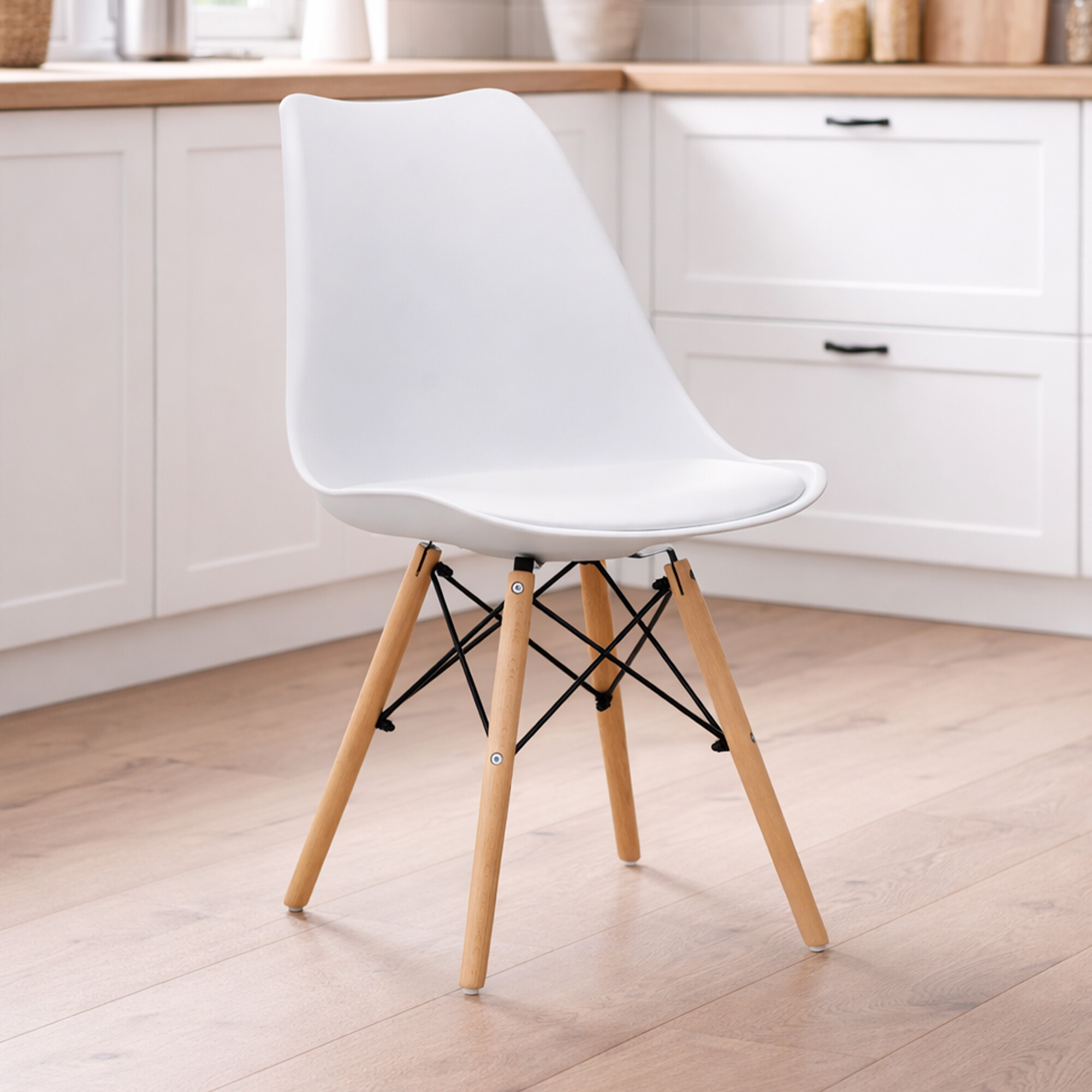Der Stuhl ist aus hochwertigem und strapazierfähigem Polypropylen mit einem Kissen mit Kunstlederbezug in Kombination mit einem Buchenholzgestell gefertigt.