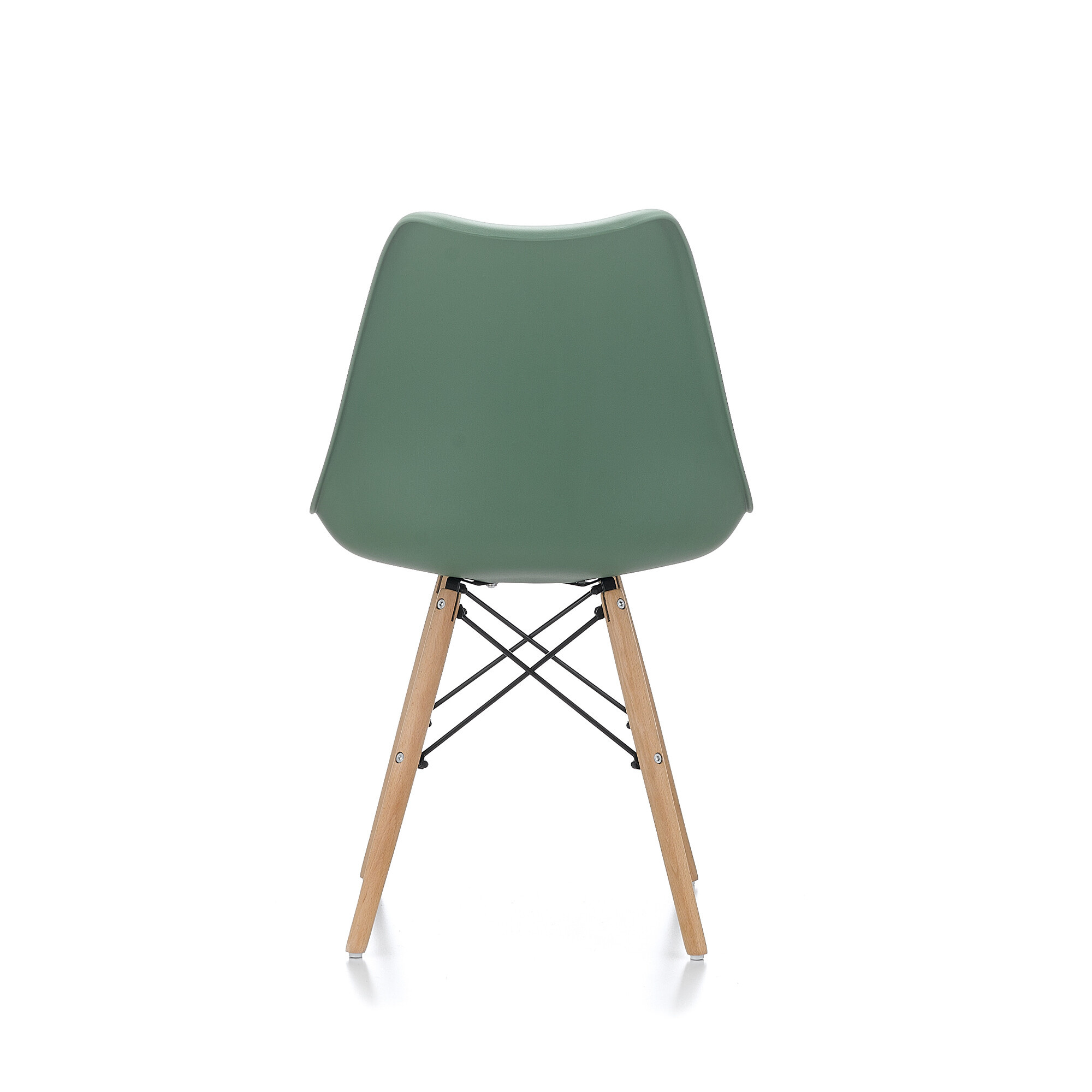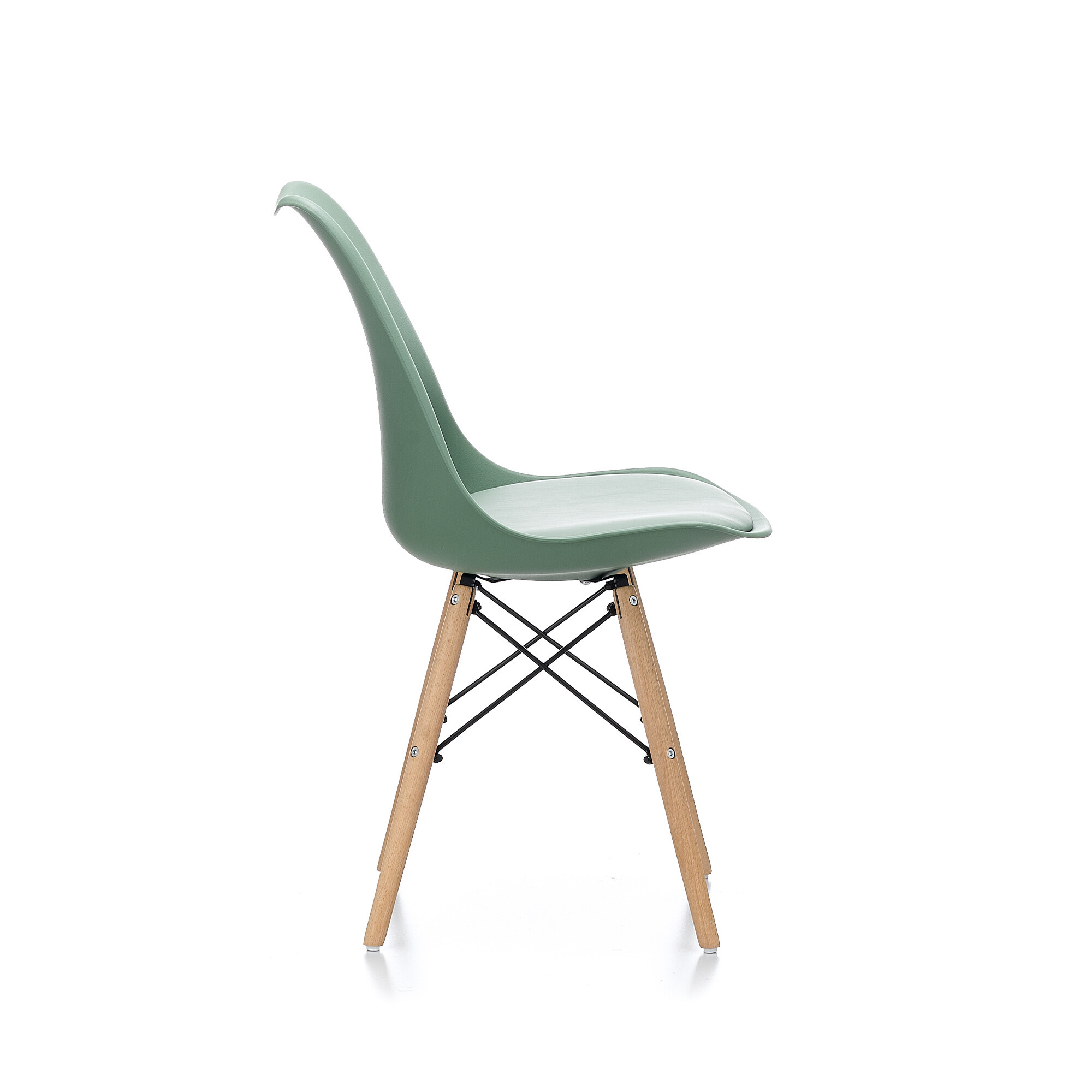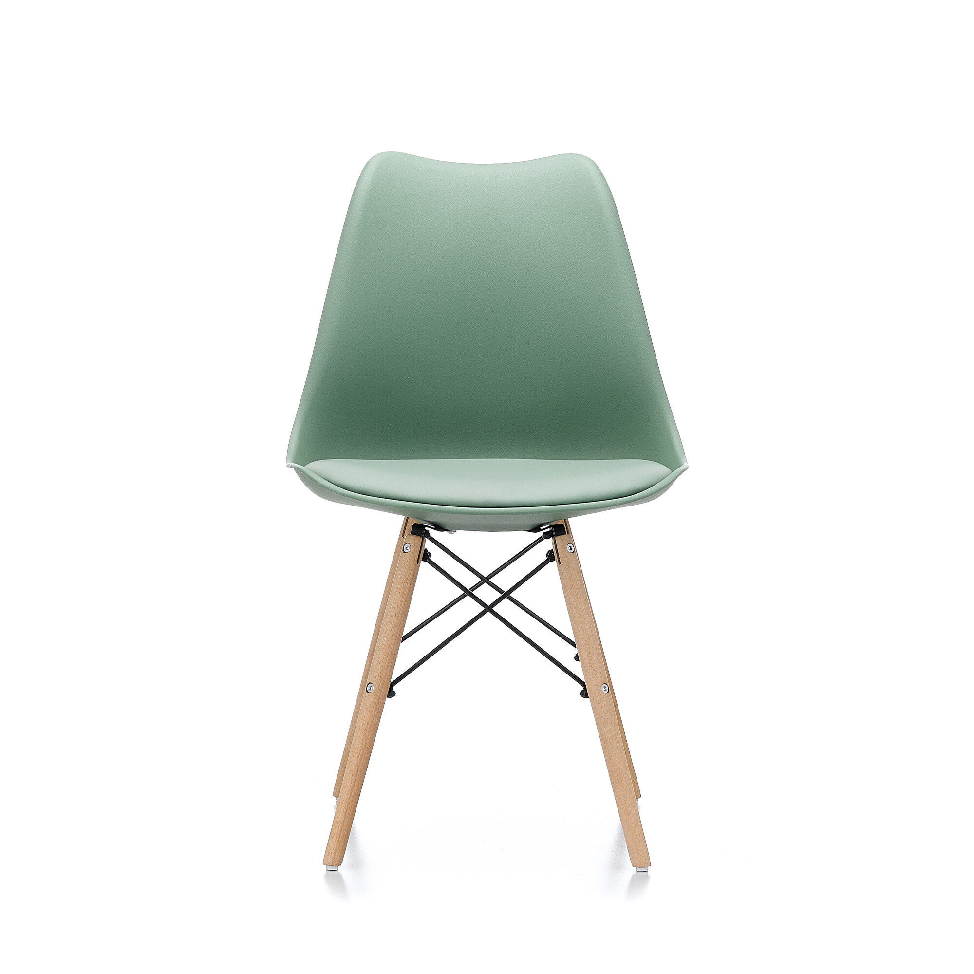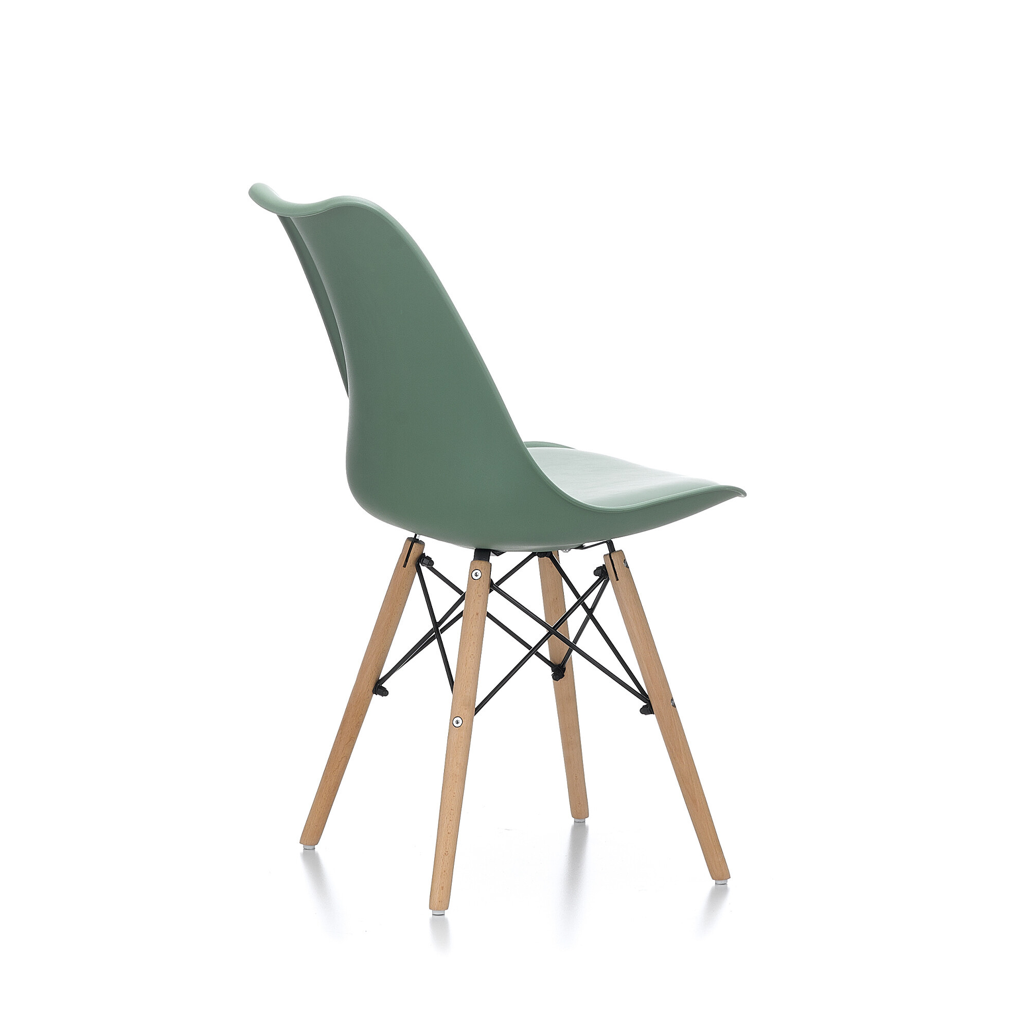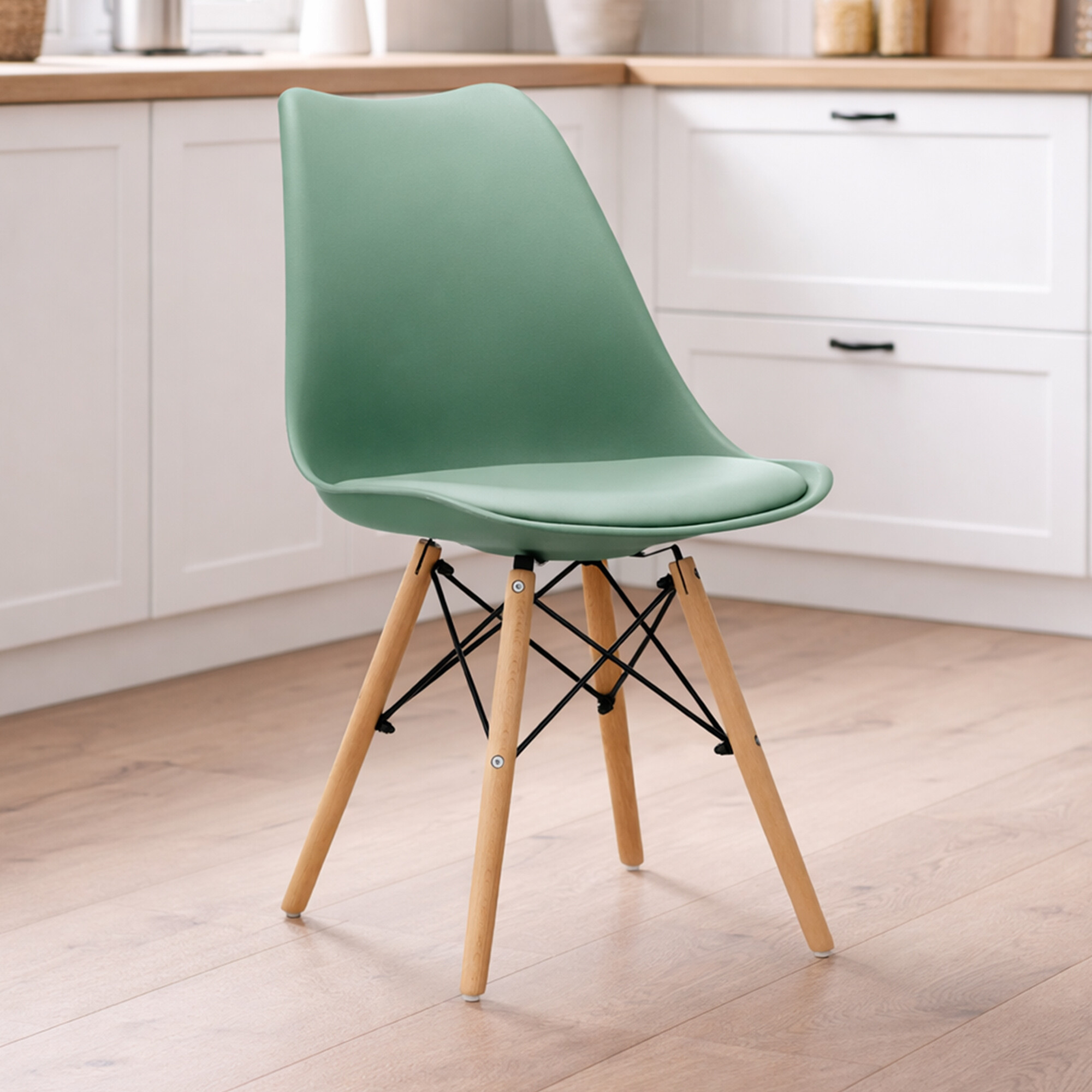 Der Stuhl ist aus hochwertigem und strapazierfähigem Polypropylen mit einem Kissen mit Kunstlederbezug in Kombination mit einem Buchenholzgestell gefertigt.