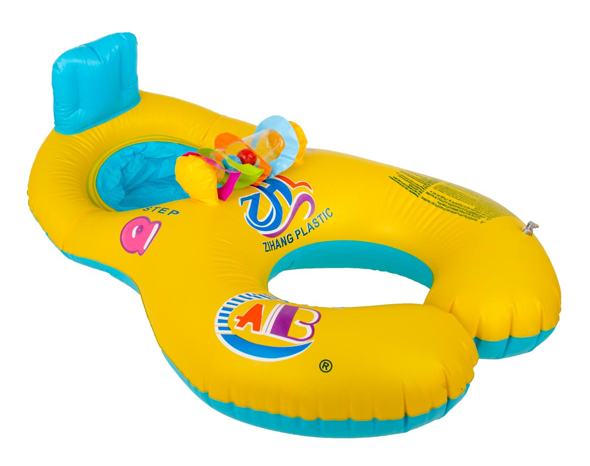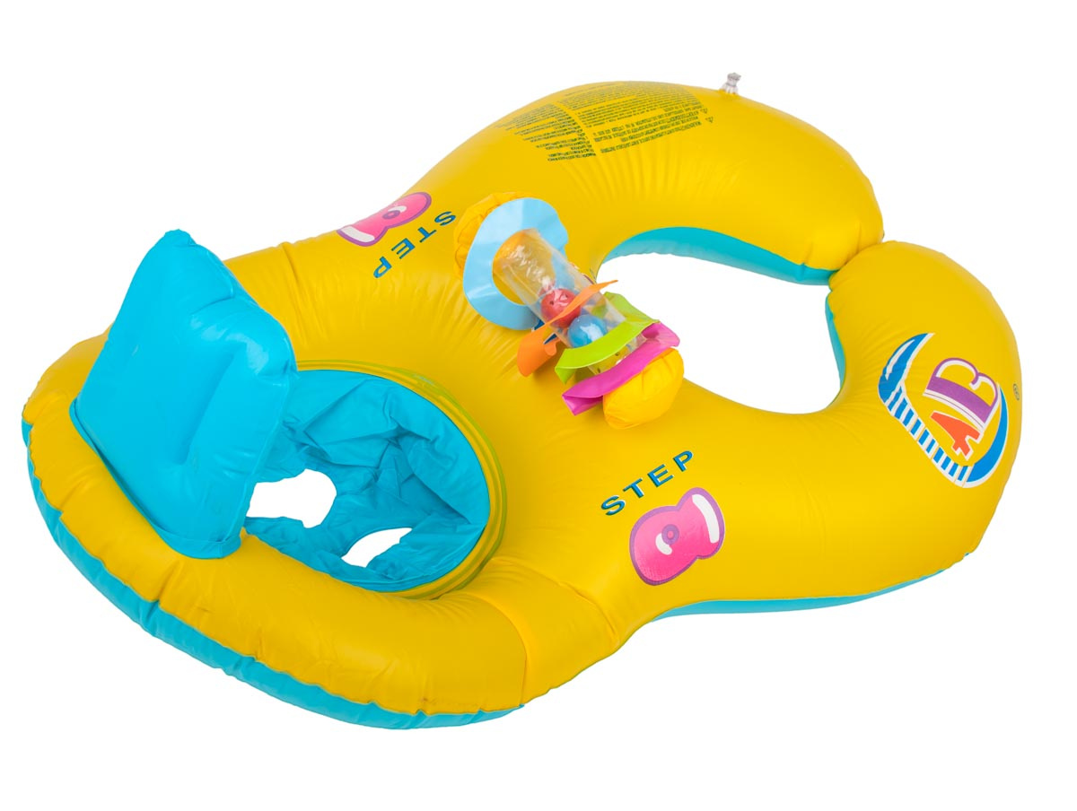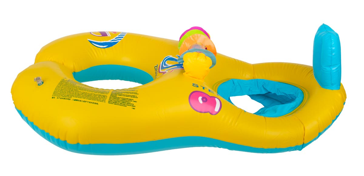 An dem Rad sind bunte, klappernde Bälle befestigt, die das Spiel interessanter machen und das Kind zum Schwimmenlernen anregen.