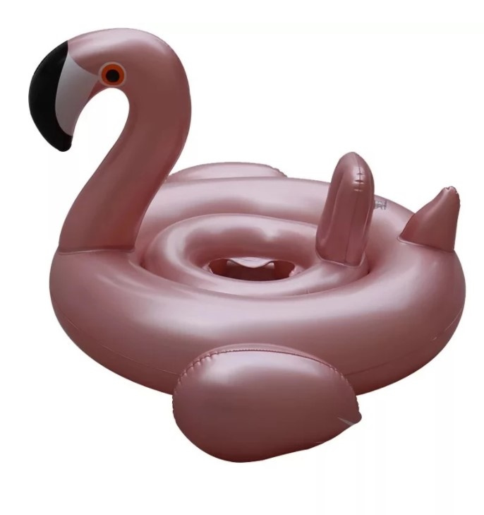 Rosa aufblasbares Fahrrad in Form eines Flamingos für Kinder mit einem Sitz, aus hochwertigem PVC-Kunststoff, die eine lange Lebensdauer garantieren.