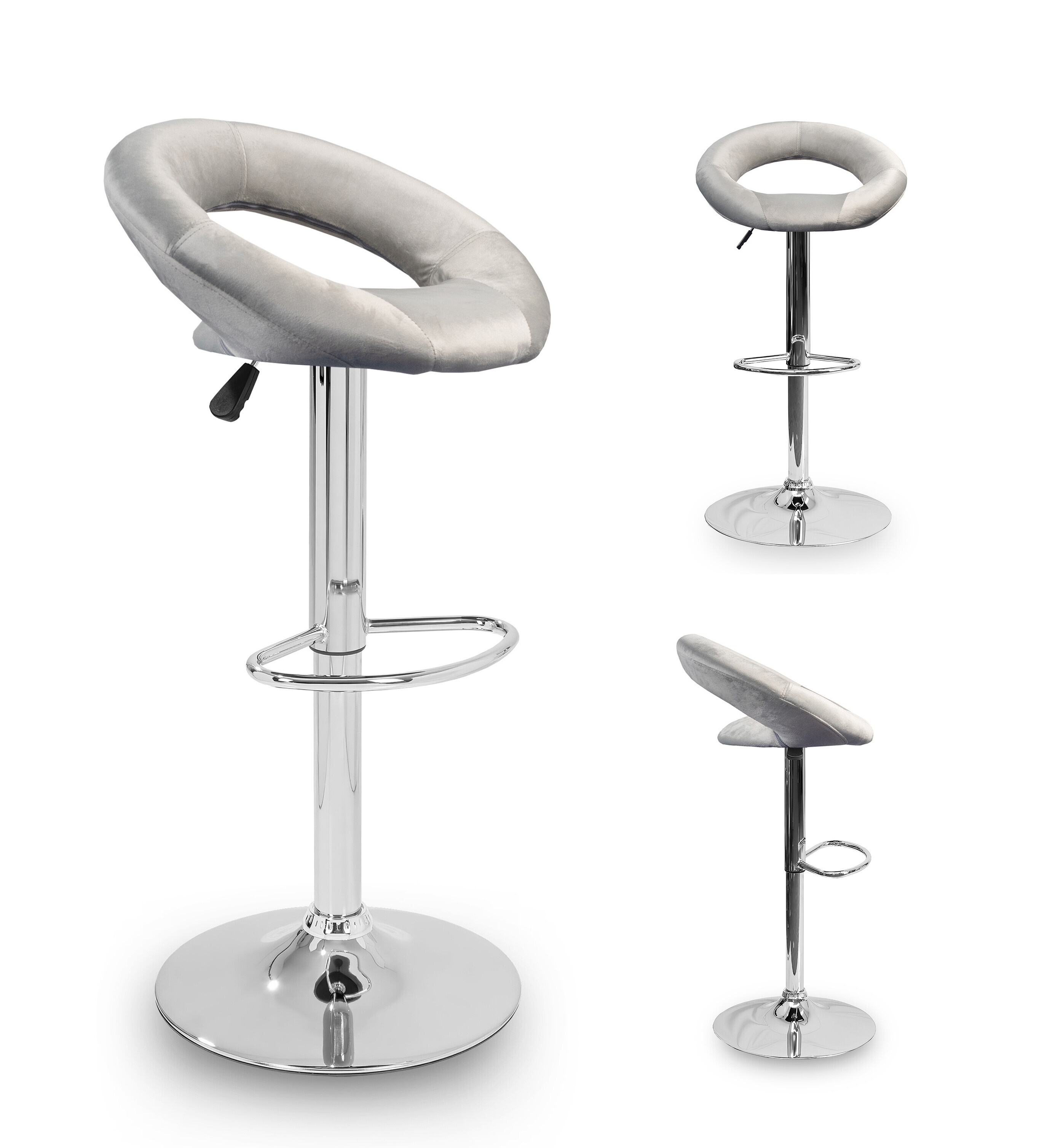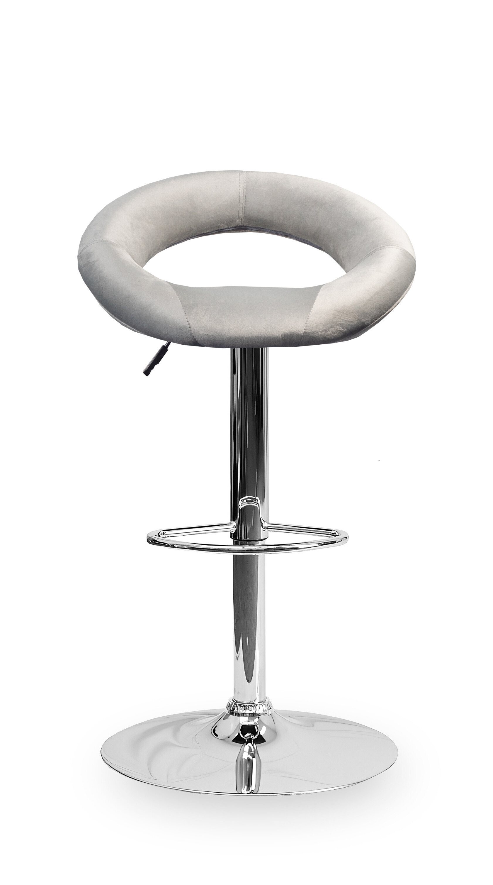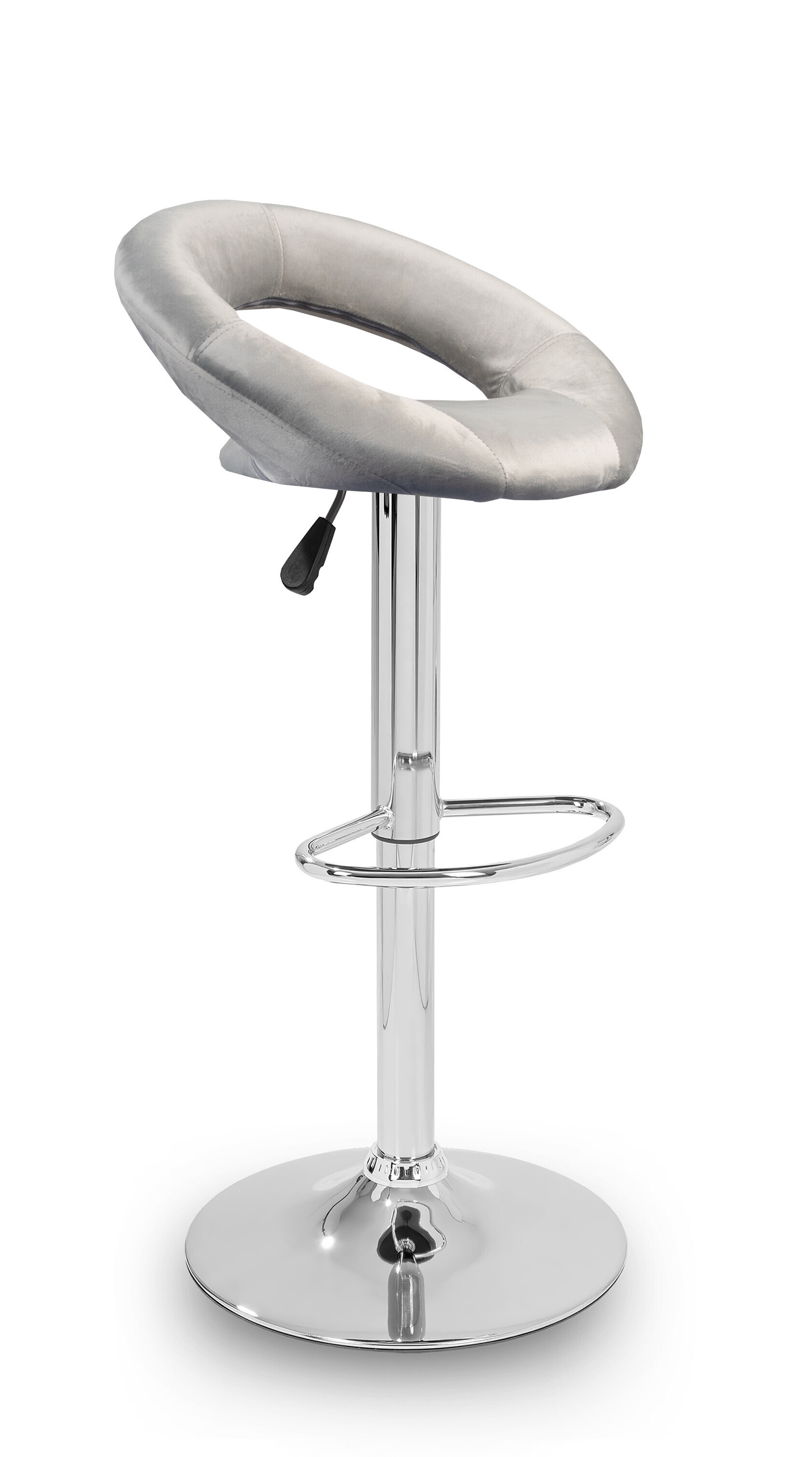 Der Stuhl zeichnet sich durch kreisförmige Formen aus, ein kreisförmiger Sitz ist mit einer kreisförmigen Rückenlehne verbunden.Die Oberfläche des Sitzbereichs des Barhockers ist aus Samt.