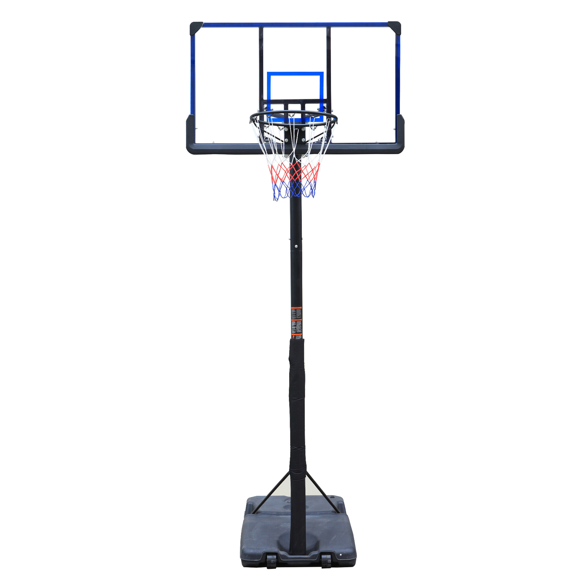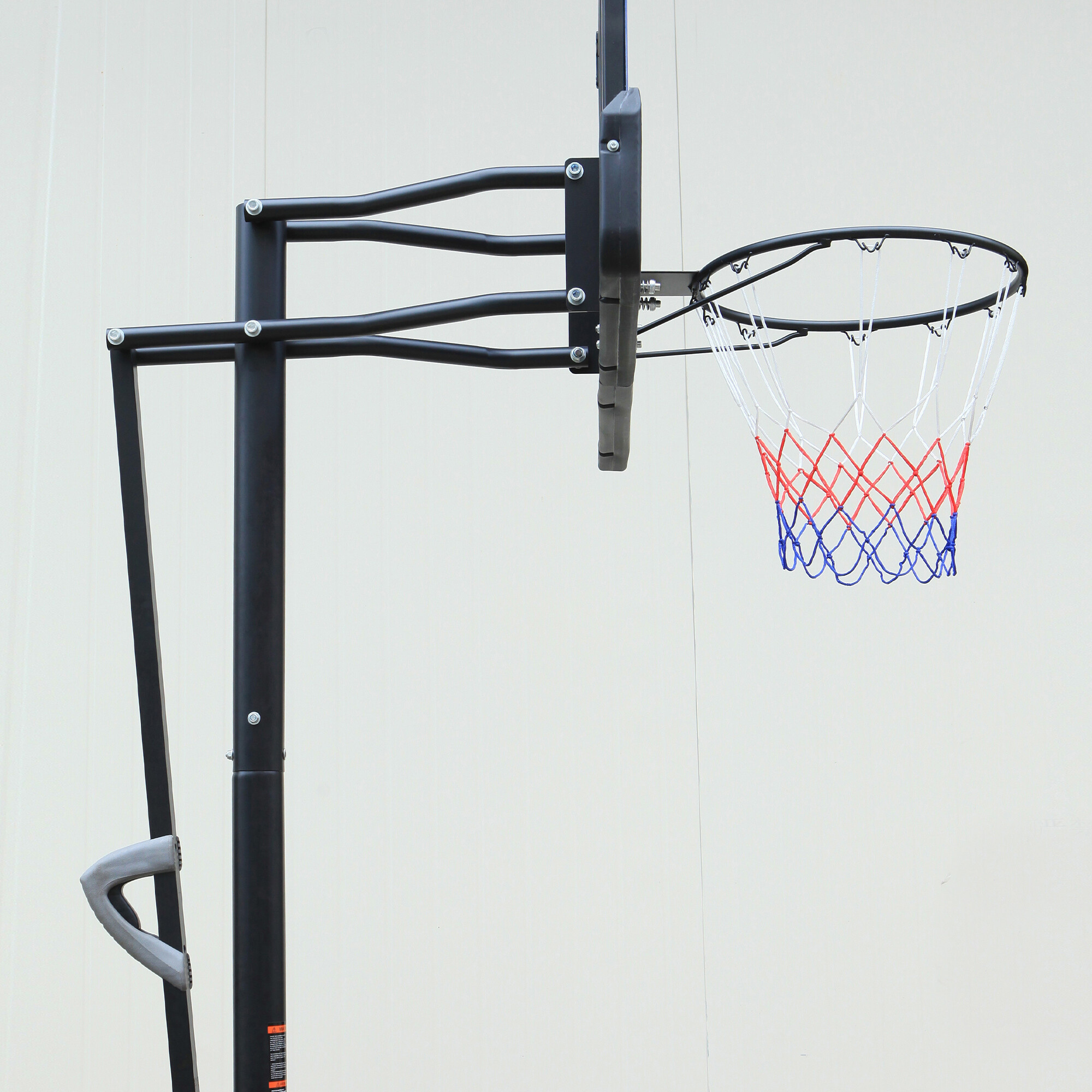 Mobiler Basketballkorb mit verstellbarer Höhe, fester Kunststoffplatte und Ring mit Netz.
