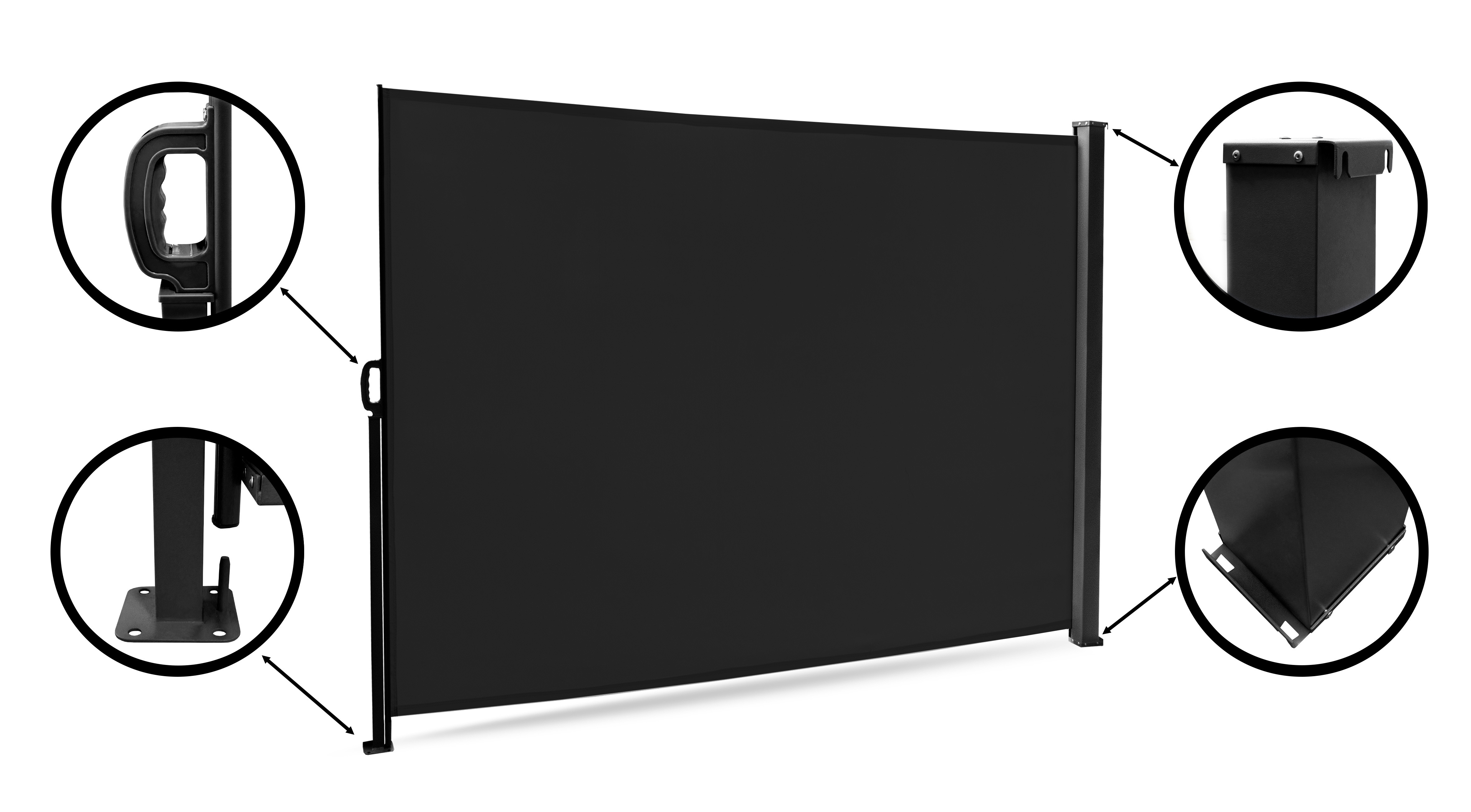 Der Markisenstoff besteht aus strapazierfähigem Polyester mit einer Dichte von 180 g/m². Die Struktur der Markise ist aus pulverbeschichtetem Stahl gefertigt.