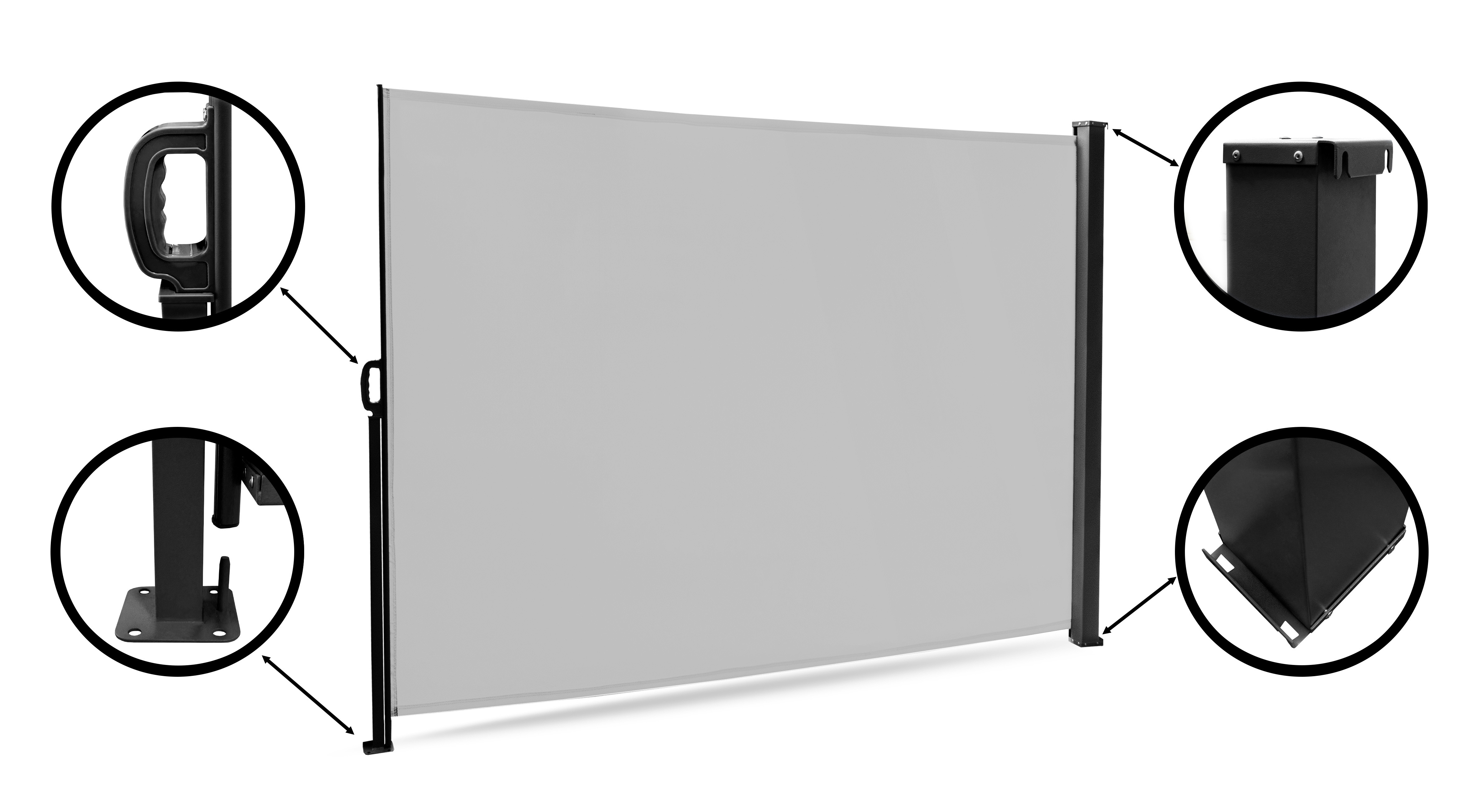 Der Markisenstoff besteht aus strapazierfähigem Polyester mit einer Dichte von 180 g/m². Die Struktur der Markise ist aus pulverbeschichtetem Stahl gefertigt.