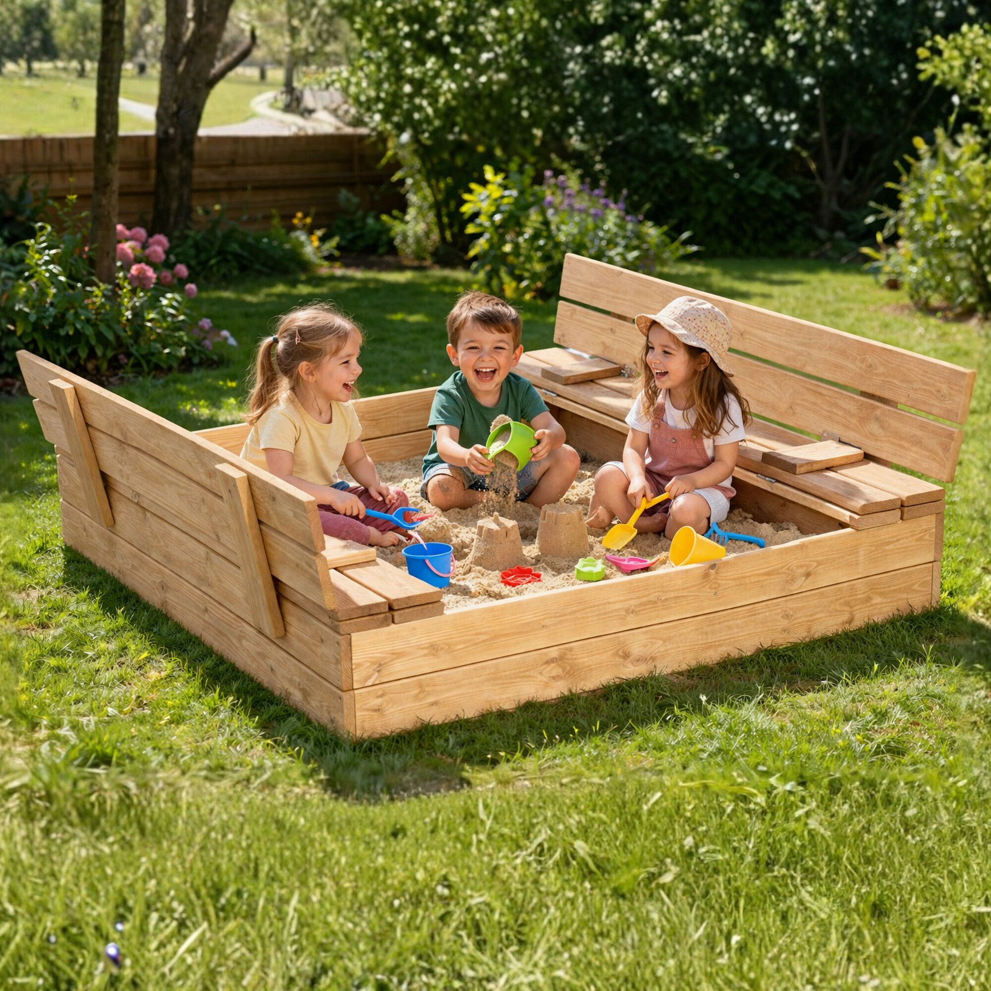 Ein großer Vorteil ist die praktische Schutzabdeckung, die den Sand vor Schmutz, Regen und Tieren schützt. Nach dem Öffnen verwandelt sich die Luke leicht in bequeme Bänke, auf denen die Kinder während des Spiels sitzen können.