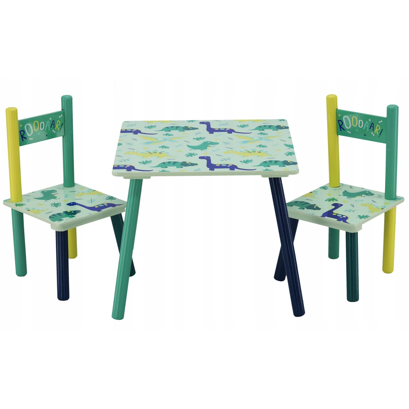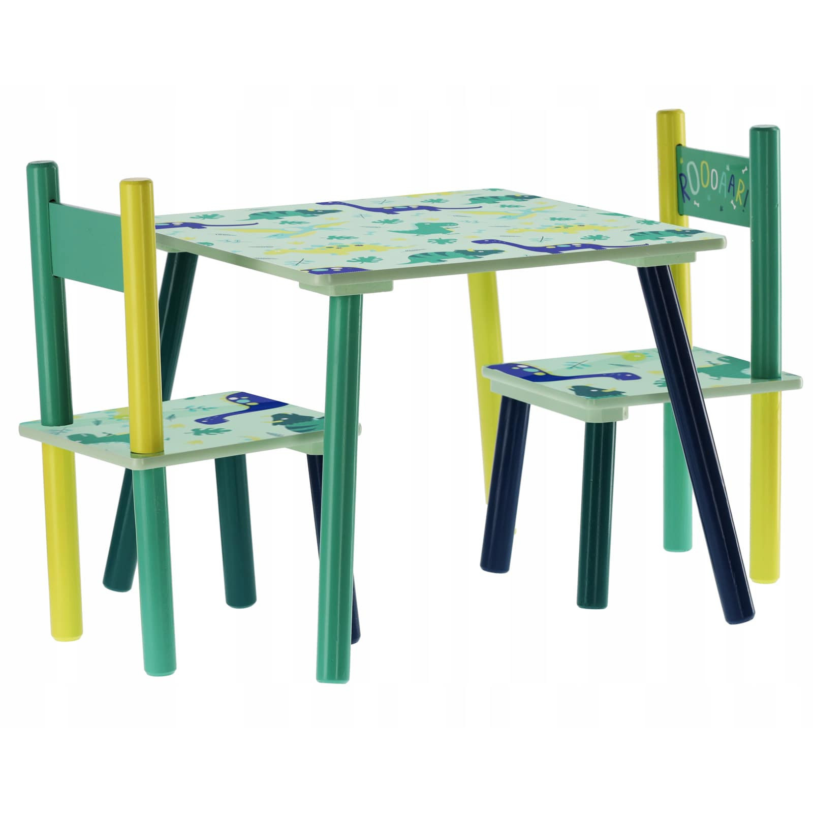 2 Stühle sind ebenfalls enthalten. Der Kindertisch mit Stühlen ist aus MDF-Material und Kiefernholz gefertigt.