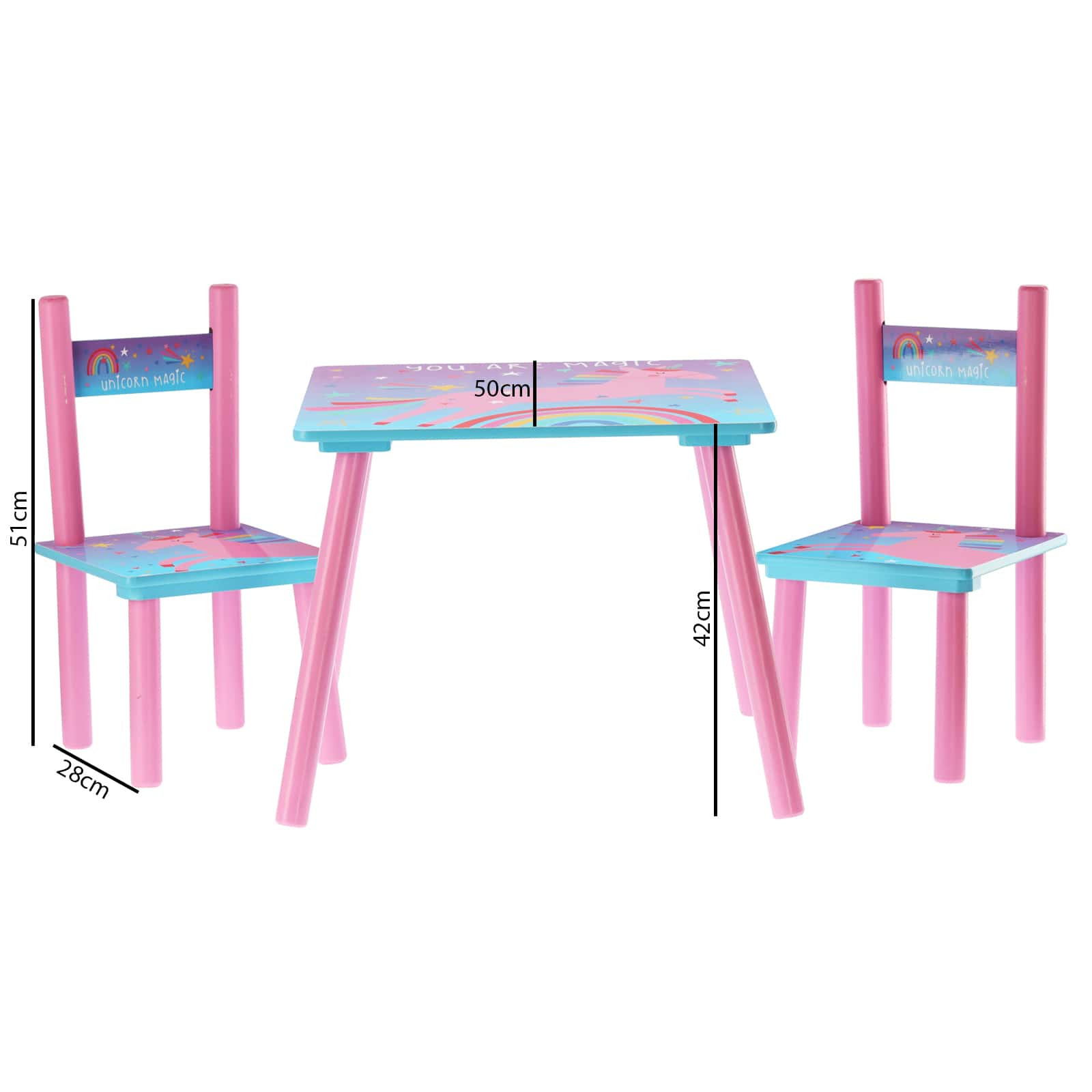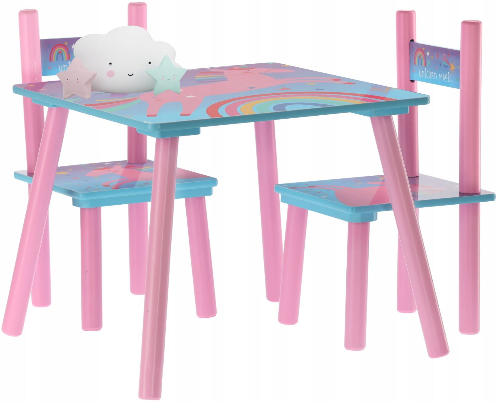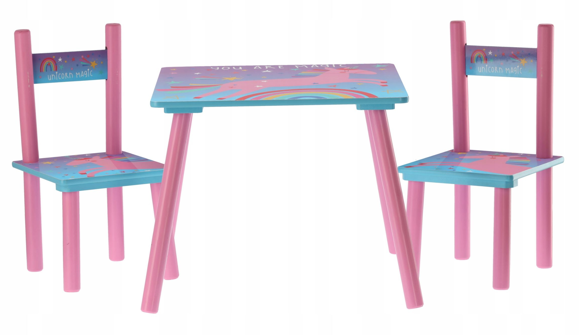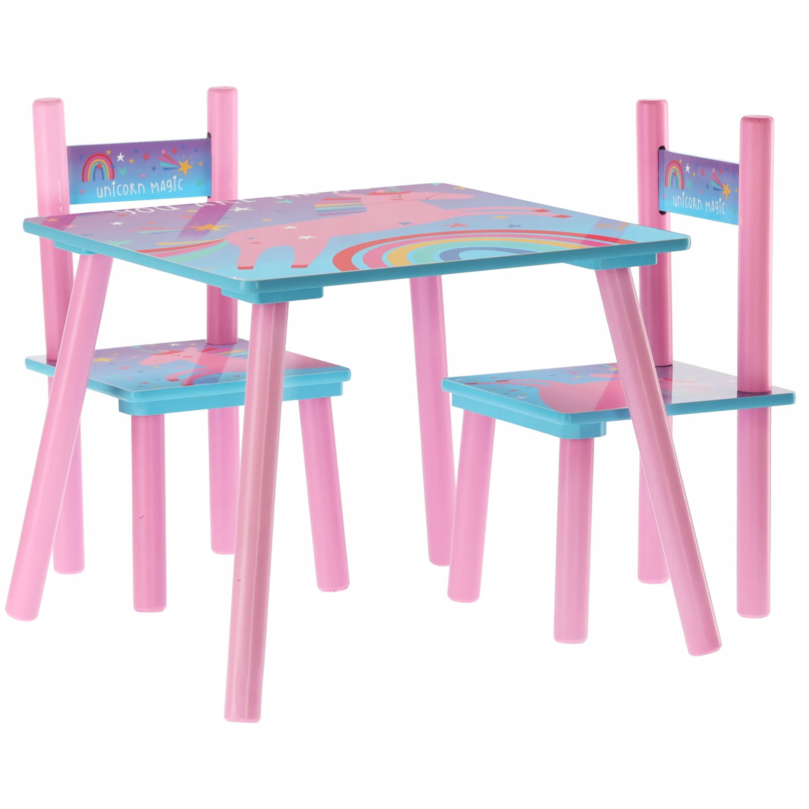 2 Stühle sind ebenfalls enthalten. Der Kindertisch mit Stühlen ist aus MDF-Material und Kiefernholz gefertigt.
