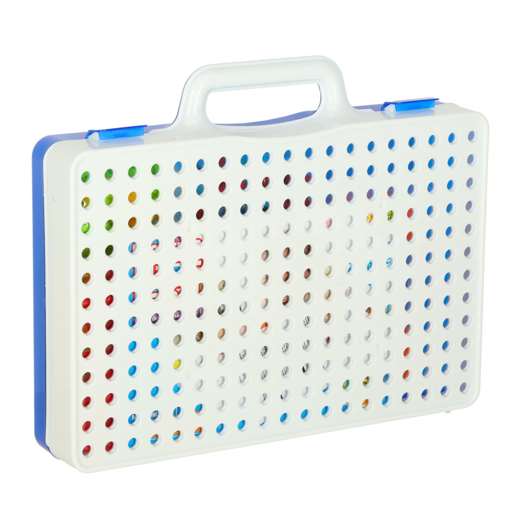 Die Schraubplatte dient gleichzeitig als Koffer, was die Aufbewahrung und den Transport der Würfel erleichtert.