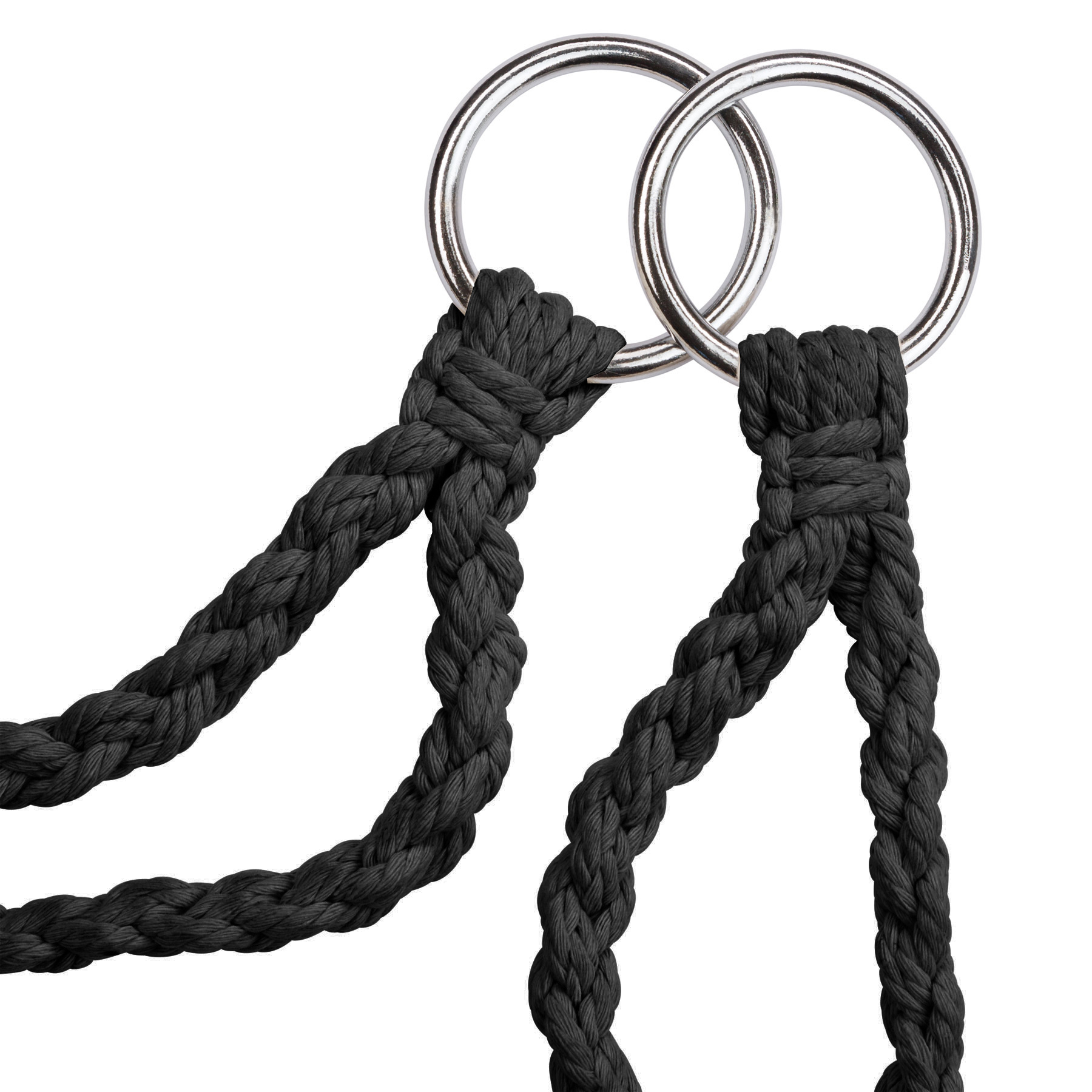Das Sitzteil ist mit stabilen Metallringen befestigt, so dass der Stuhl fast überall aufgehängt werden kann. Der Sitzteil ist aus starkem, geflochtenem Seil gefertigt.