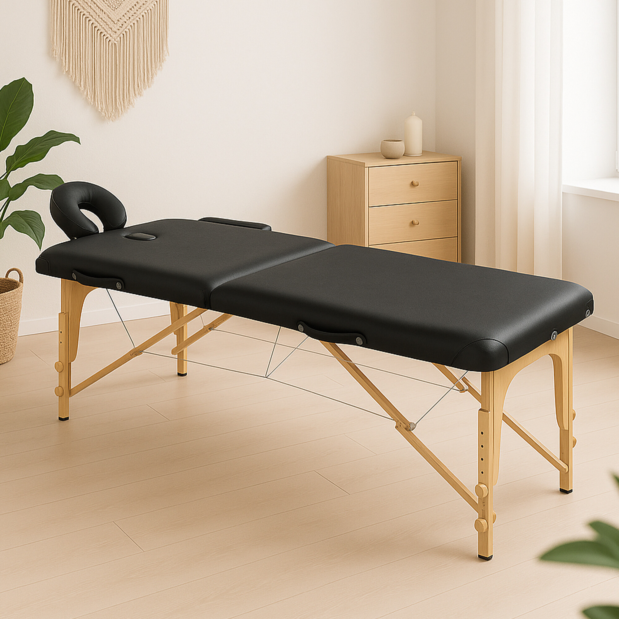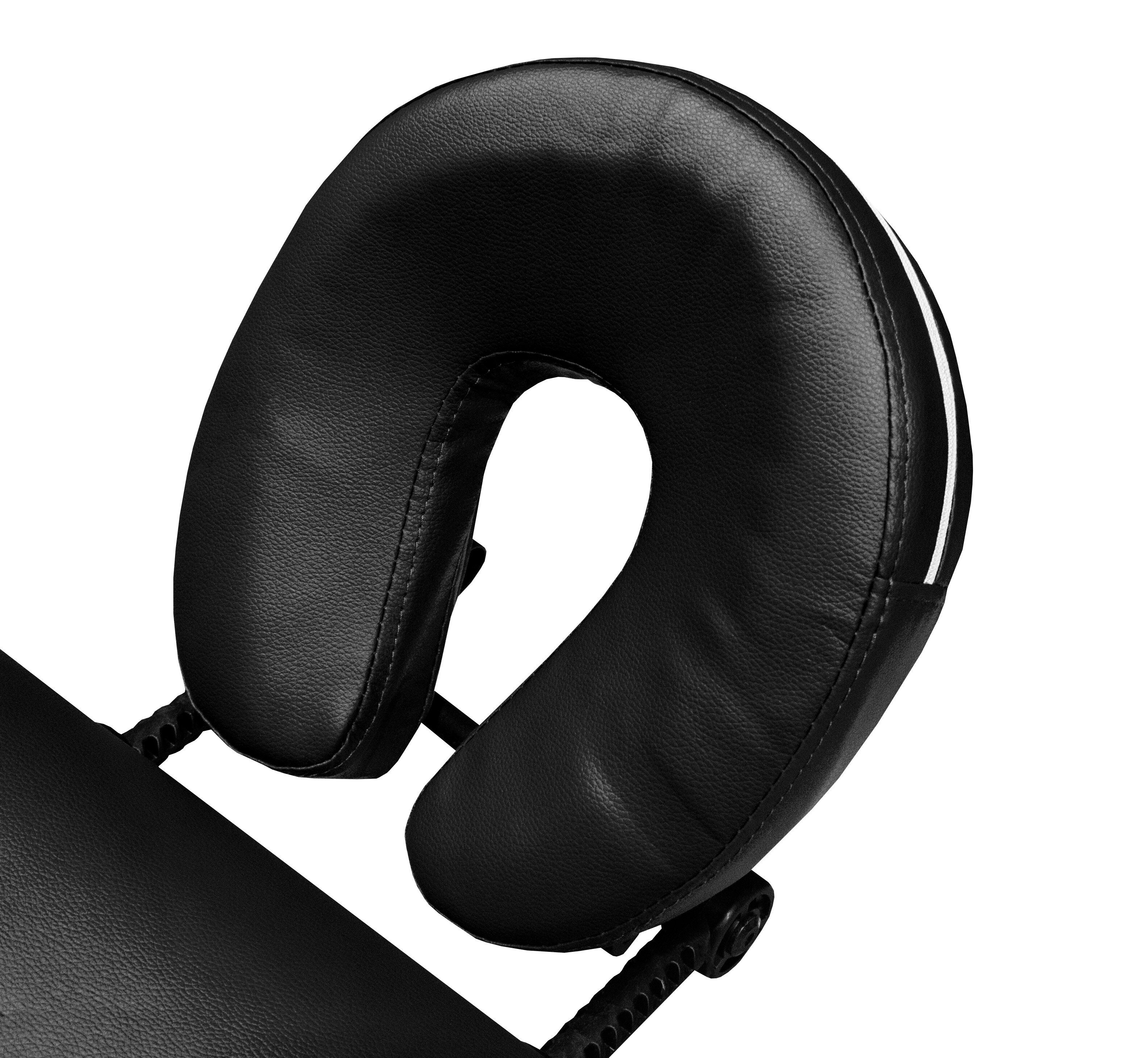 Die Komfortgarantie wird durch die Breite und Länge der Massageliege, die stufenlos verstellbare Kopfstütze, die Gesichtsaussparung mit Verschluss und die abnehmbaren Armlehnen gewährleistet.