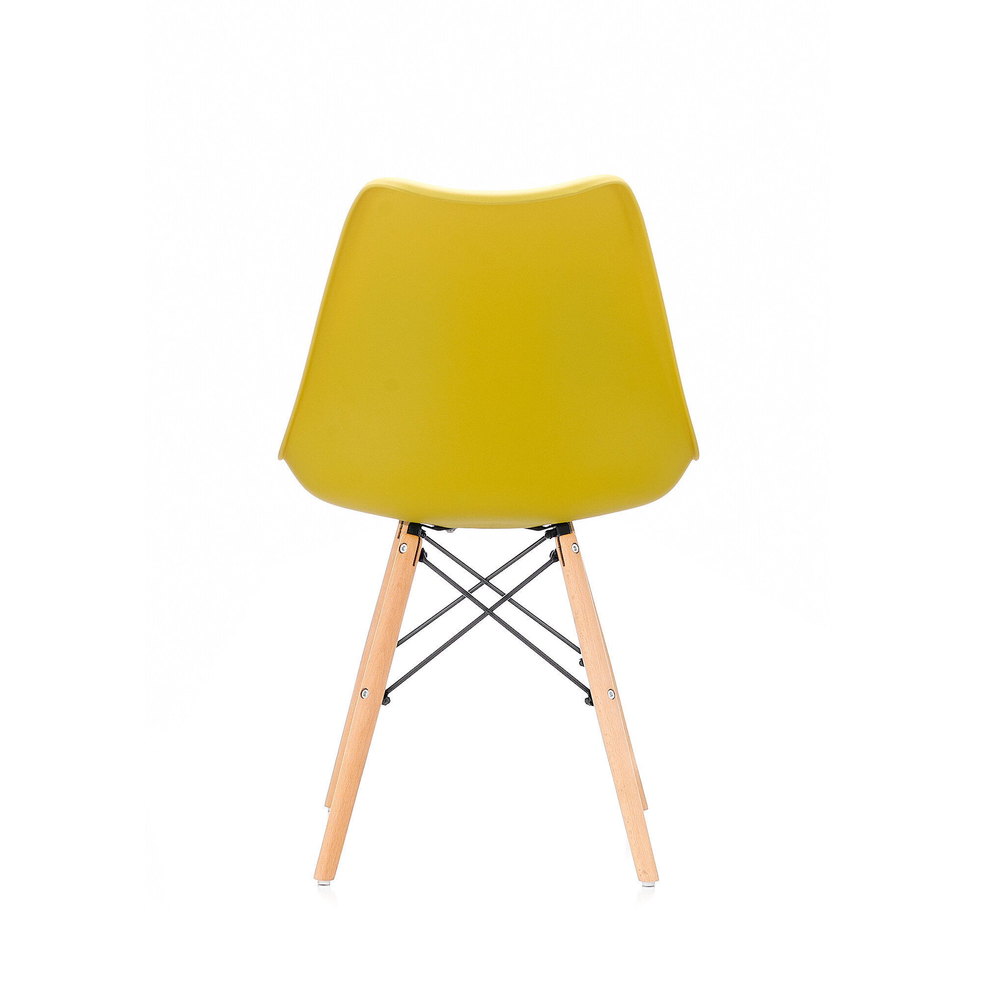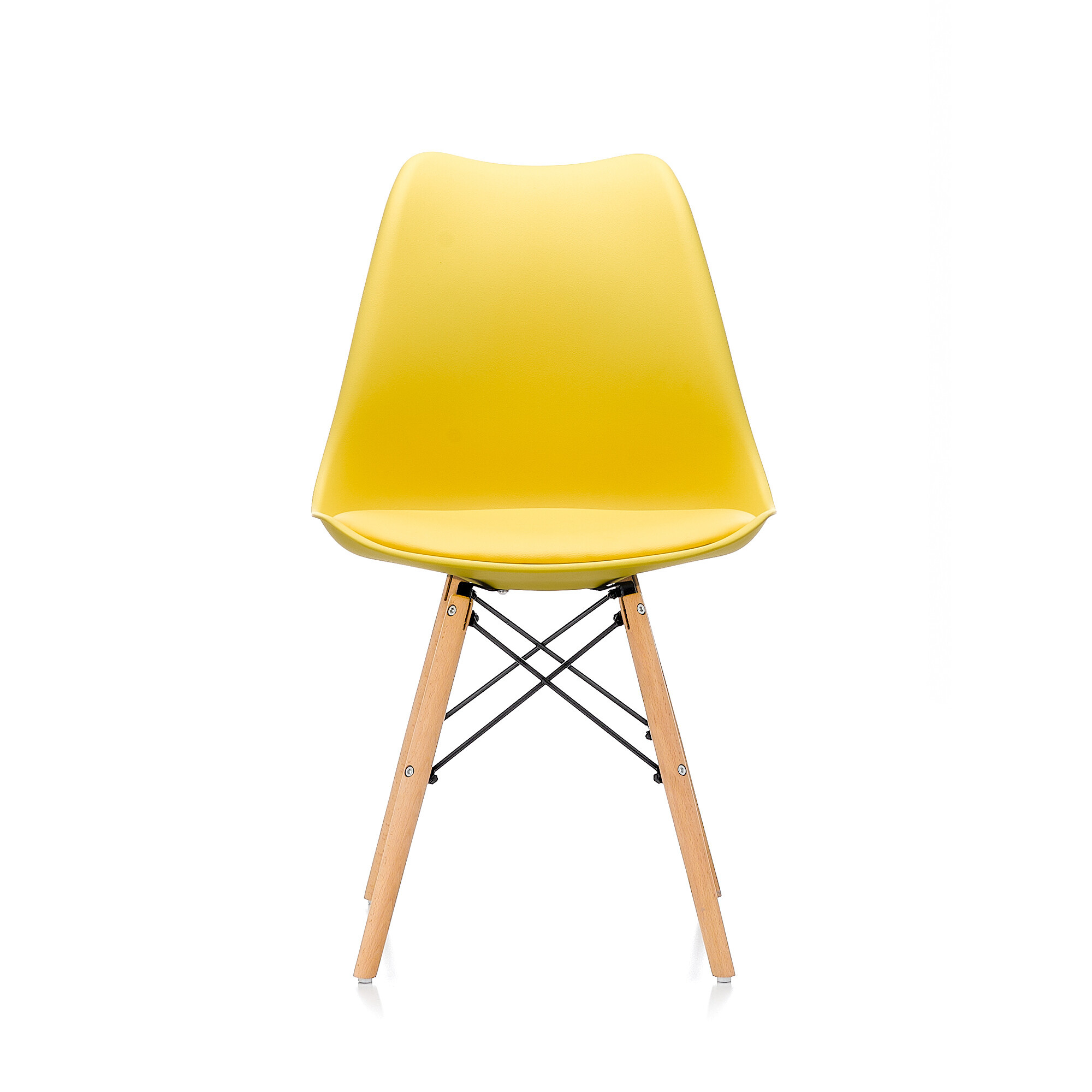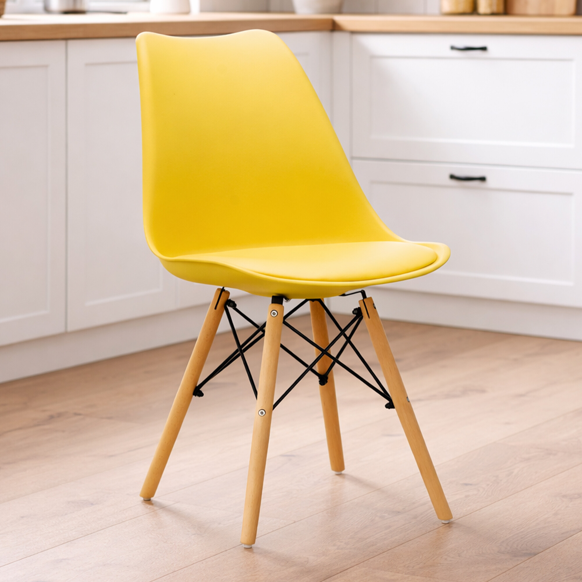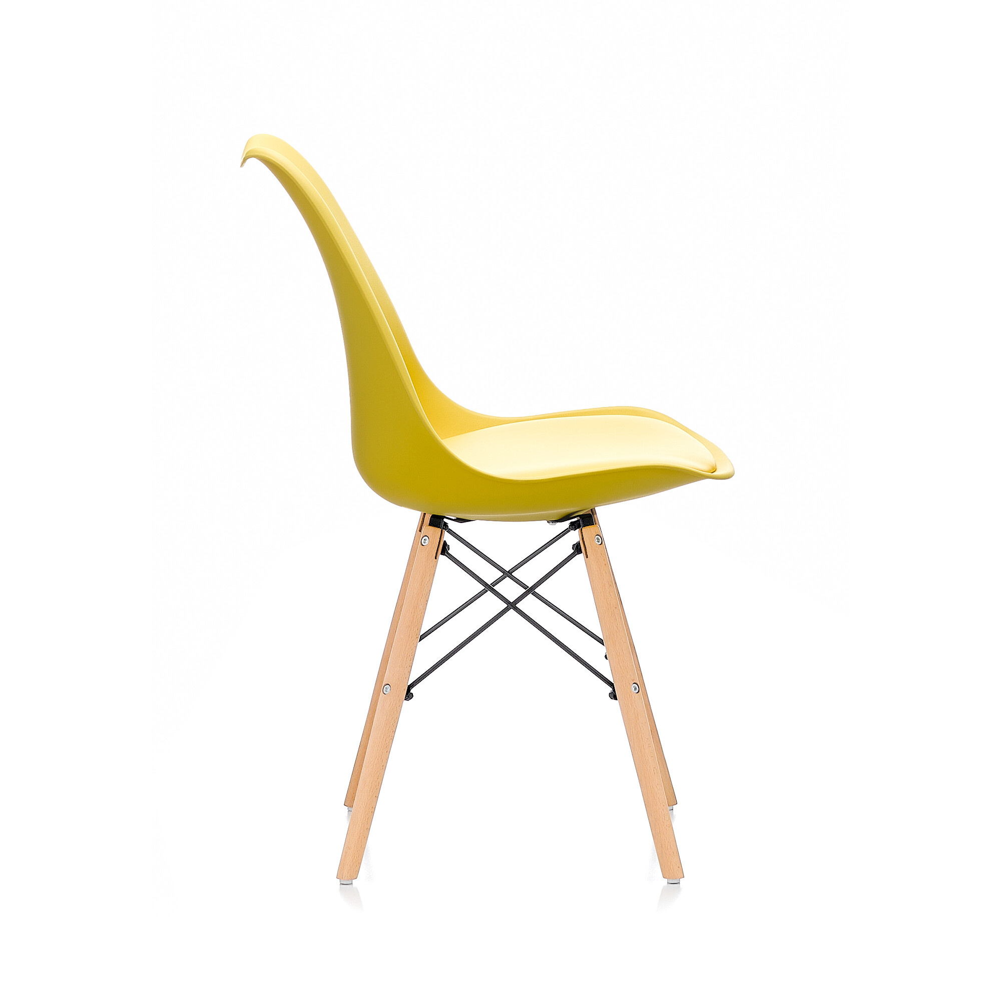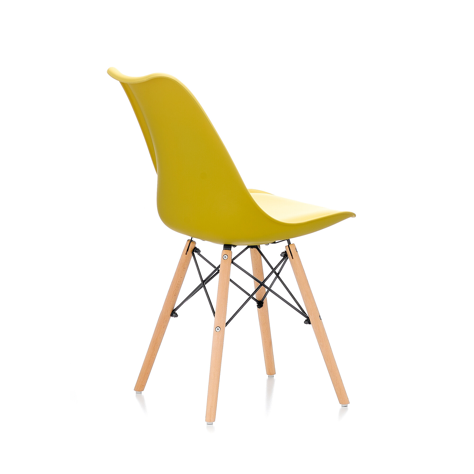 Der Stuhl ist aus hochwertigem und strapazierfähigem Polypropylen mit einem Kissen aus Kunstlederbezug in Kombination mit einem Gestell aus Buchenholz gefertigt.