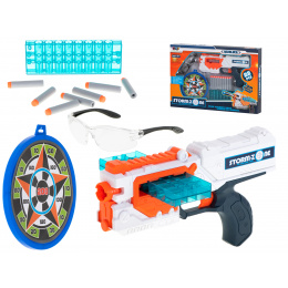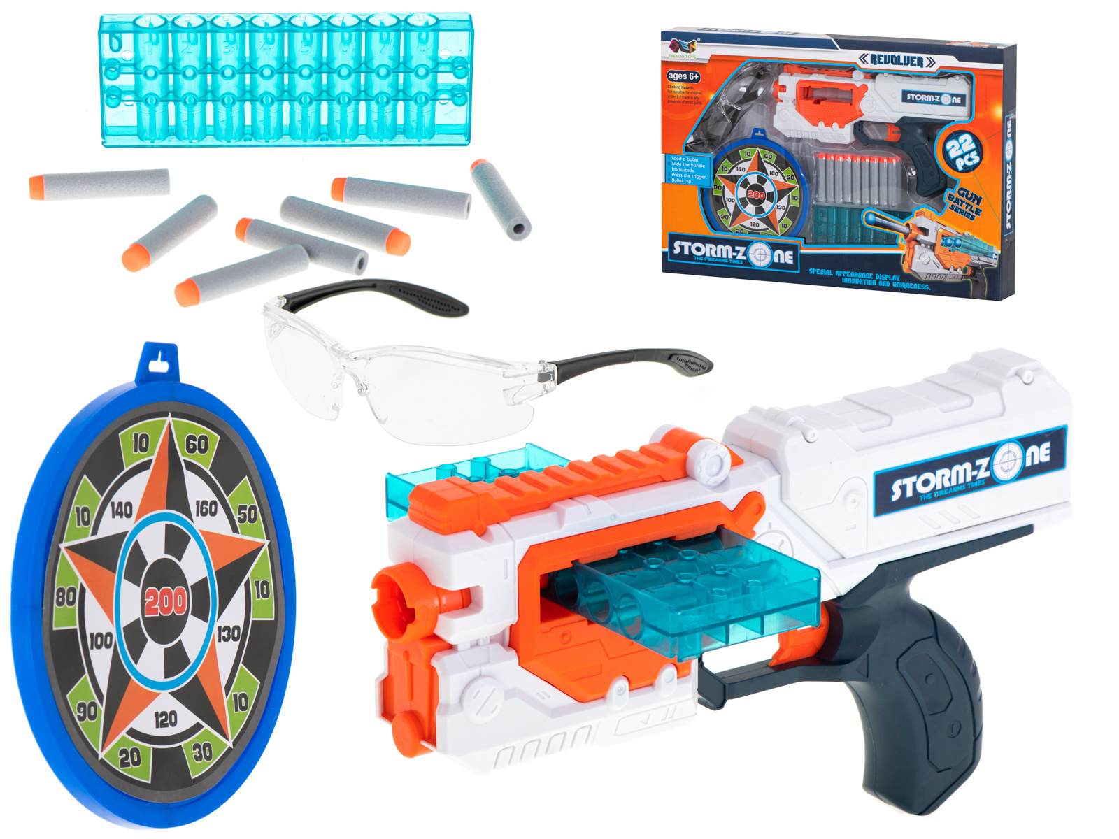 Neben der Pistole enthält das Set auch eine Zielscheibe, auf die man zielen und schießen muss, um sie zu treffen.