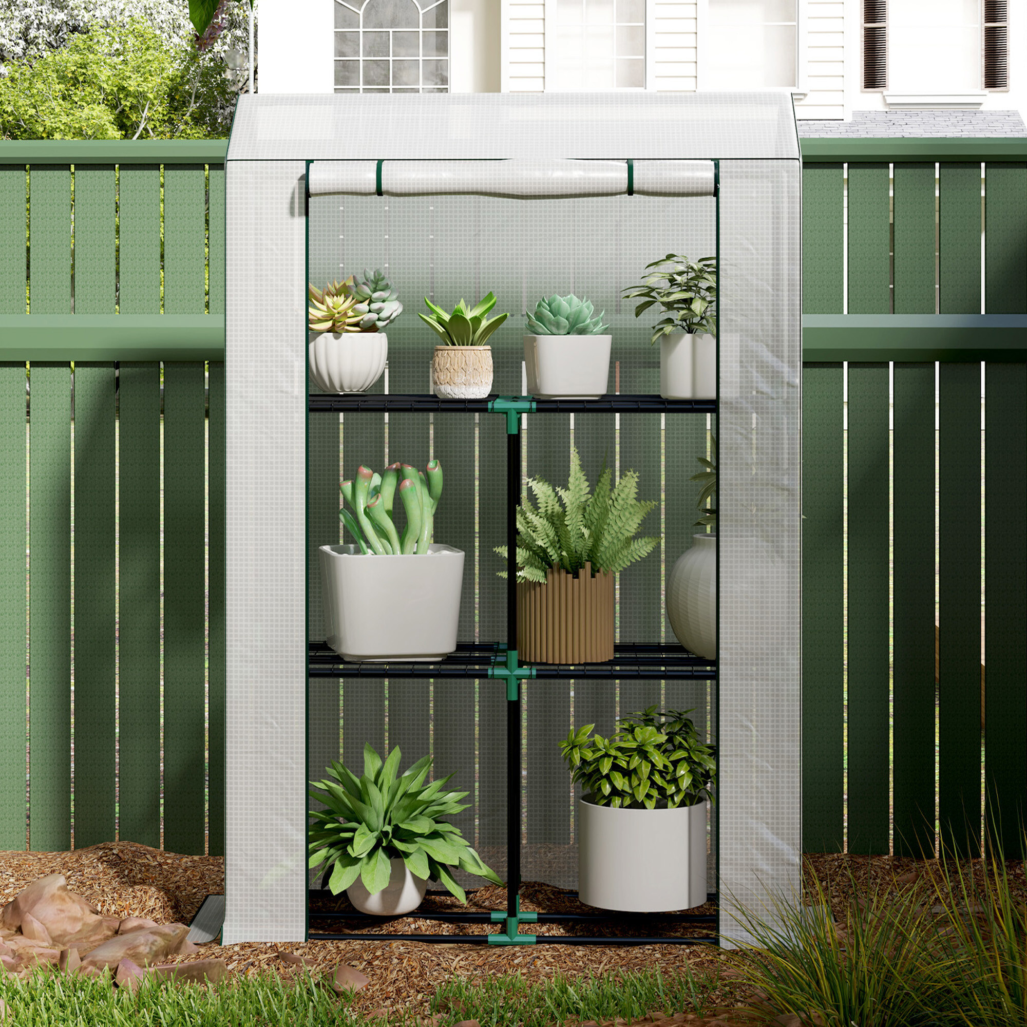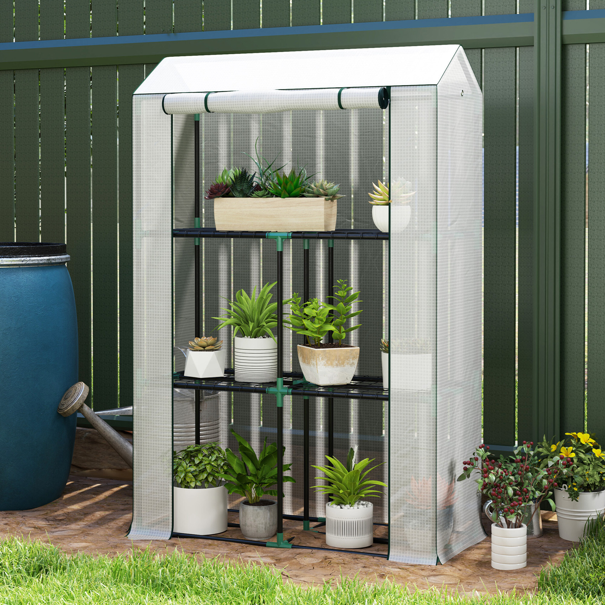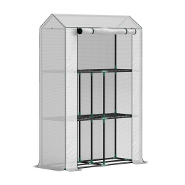 Das Foliengewächshaus ist mit drei Regalen ausgestattet und verfügt über eine Rolltür.