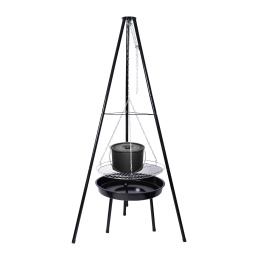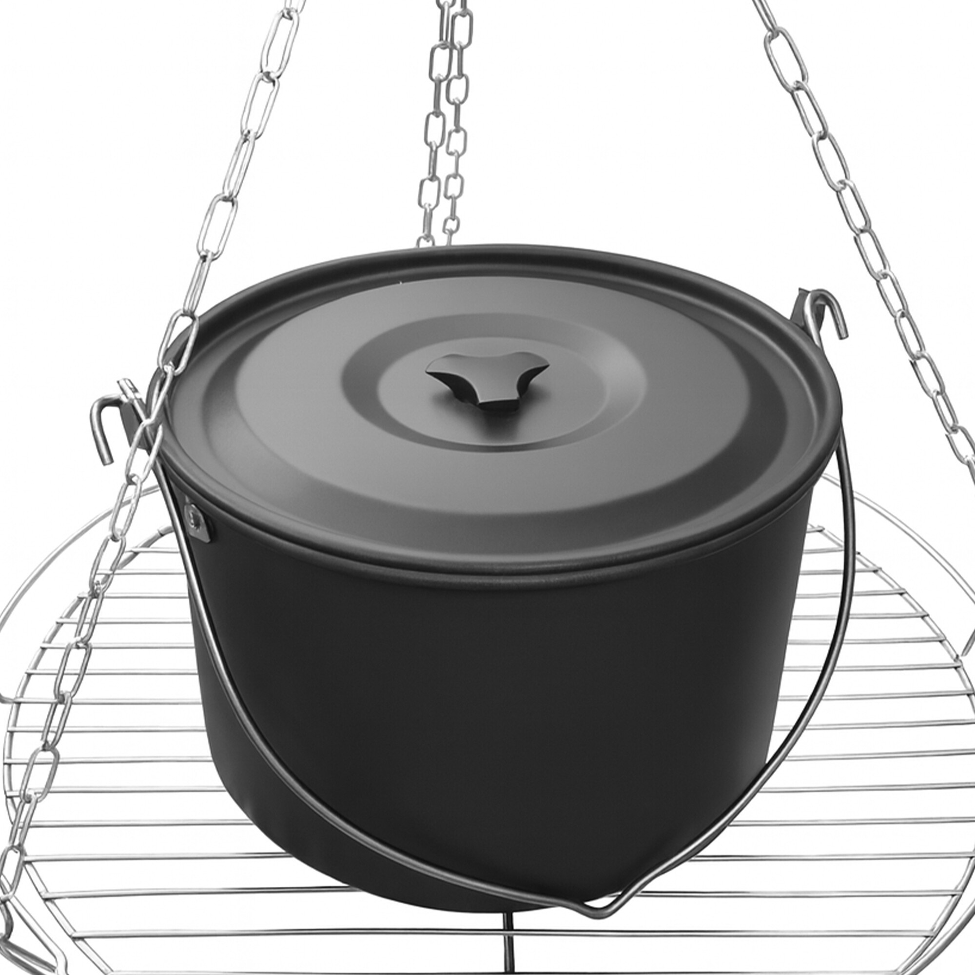 Höhenverstellbarer 3-in-1-Gartengrill vereint in einer Lösung Feuerstelle, hängenden Rost und Kessel. Dank des intelligenten Kettensystems können Sie die Höhe des Rosts oder des Kessels je nach Intensität des Feuers leicht wählen, das Fleisch wird nie wieder verbrannt und der Gulasch wird genau so schmecken, wie er soll.