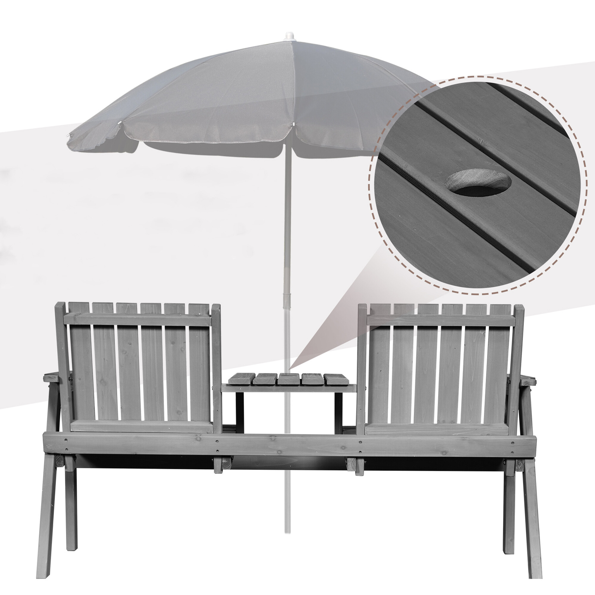 In der Mitte des Tischchens befindet sich auch eine Öffnung für einen Sonnenschirm mit einem Durchmesser von 5 cm.Die Rückenlehnen und Armlehnen der Sessel sorgen für ein angenehmes Sitzen und Entspannen.