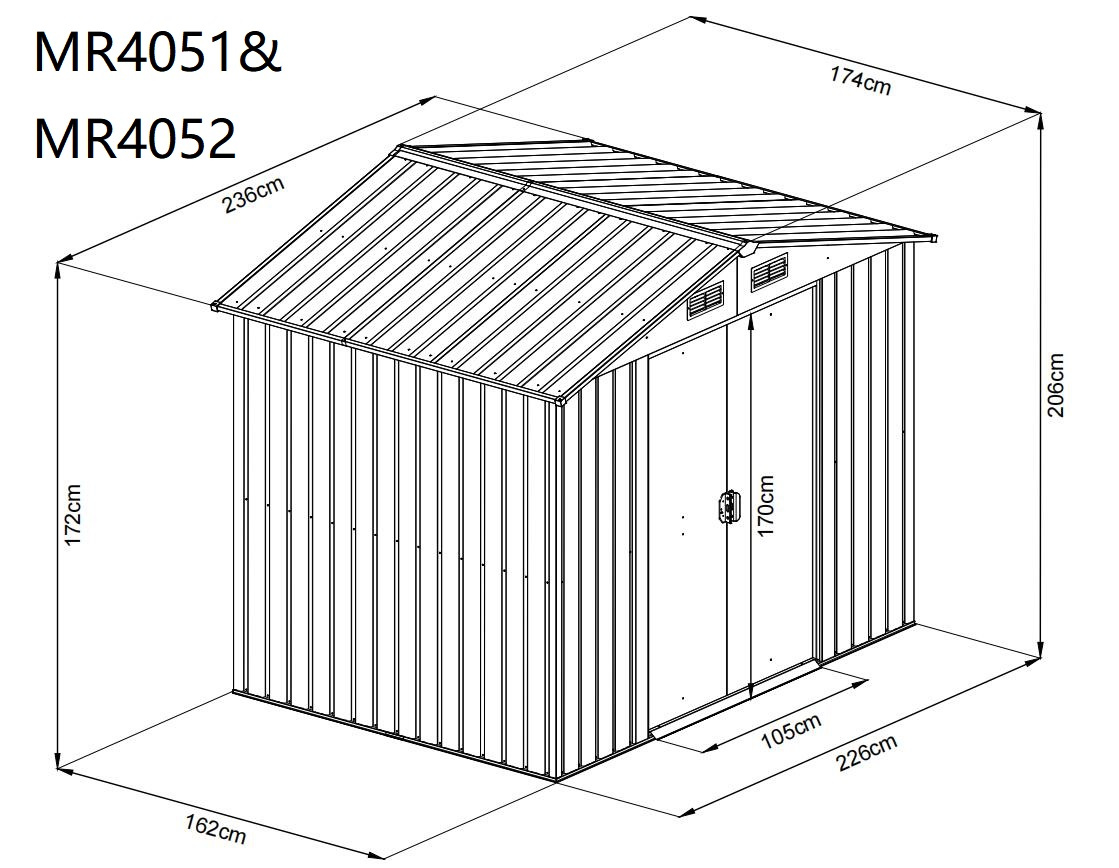 Das Gartenhaus hat doppelte Schiebetüren mit einer Breite von 105 cm und einer Höhe von 170 cm. Es sind auch Türgriffe vorhanden, mit denen das Haus mit einem normalen Vorhängeschloss verschlossen werden kann.