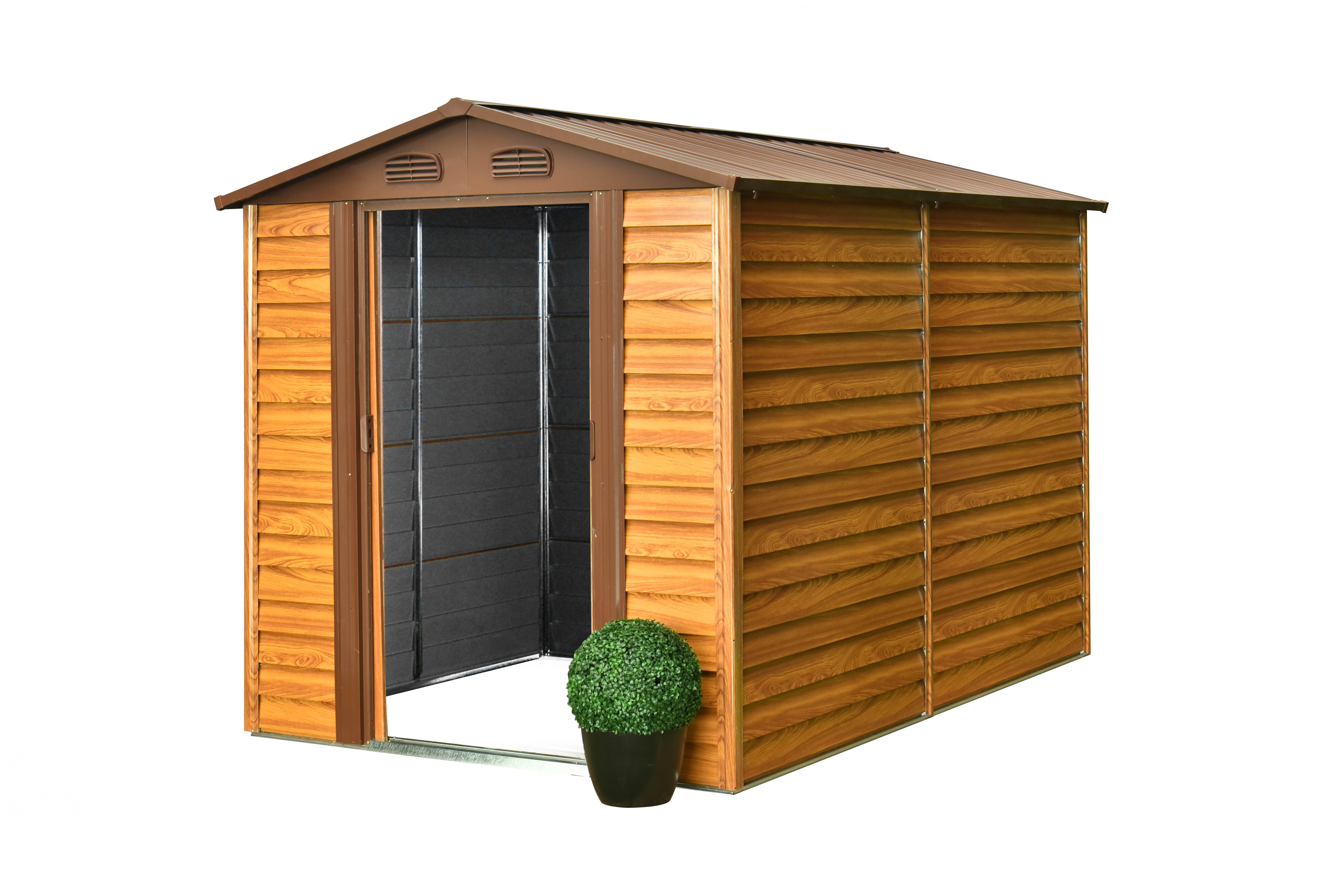 Der Gartenhaus hat doppelte Schiebetüren mit einer Breite von 105 cm und einer Höhe von 171 cm. Zum Lieferumfang gehören auch Türgriffe, mit denen das Haus mit einem herkömmlichen Vorhängeschloss verschlossen werden kann.