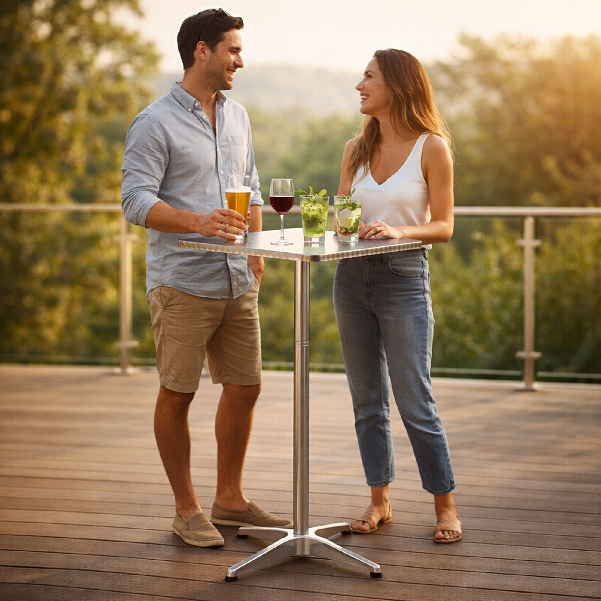 Gartentisch BISTRO mit stabilem Aluminiumrahmen und Edelstahlplatte im modernen Design, geeignet für Gärten, Terrassen, Cafés, Pavillons, Balkone oder Strände.
