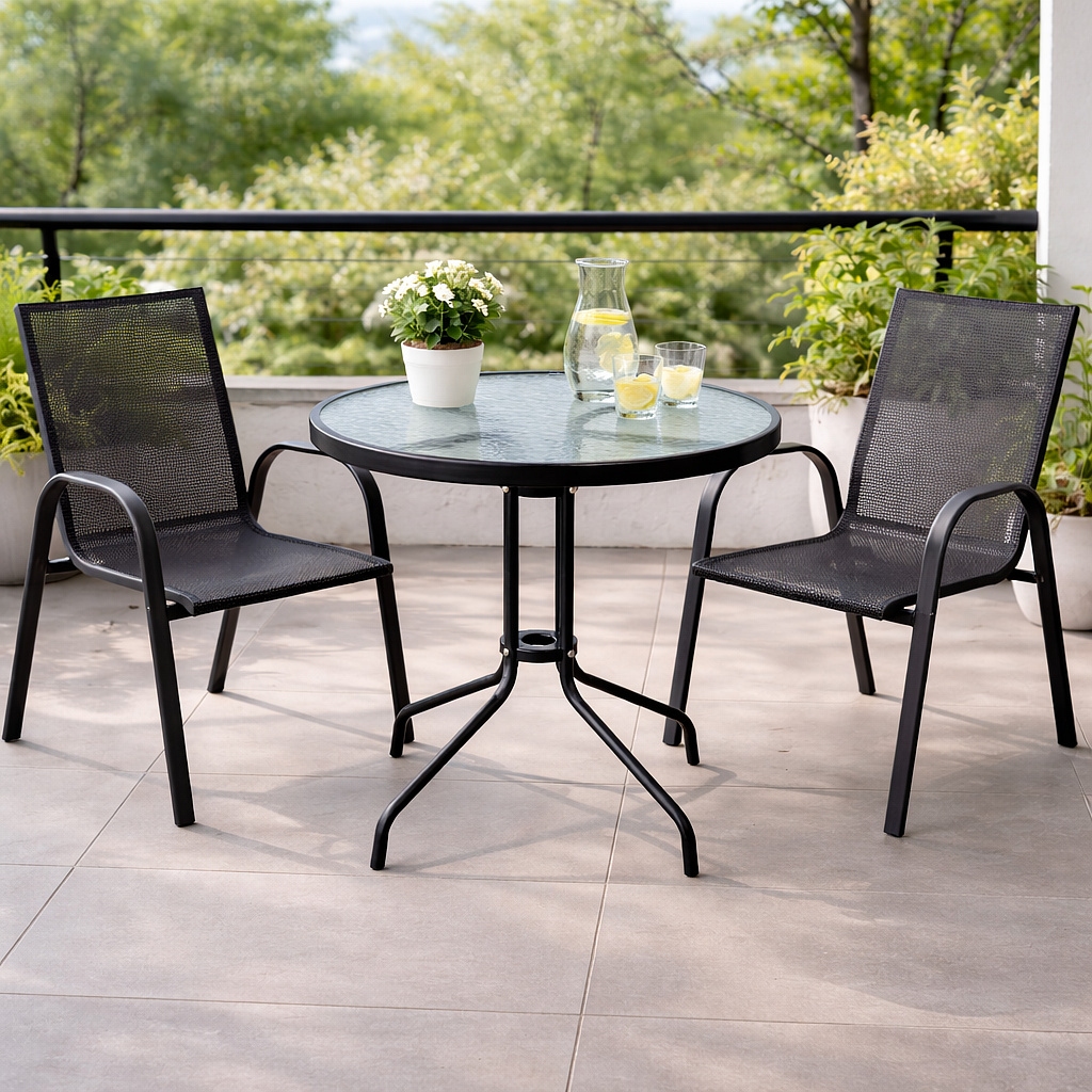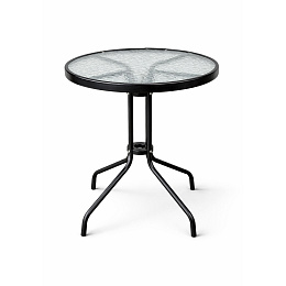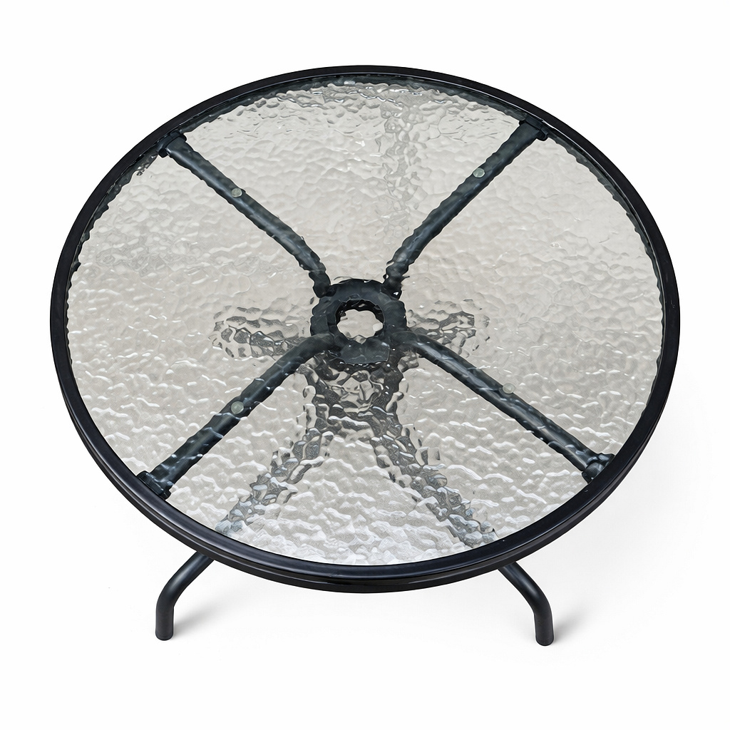 Runder Gartentisch mit stabilem Metallrahmen und strukturierter Glasplatte, geeignet für Gärten, Terrassen, Cafés, Pavillons, Balkone.