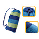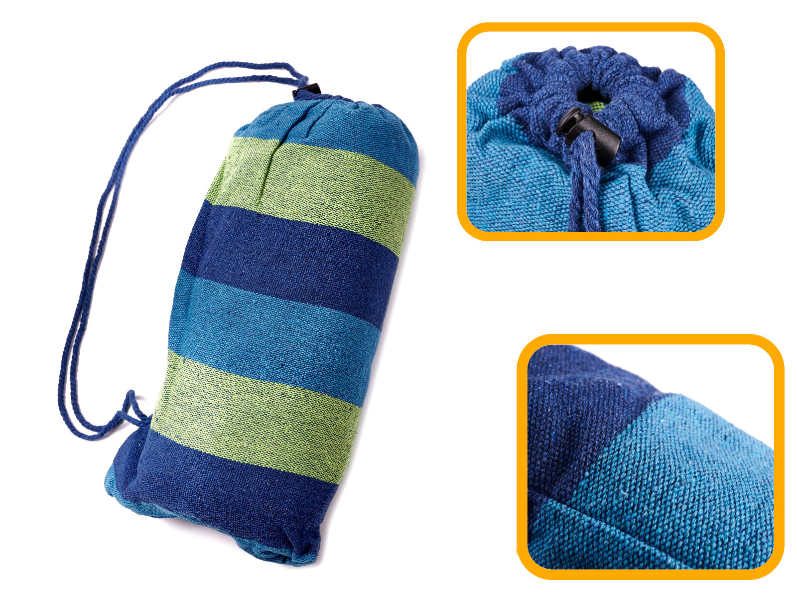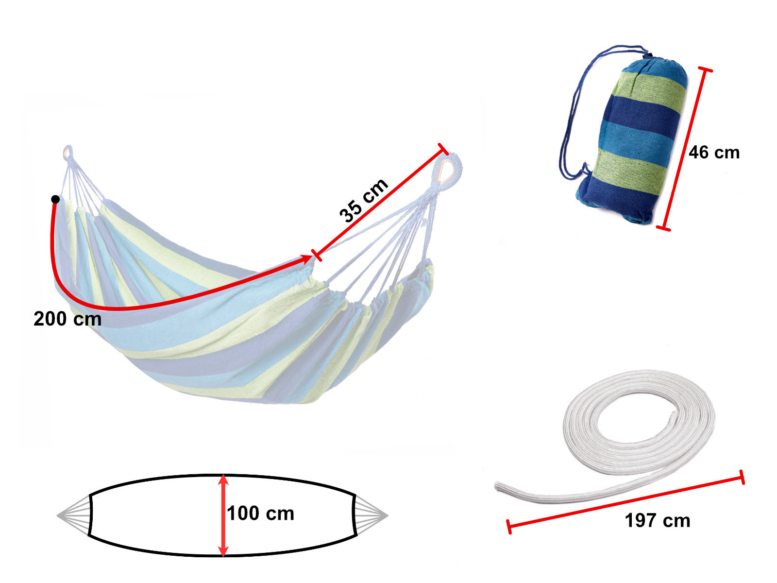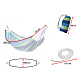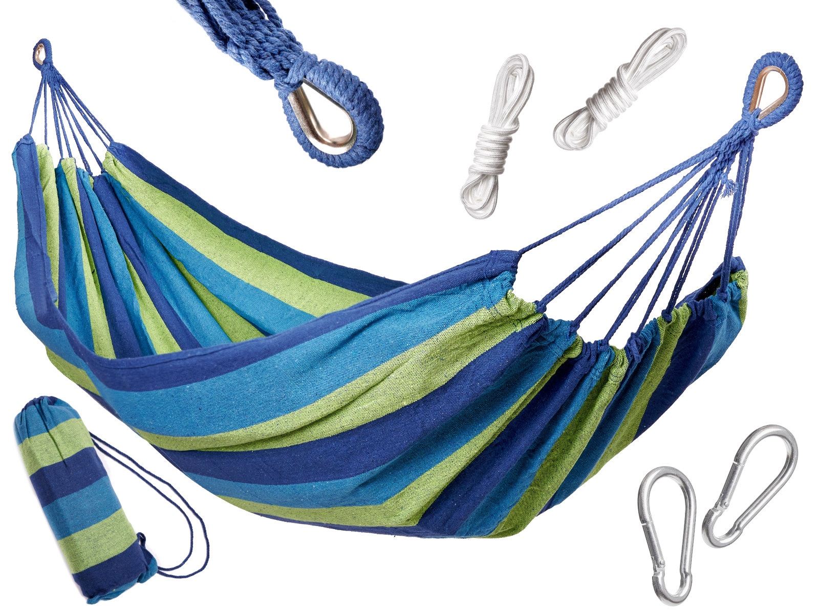 Gestrickte Hängematte für eine Person mit Montagesatz. Es hat Holzstangen, starke Seile und mit Metallkarabinern verstärkte Schlaufen. Inklusive: Hängematte, 2 Seile, 2 Karabinerhaken. Maximale Belastung: bis zu 150 kg. Farbe: blau-grün. Abmessungen: 200x100 cm.