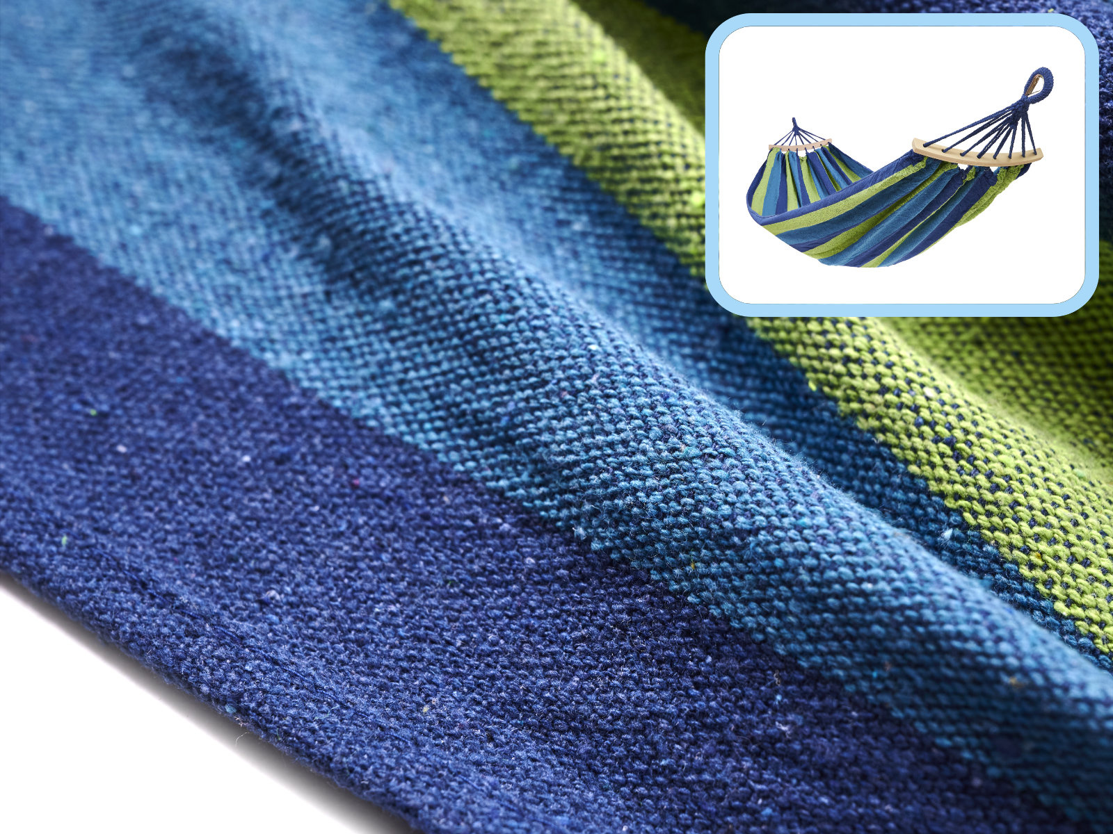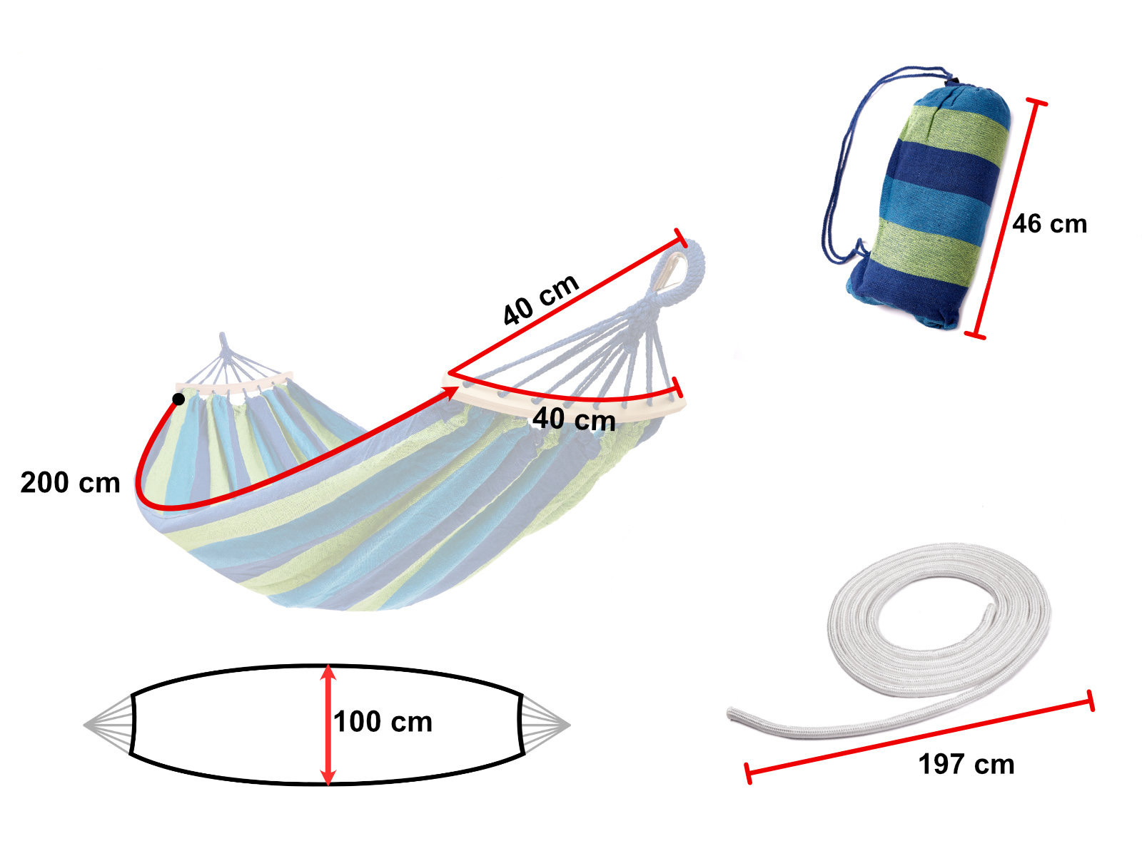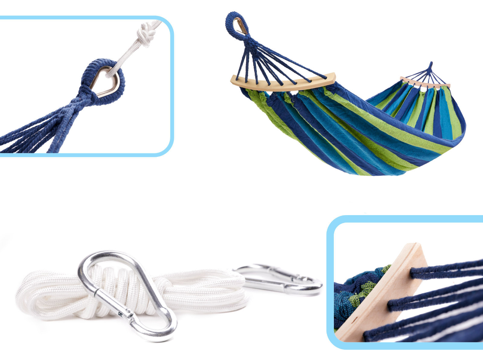 Gestrickte Hängematte für eine Person mit Montagesatz. Es hat Holzstangen, starke Seile und mit Metallkarabinern verstärkte Schlaufen. Inklusive: Hängematte, 2 Seile, 2 Karabinerhaken. Maximale Belastung: bis zu 150 kg. Farbe: blau-grün. Abmessungen: 200x100 cm.