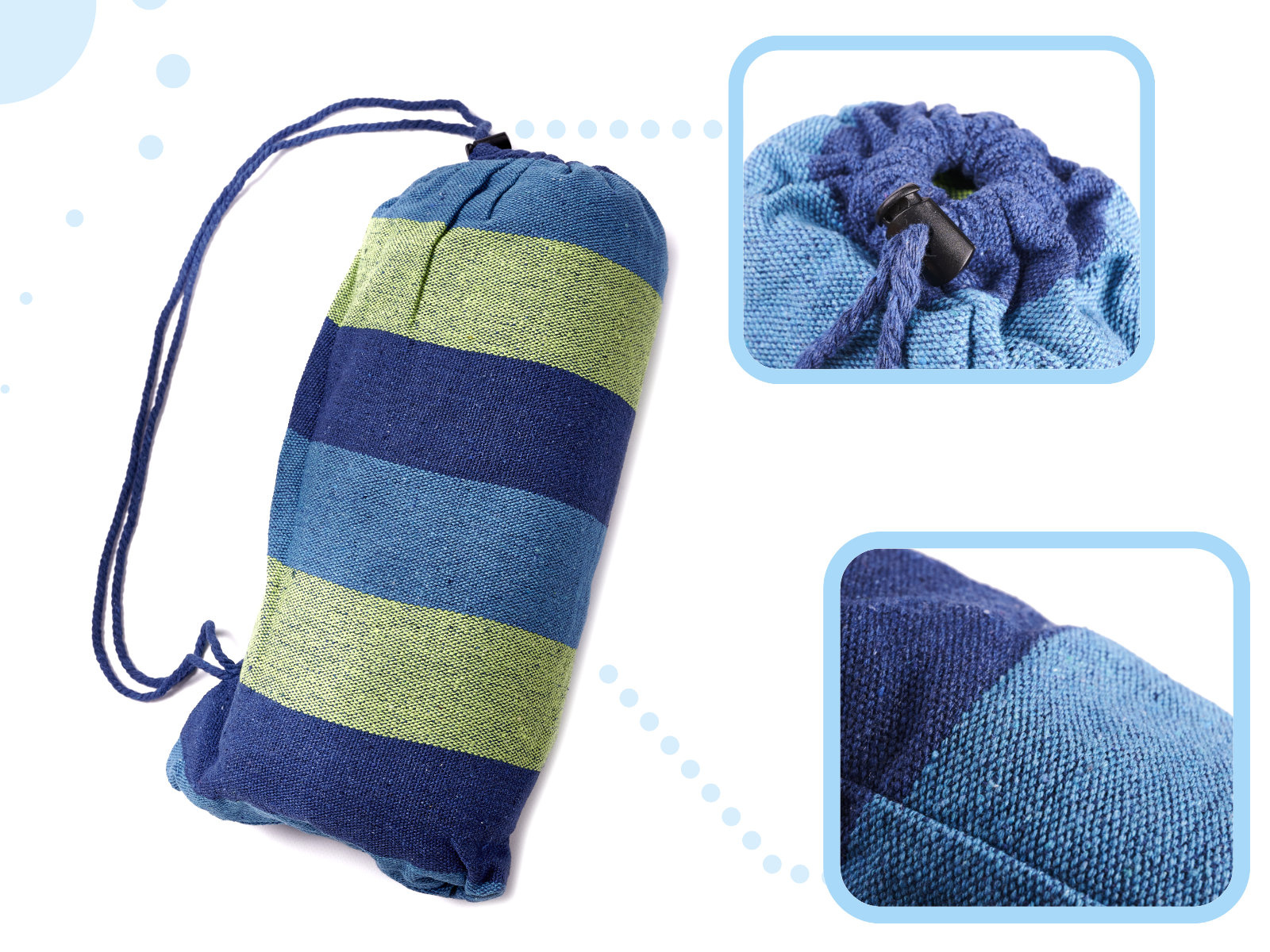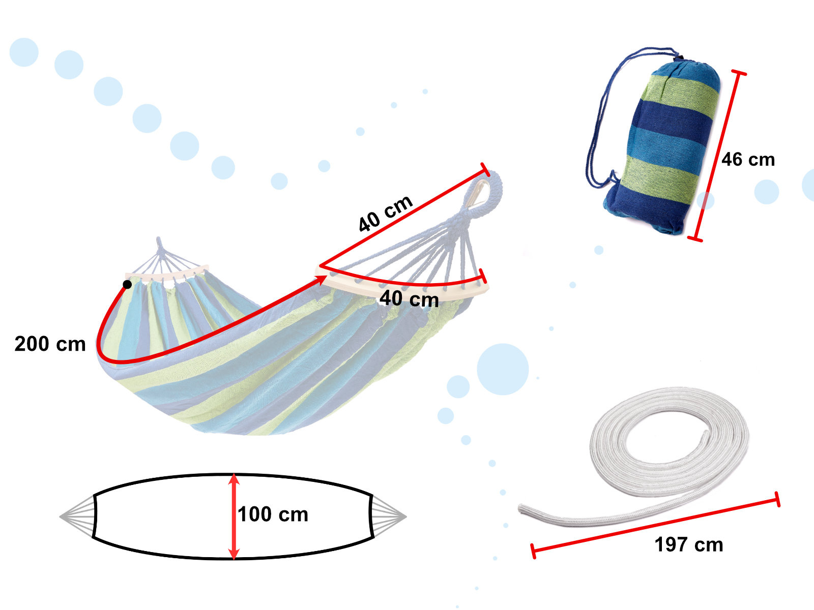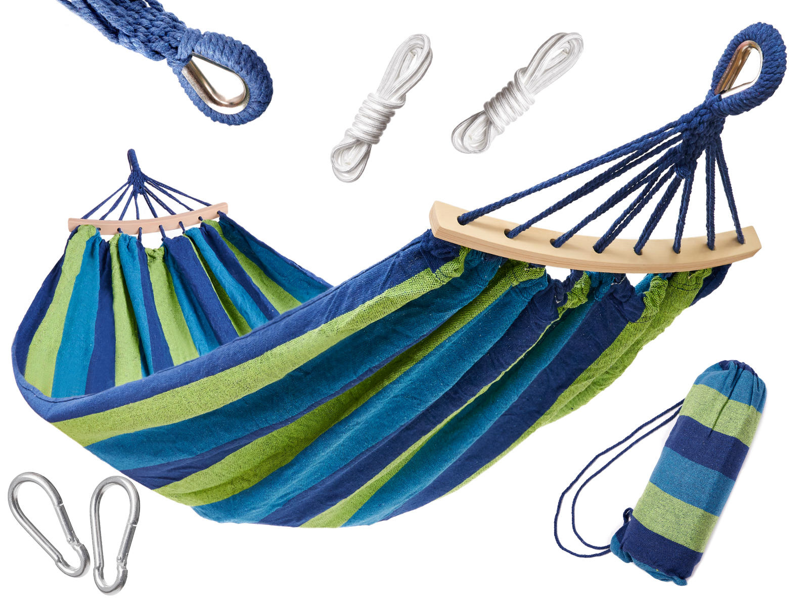 Gestrickte Hängematte für eine Person mit Montagesatz. Es hat Holzstangen, starke Seile und mit Metallkarabinern verstärkte Schlaufen. Inklusive: Hängematte, 2 Seile, 2 Karabinerhaken. Maximale Belastung: bis zu 150 kg. Farbe: blau-grün. Abmessungen: 200x100 cm.