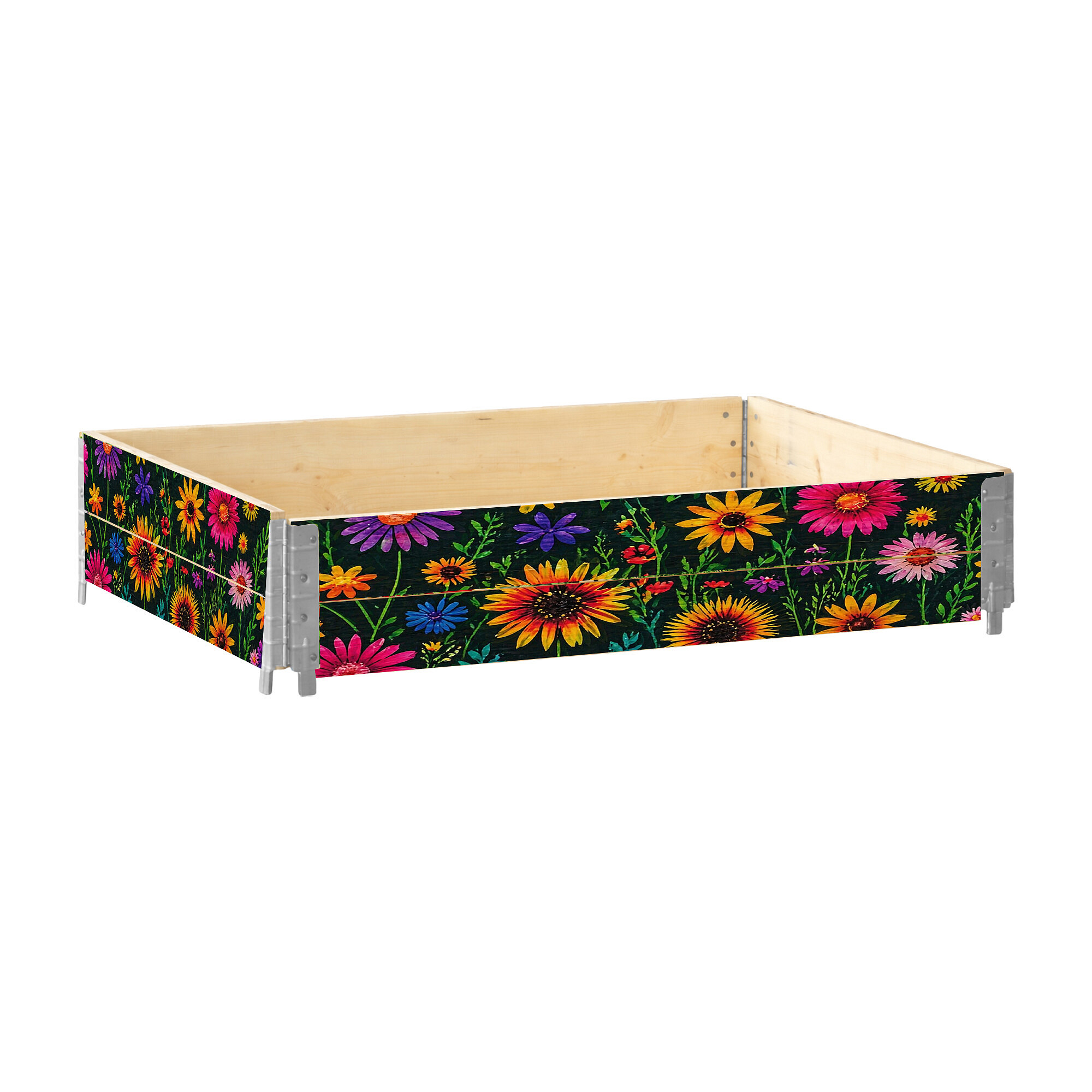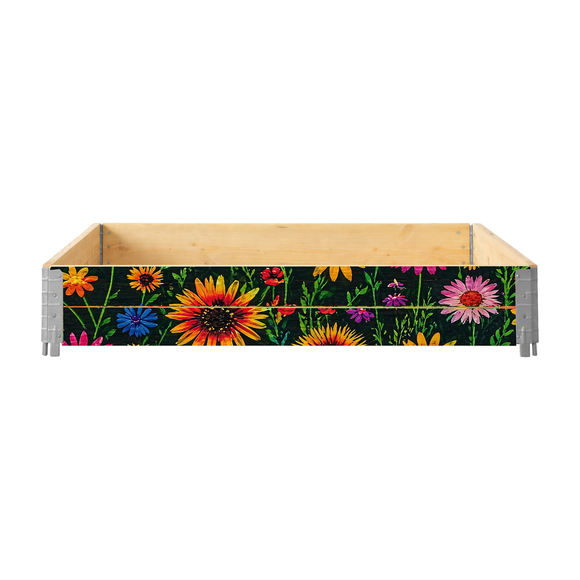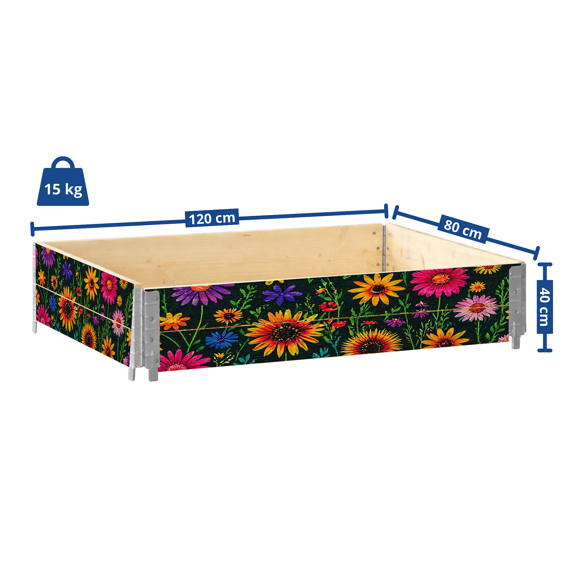 Das Beet ist aus Kiefernholz mit IPPC-Zertifizierung gefertigt. Die Außenseite ist mit Blumenmotiven versehen, die das Gartenambiente betonen und sich gut in die Außenumgebung einfügen. Die Abmessung 120 × 80 cm bietet ausreichend Platz für den Anbau von gängigen Gemüsesorten, Kräutern, Erdbeeren und Blumen zu Hause. Die Höhe von 40 cm ermöglicht es, eine Erdschicht zu schaffen, die für verschiedene Arten von Bepflanzung geeignet ist.