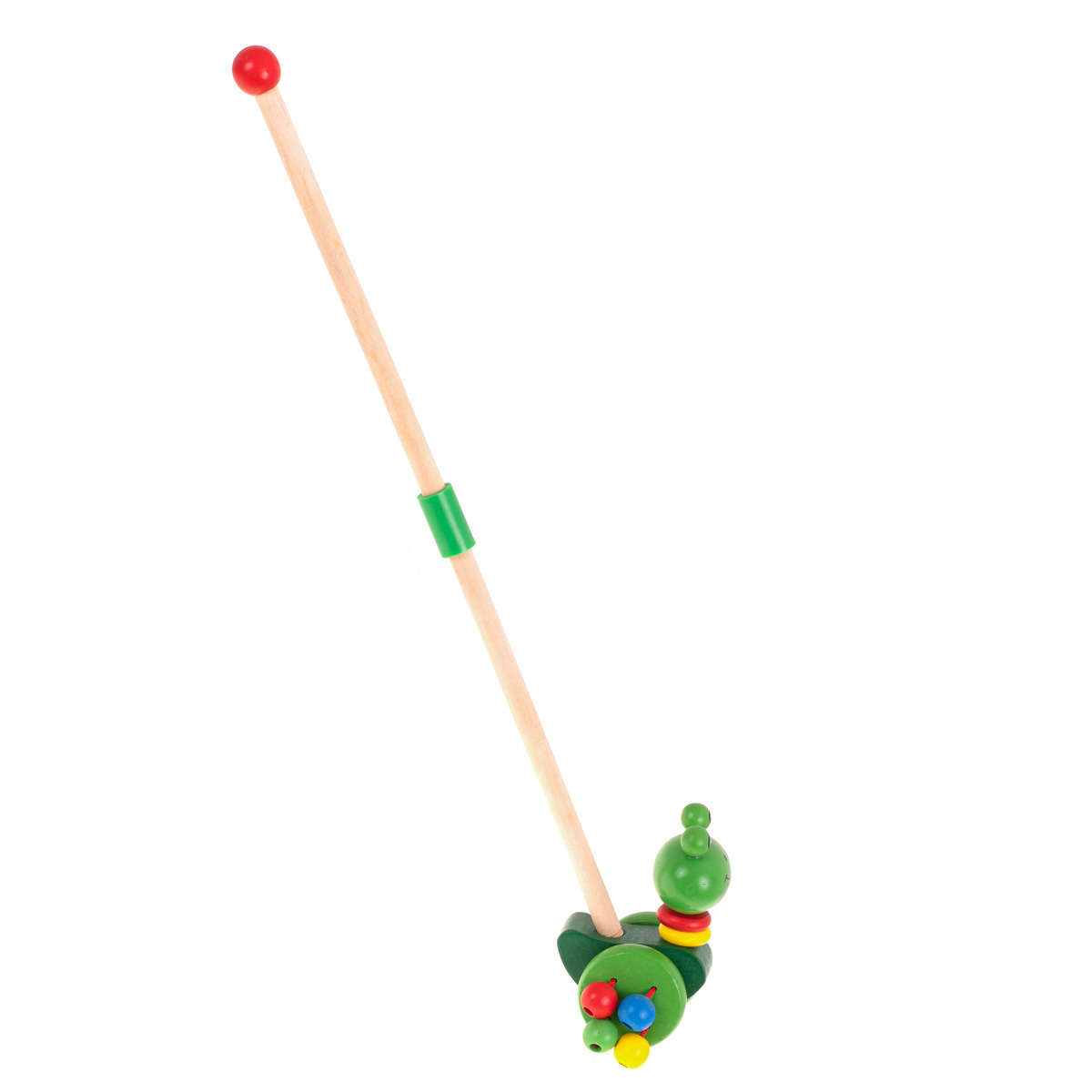 - An den Rädern sind vier bunte Perlen befestigt, die beim Fahren klappern.