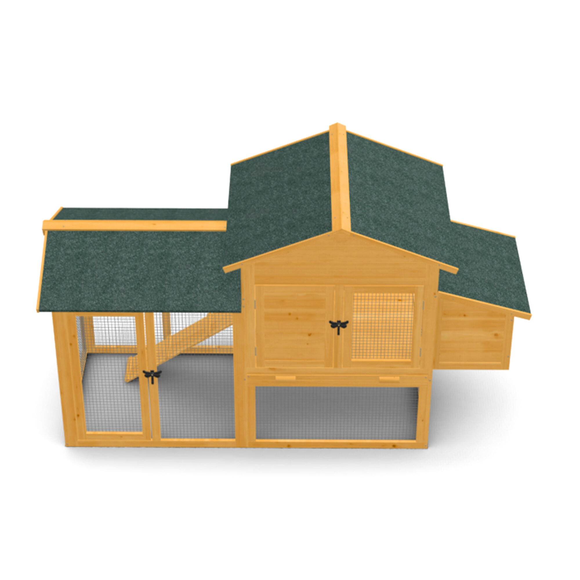 Das Dach ist mit einer hochwertigen Schindelabdeckung versehen, die die Hühner vor Regen und Schnee schützt. Eine Rampe führt vom unteren in das obere Stockwerk, auf der die Tiere leicht nach oben klettern können. Die Türchen können einfach geschlossen und mit Schieberiegeln gesichert werden.Ein Hauptvorteil dieses Hühnerstalls ist das klappbare Dach, das einen einfachen Zugang zu den Eiern ermöglicht.