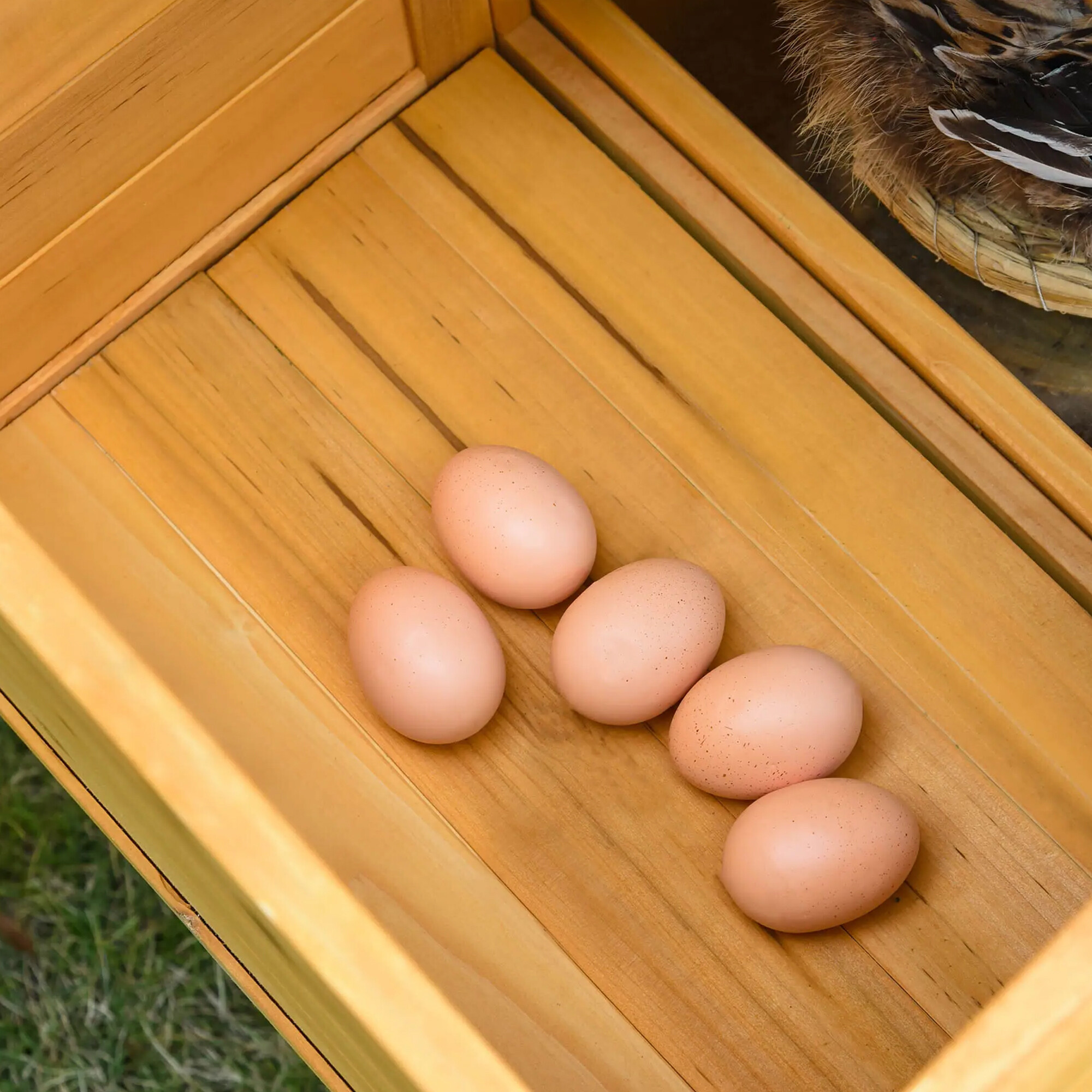 Kein kompliziertes Bücken und Strecken mehr, einfach das Dach anheben und die Eier sind in Reichweite.Der Hühnerstall ist mit einer seitlichen Nistbox ausgestattet, die den Hühnern einen ruhigen und sicheren Ort zum Eierlegen bietet.