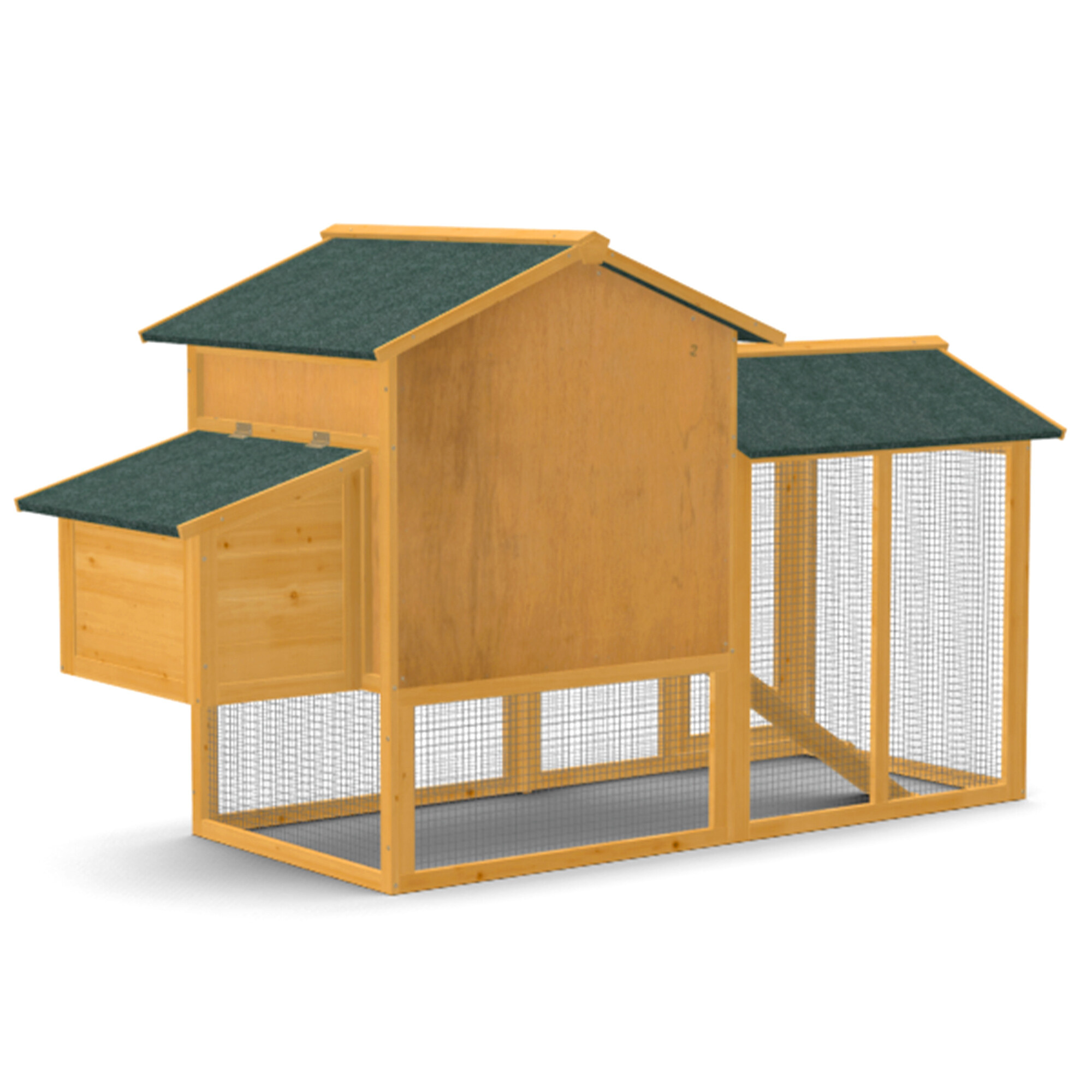 Dank dessen ist der Hühnerstall stabil und langfristig widerstandsfähig gegen äußere Einflüsse. Die Konstruktion ist so gestaltet, dass sie den Hühnern ausreichend Platz bietet und gleichzeitig für die Züchter leicht zugänglich ist.Der an den Wohnbereich angeschlossene Auslauf ermöglicht den Hühnern freie Bewegung.