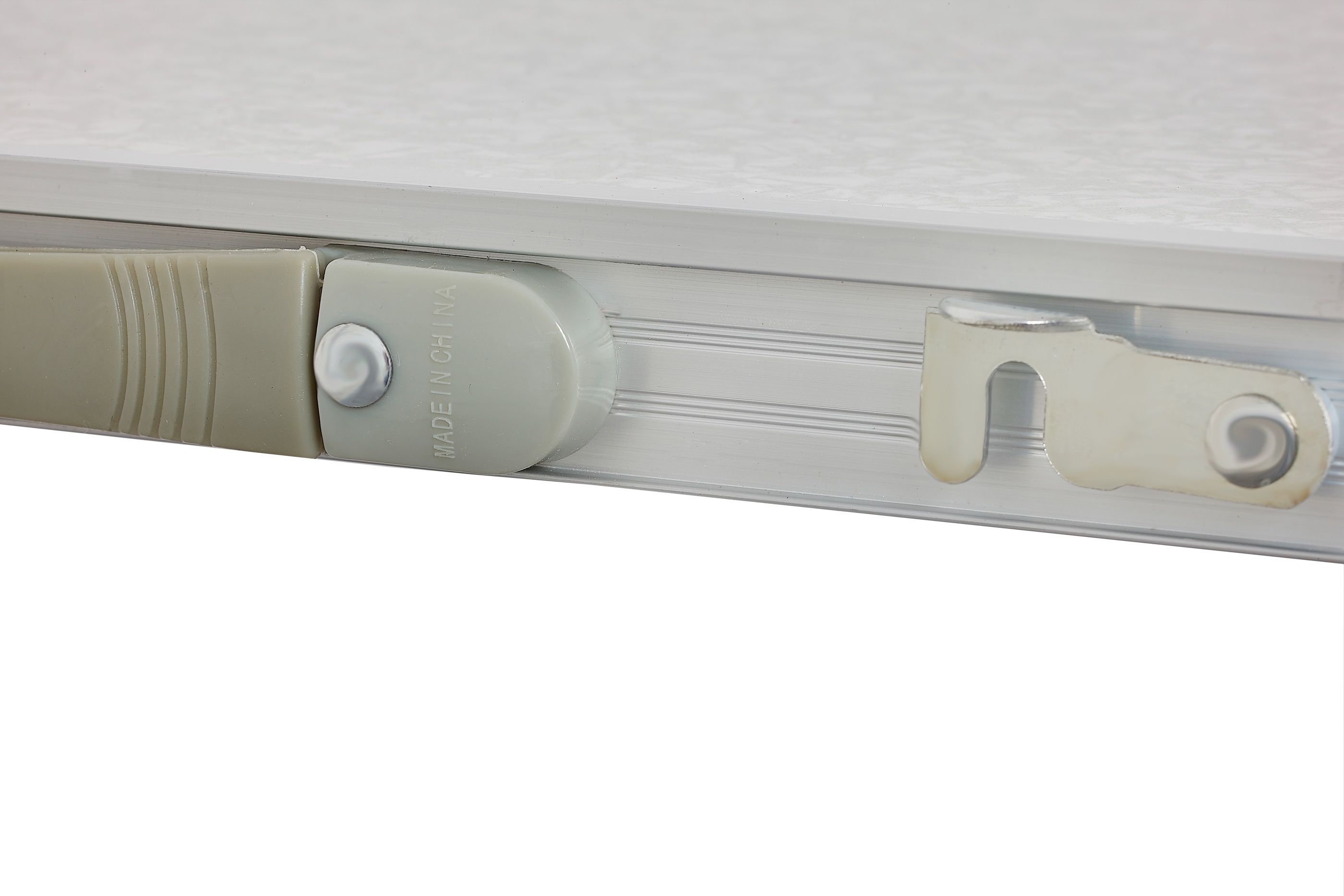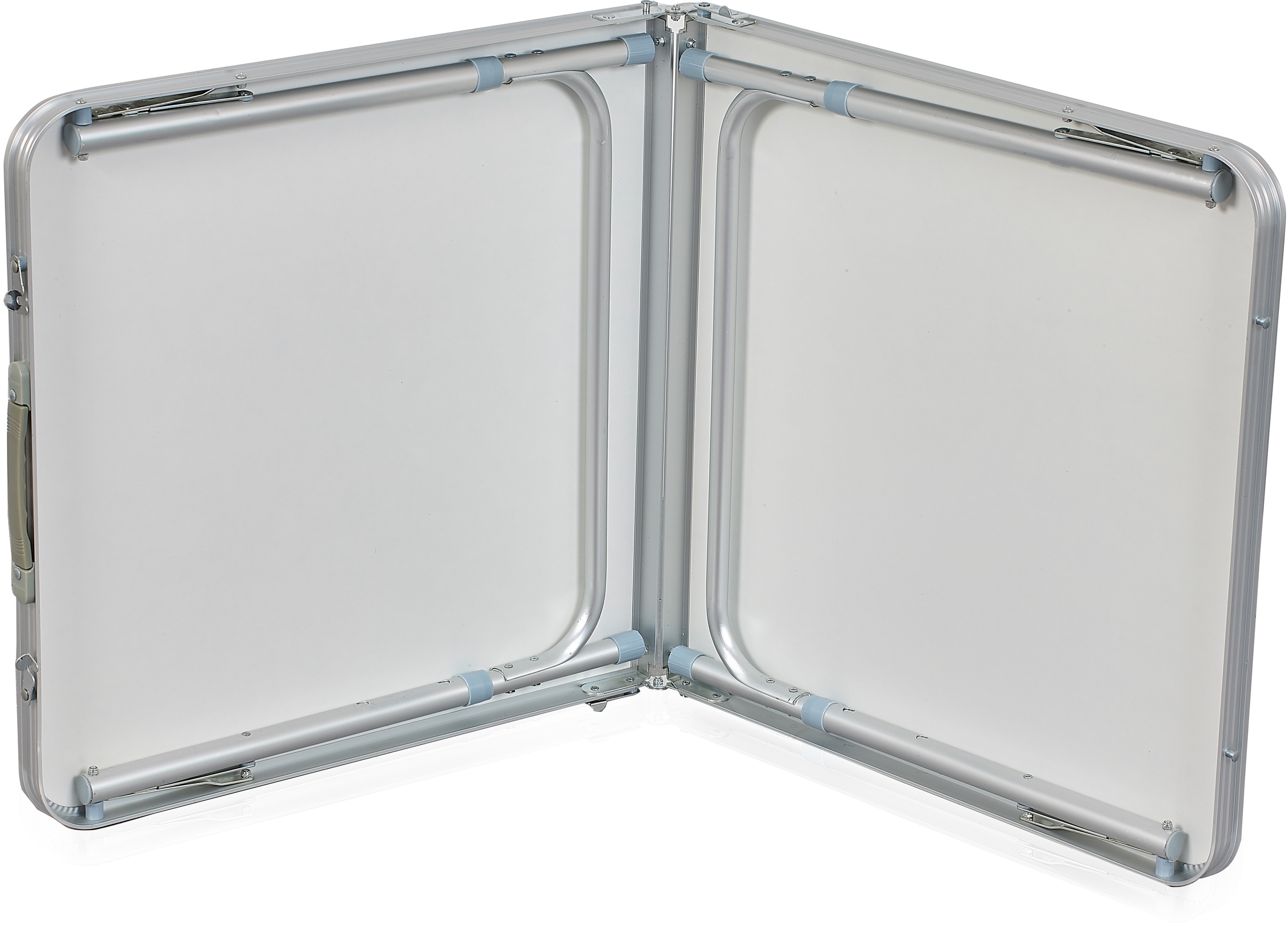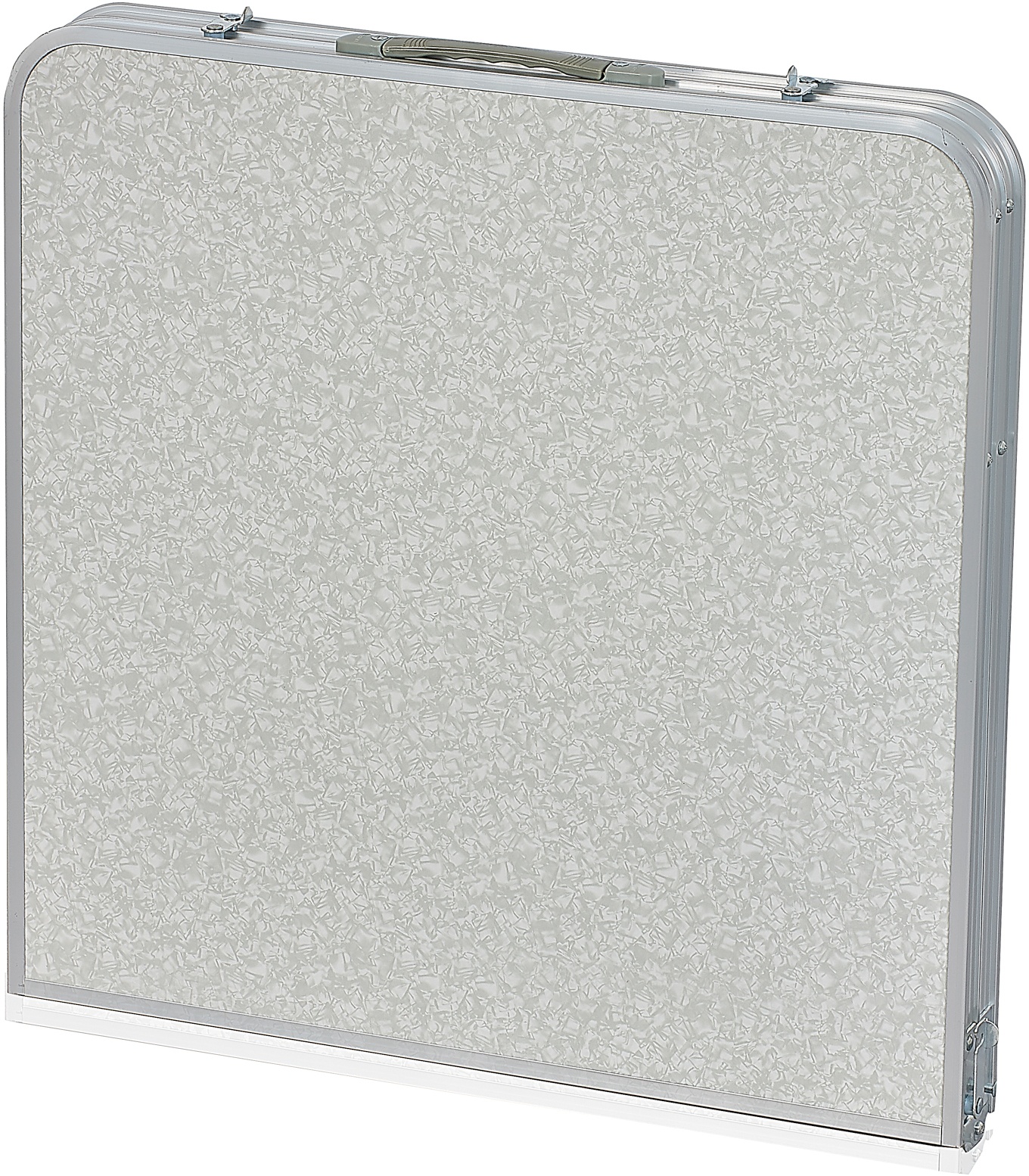 - Zusammengeklappt ist der Tisch in Form einer flachen Platte mit Griff leicht tragbar