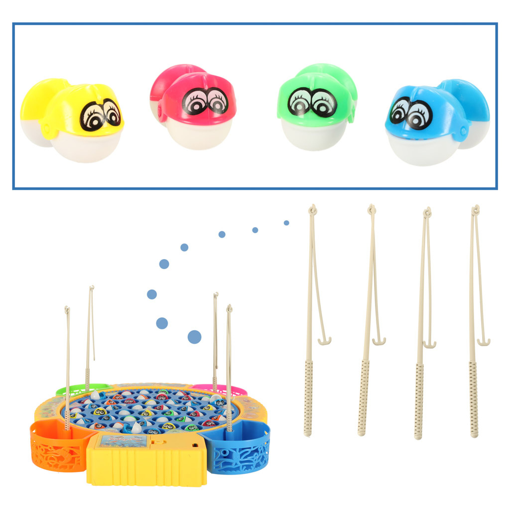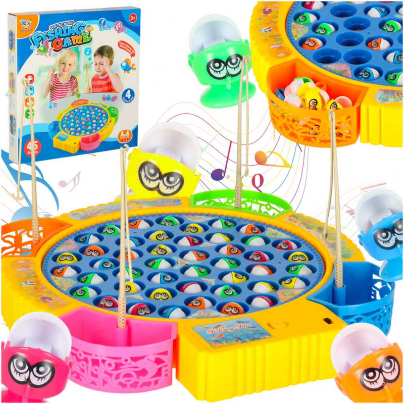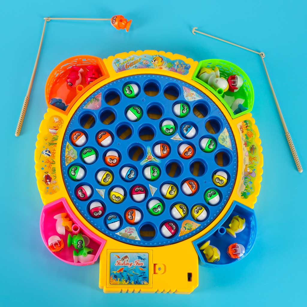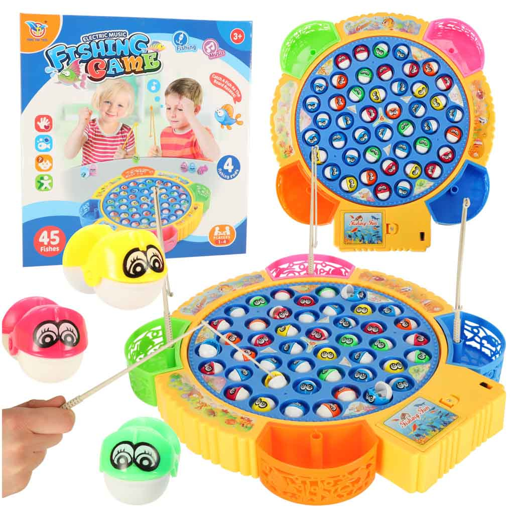 - Der Gewinner ist derjenige, der die meisten Fische an der schwimmenden Rute fängt, die sich um die Plattform dreht.