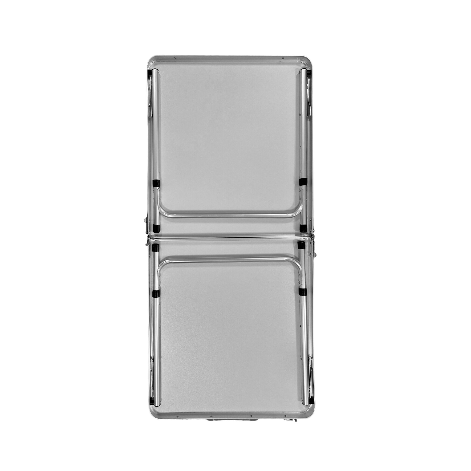 Der Campingtisch kann zu einem kleinen Koffer zusammengeklappt werden.Ein Teil davon ist auch ein Griff, mit dem der zusammengeklappte Tisch leicht getragen werden kann.
