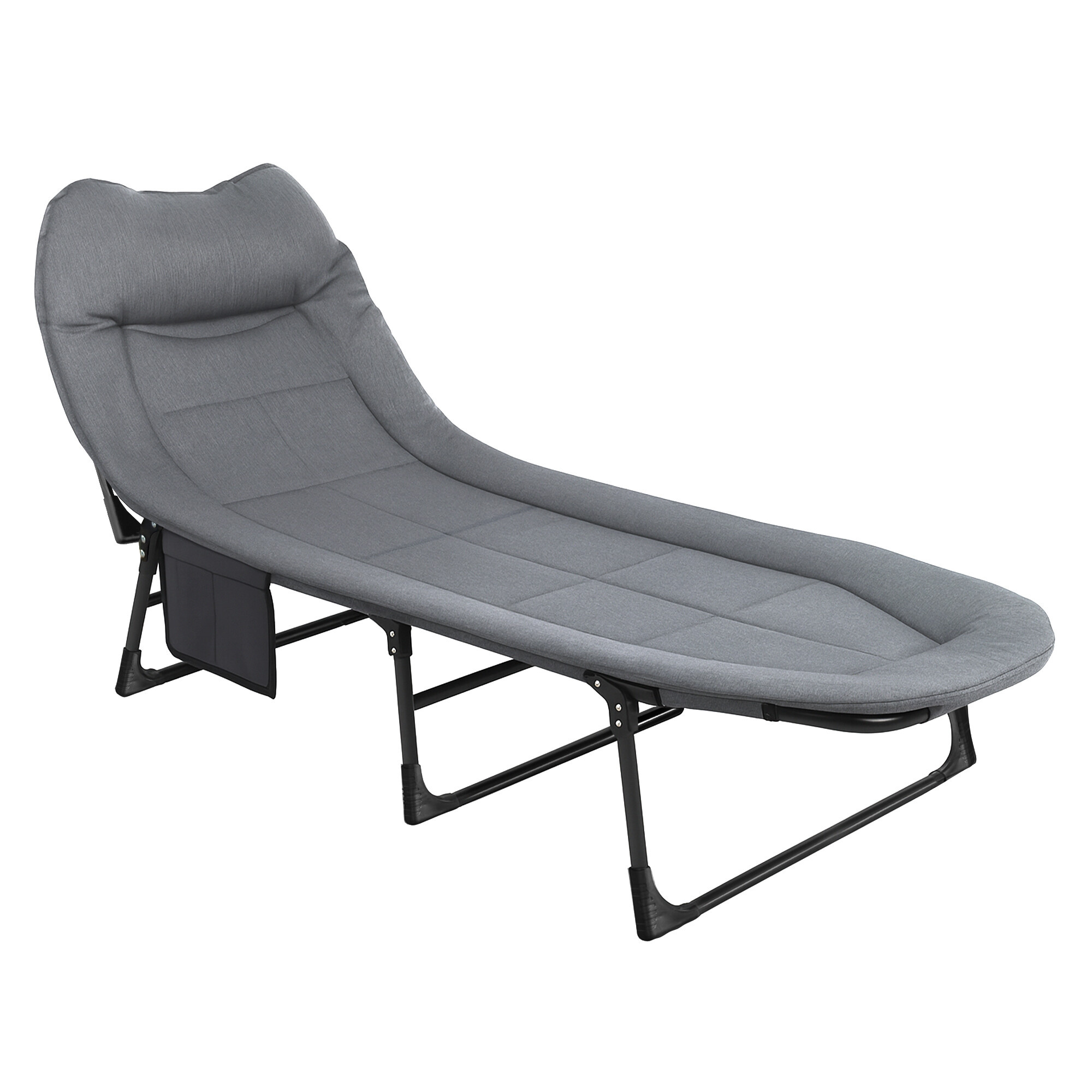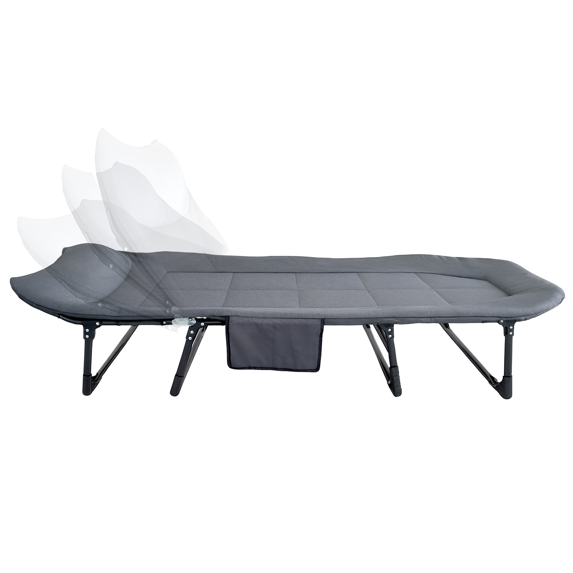 Die praktische verstellbare Rückenlehne ermöglicht es, die Position nach Bedarf zu wählen – egal, ob Sie sitzen, lesen oder einen bequemen Schlaf genießen möchten. Der Klappmechanismus ermöglicht ein schnelles Zusammenklappen und Auseinanderfalten, die kompakten Abmessungen im zusammengeklappten Zustand werden Sie beim Reisen und Lagern schätzen. Die Seitentasche für Kleinigkeiten, das Handy oder ein Buch fügt eine weitere Komfortschicht hinzu.