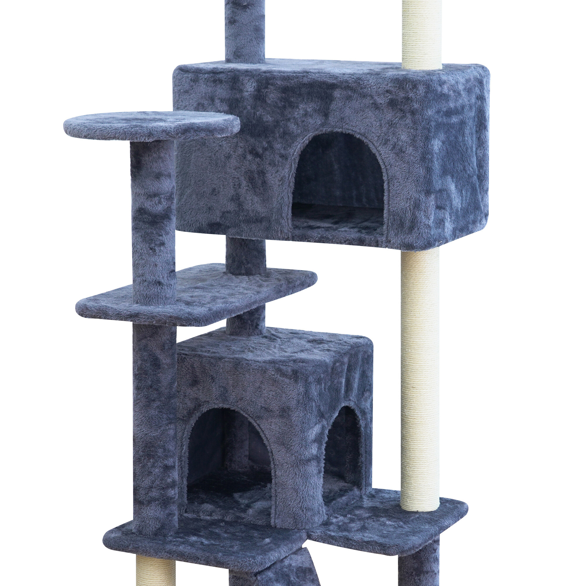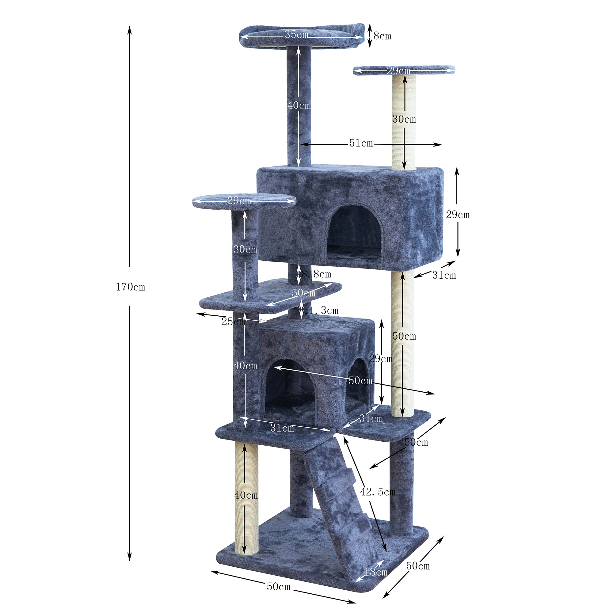 - Der Kratzbaum enthält: 2 Häuschen zum Verstecken, 3 Liegeflächen, eine Leiter und teilweise mit Sisal überzogene Säulen
