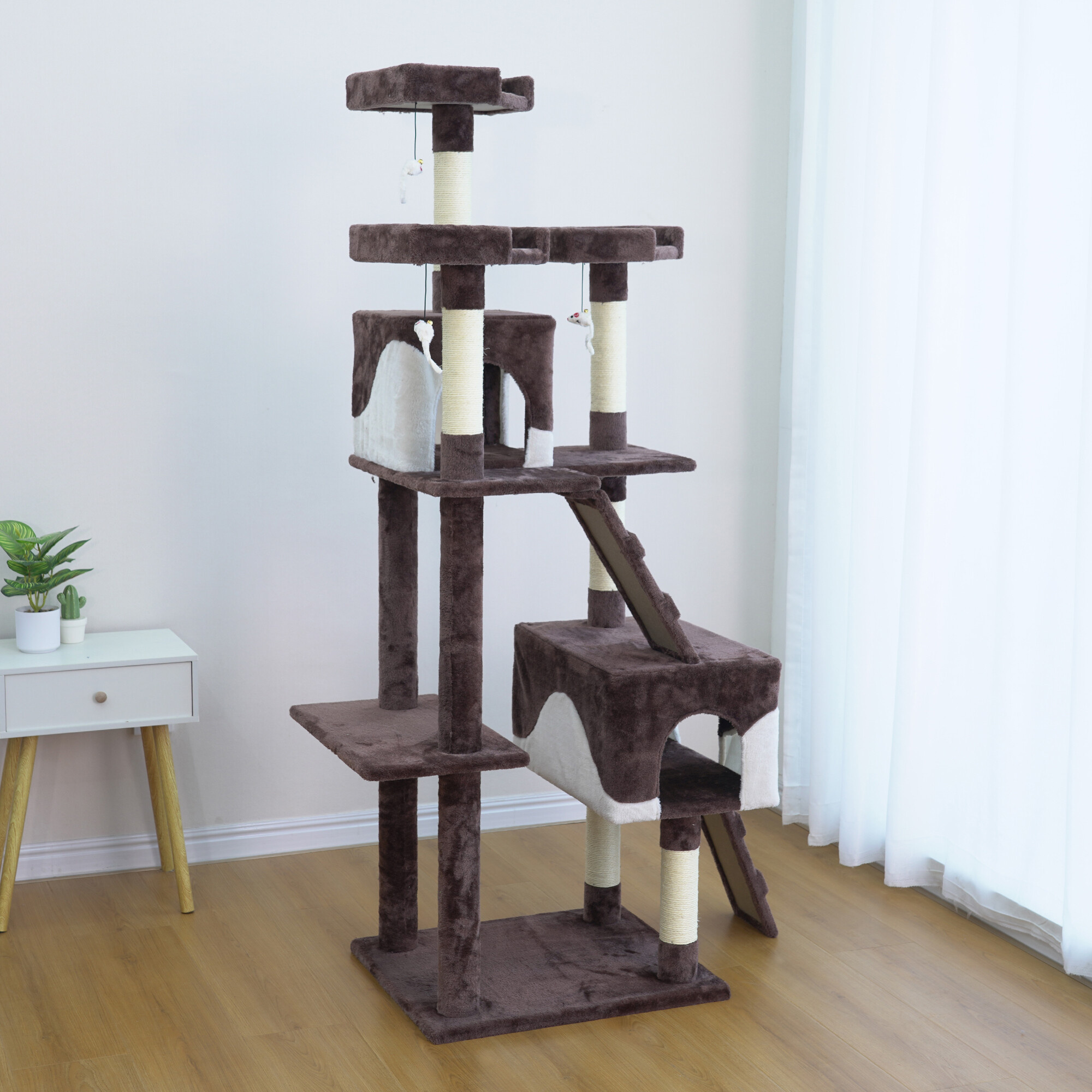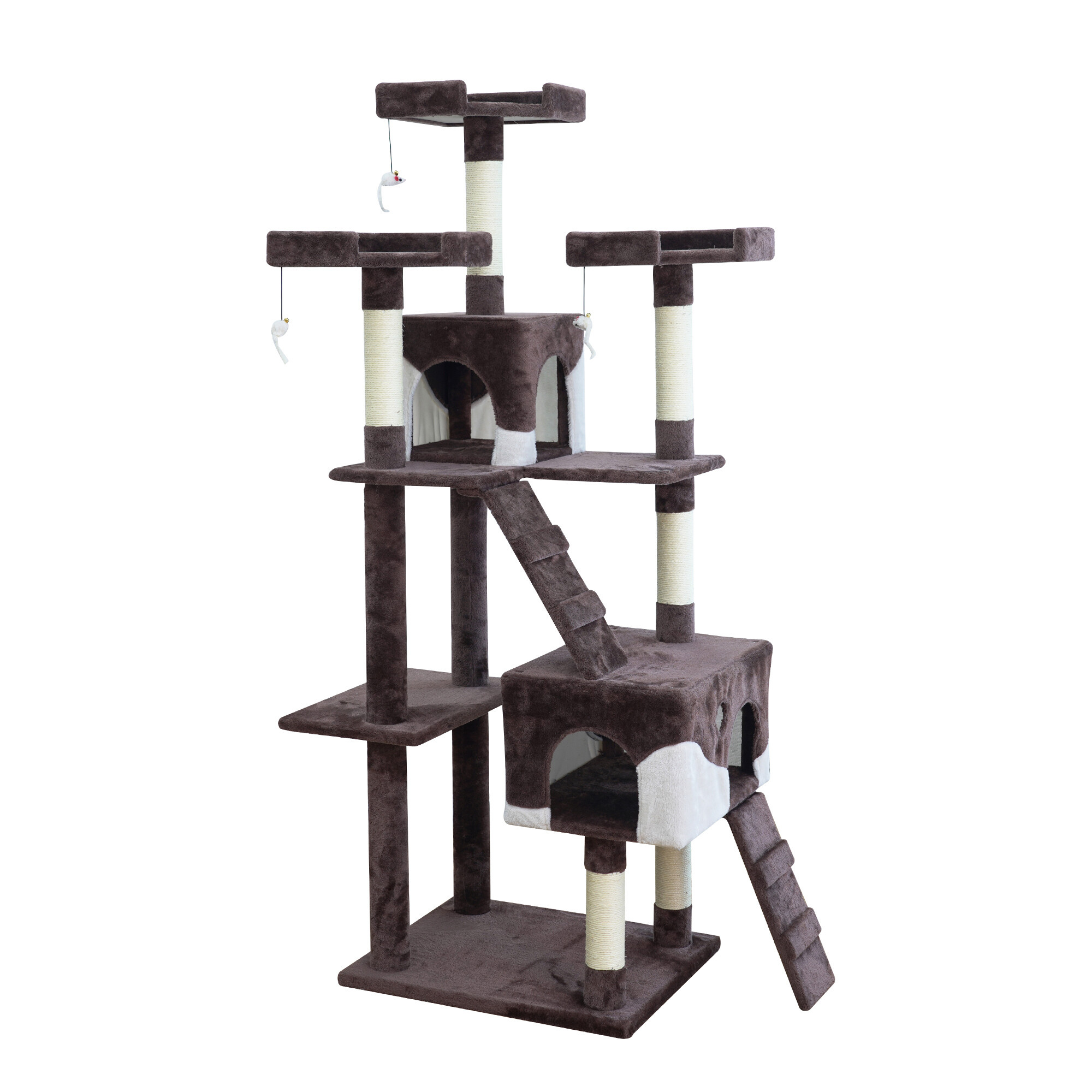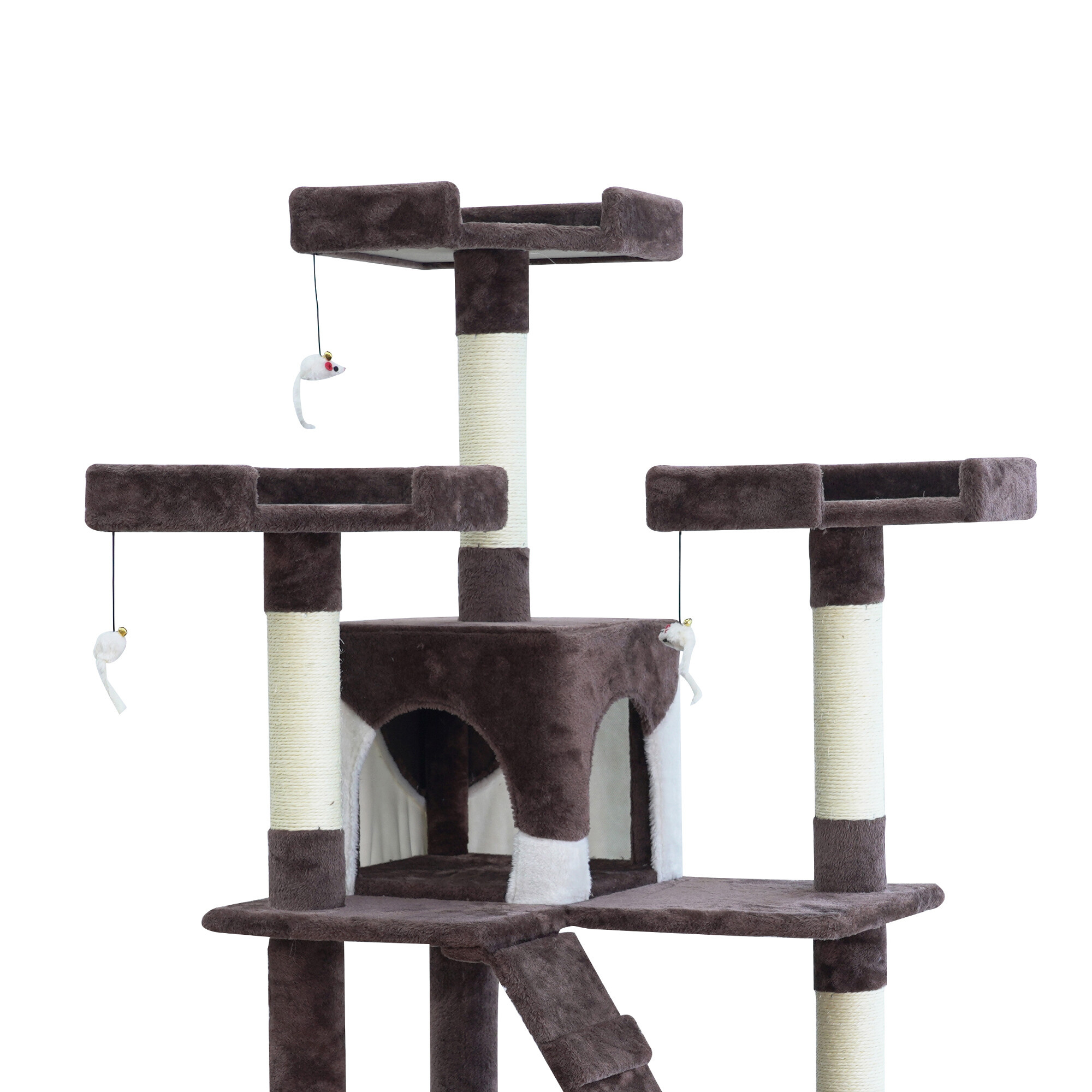 - Der Kratzbaum enthält: 2 Häuschen zum Verstecken, 3 Liegeflächen, 2 Leitern, 3 Spielmäuse an elastischen Seilen befestigt und teilweise mit Sisal überzogene Säulen