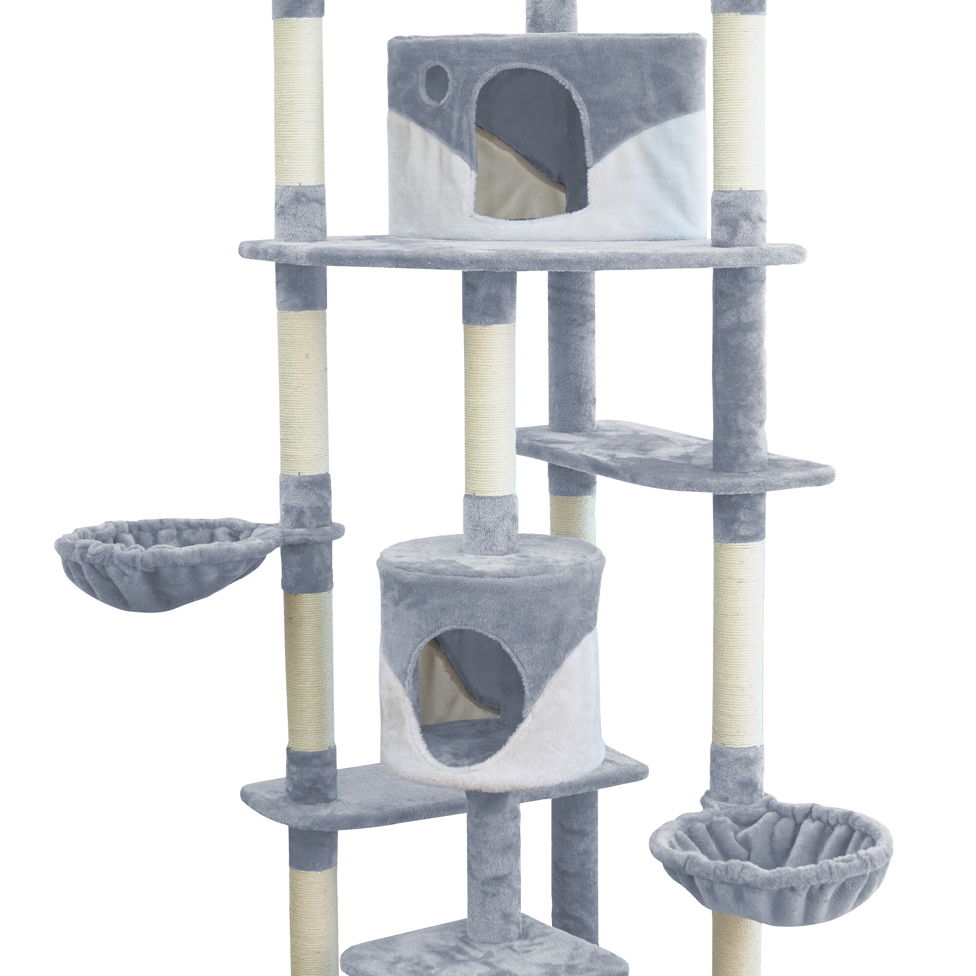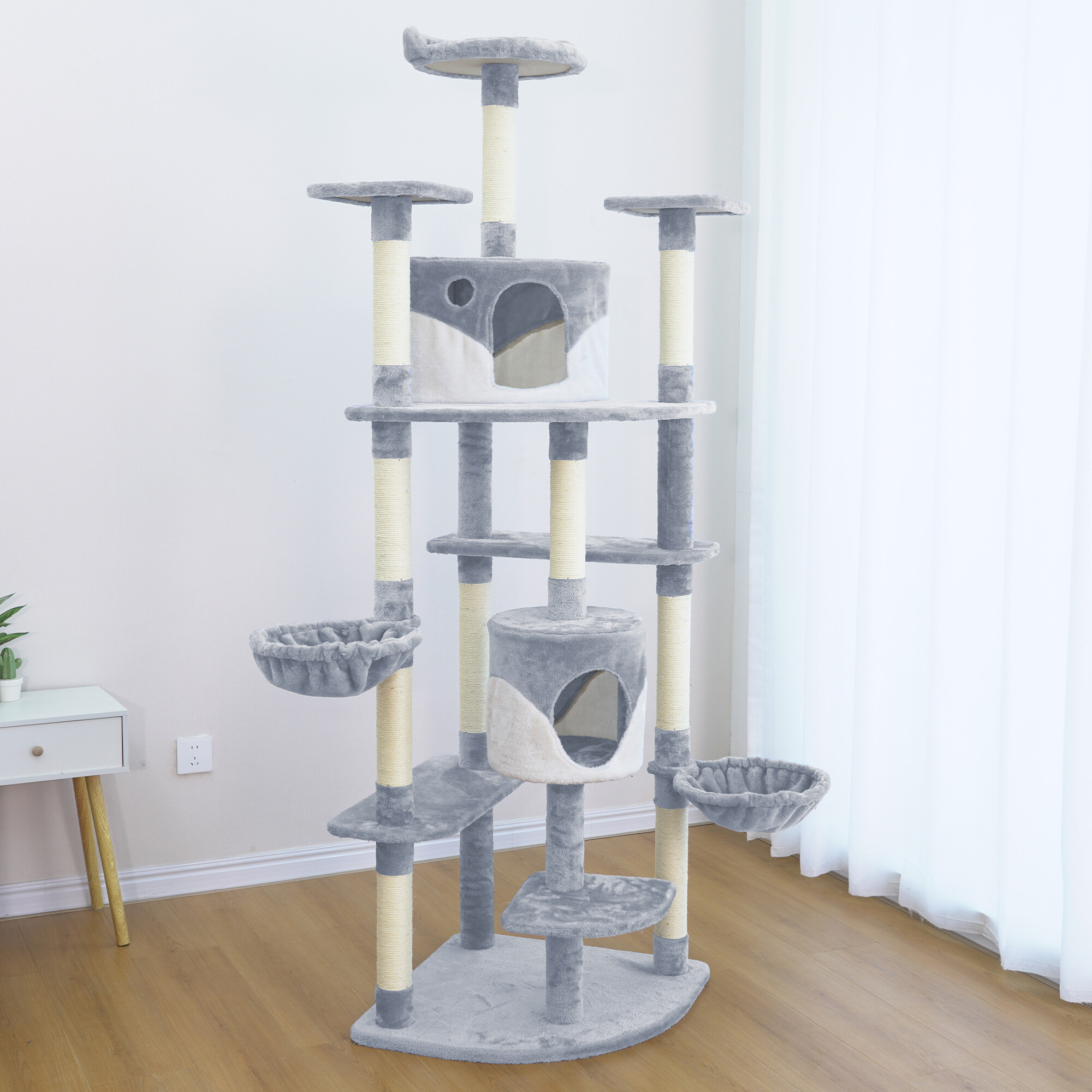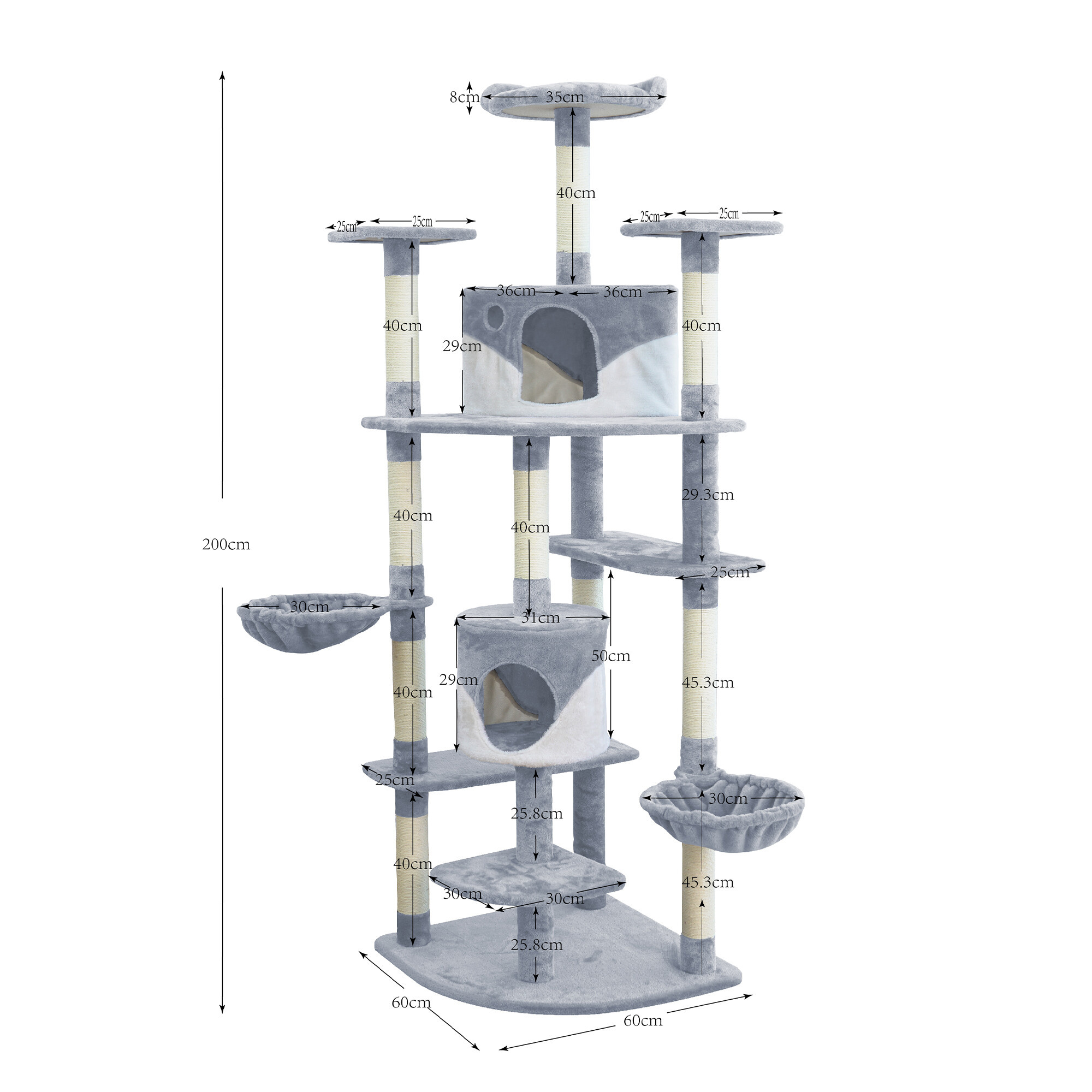 - Der Kratzbaum enthält: 2 Häuschen zum Verstecken, 5 Liegeflächen und teilweise mit Sisal überzogene Säulen