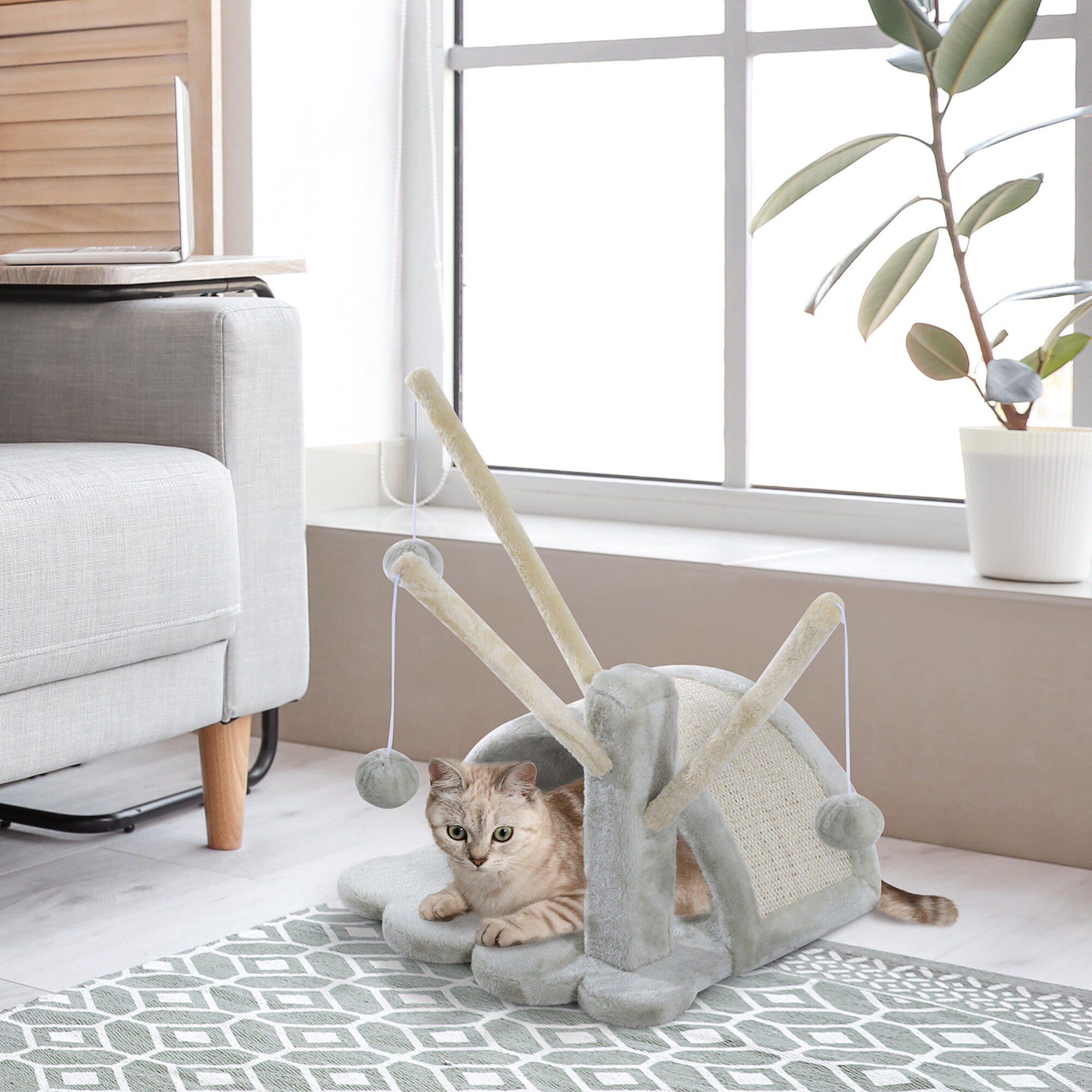 Die Kratzbrücke, die mit hochwertigem und starkem Sisal umwickelt ist, dient ihr jederzeit zum Schärfen der Krallen, ohne dass Sie riskieren, dass sie es genau dort tut, wo Sie es nicht möchten. Gleichzeitig wird es dank des weichen Plüschs ihr Lieblingsplatz zum Ausruhen und Spielen sein.