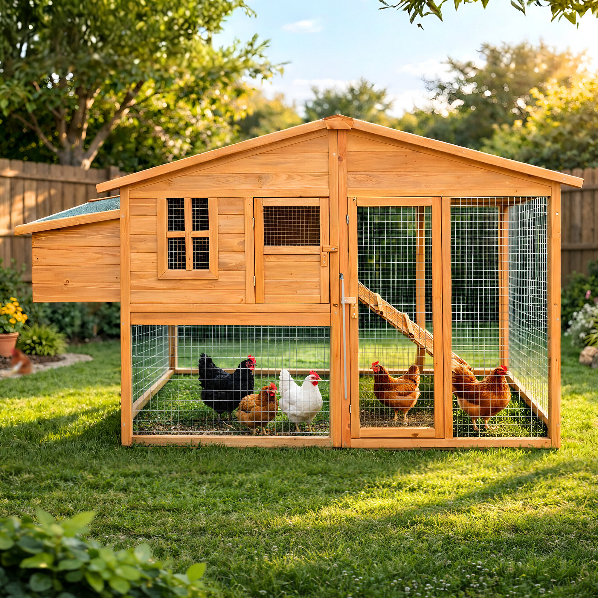 Dank dessen ist der Hühnerstall stabil und langfristig widerstandsfähig gegen äußere Einflüsse. Die Konstruktion ist so gestaltet, dass sie den Hühnern ausreichend Platz bietet und gleichzeitig für die Züchter leicht zugänglich ist.Der an den Wohnbereich angeschlossene Auslauf ermöglicht den Hühnern freie Bewegung.