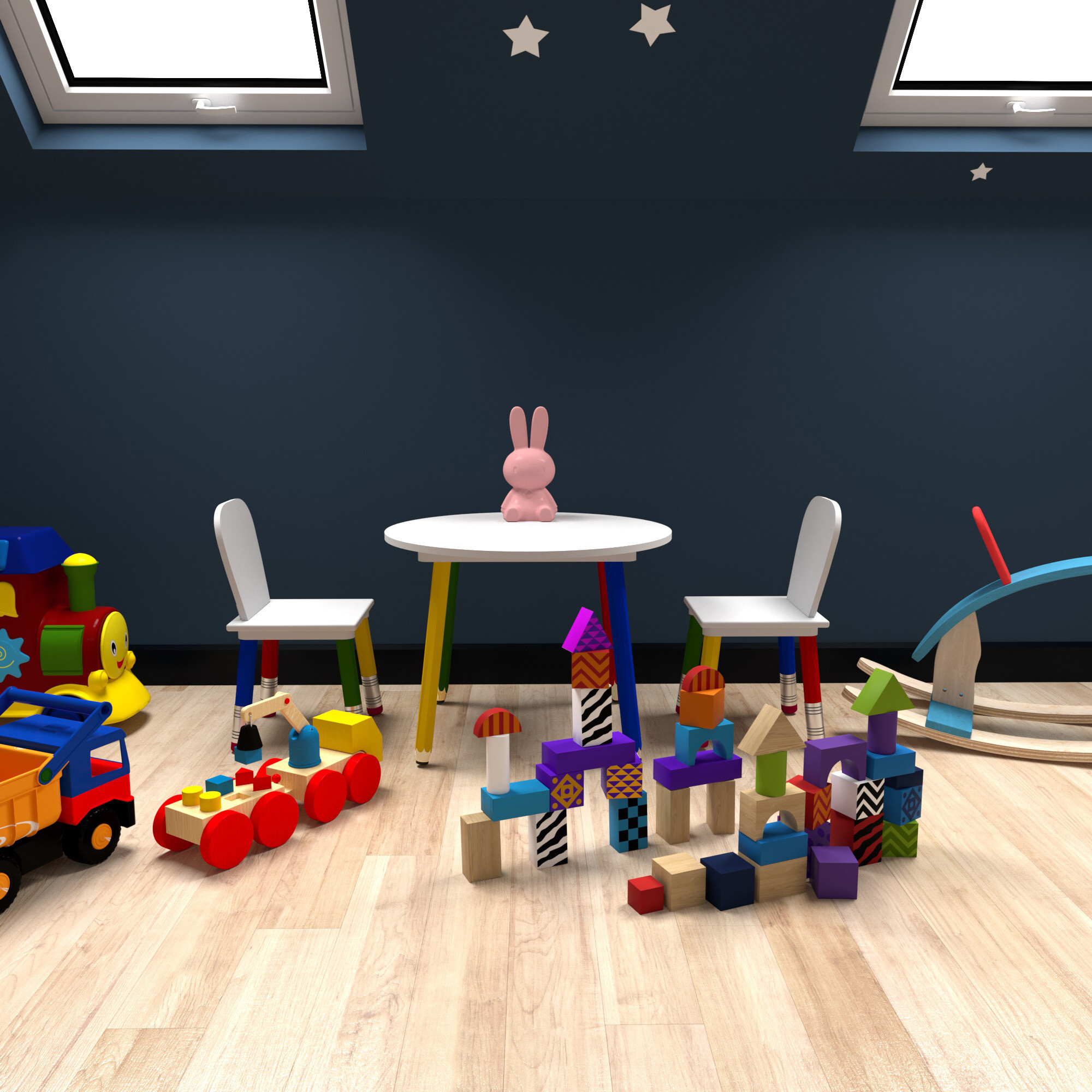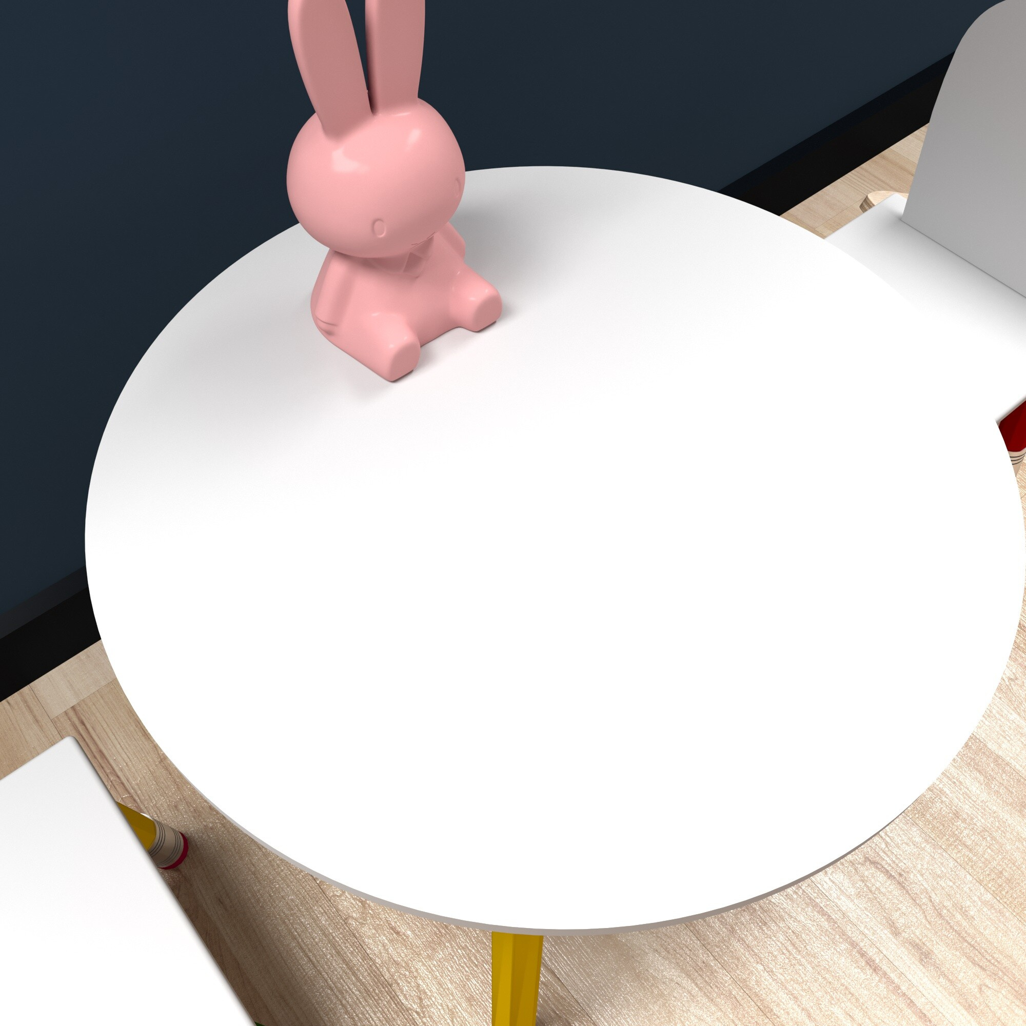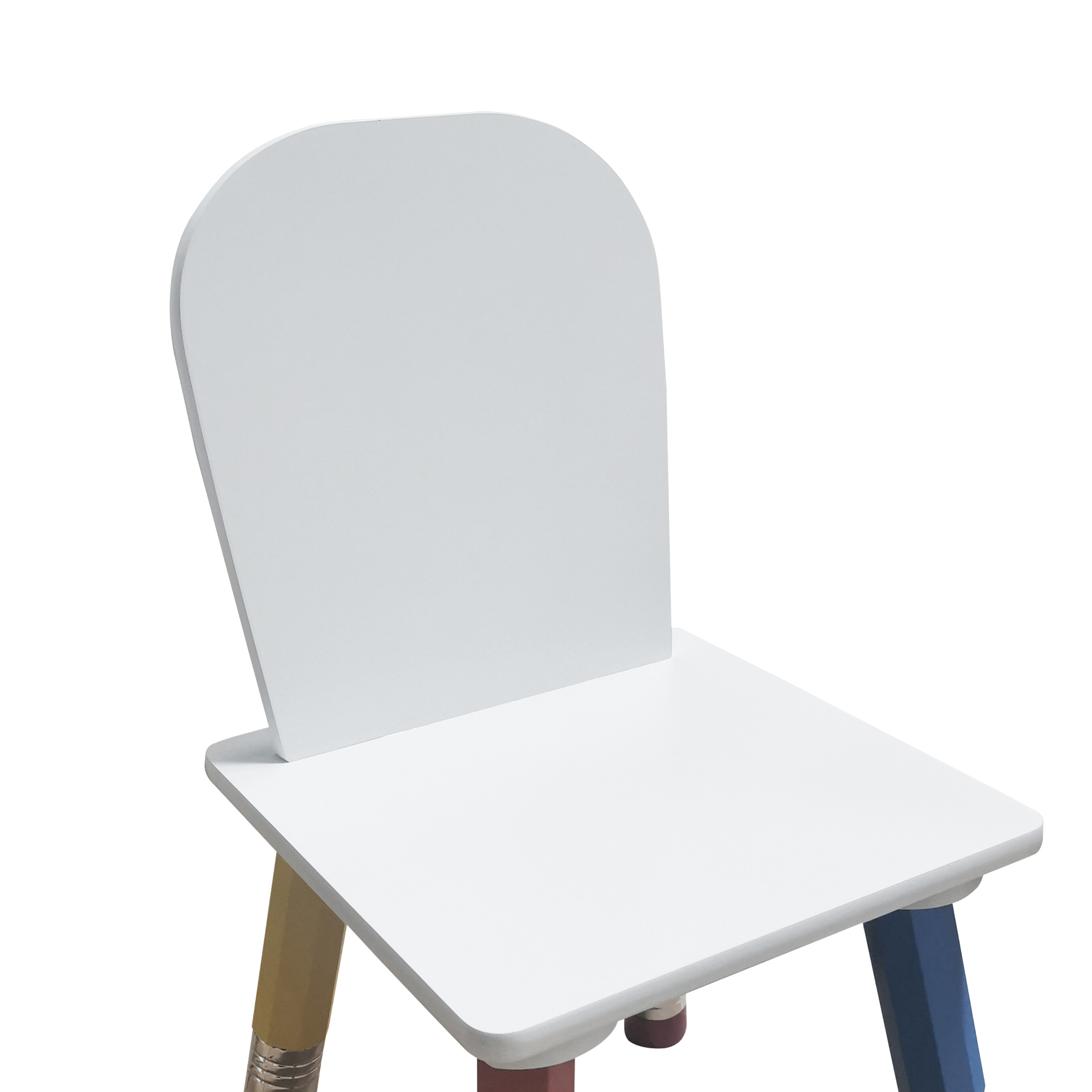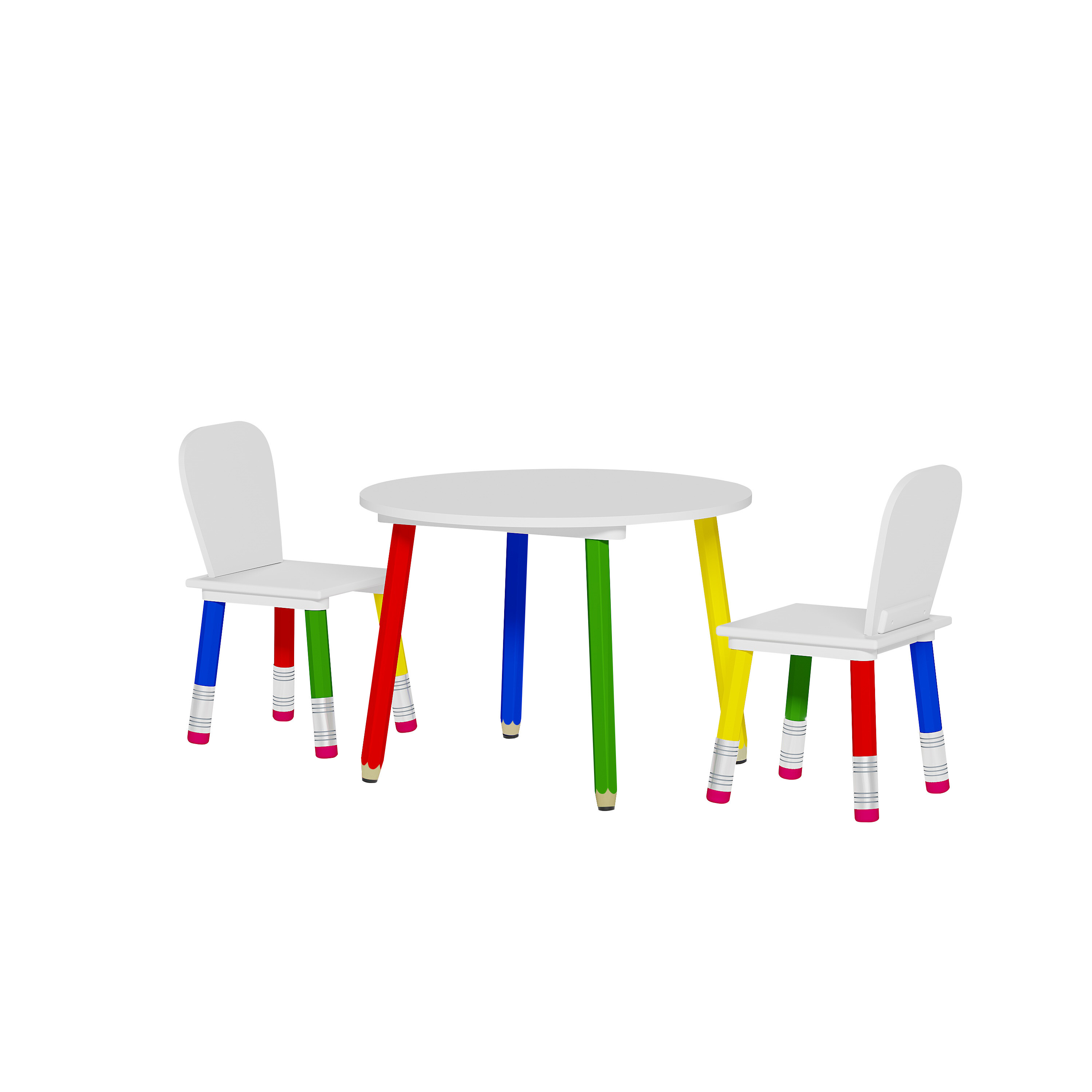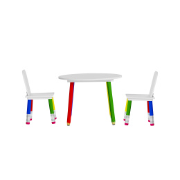 Besorgen Sie Ihren Kindern dieses bunte Kindergeschirr-Set mit Tisch und Stühlen.Die Möbelbeine erinnern an Kinderbuntstifte.