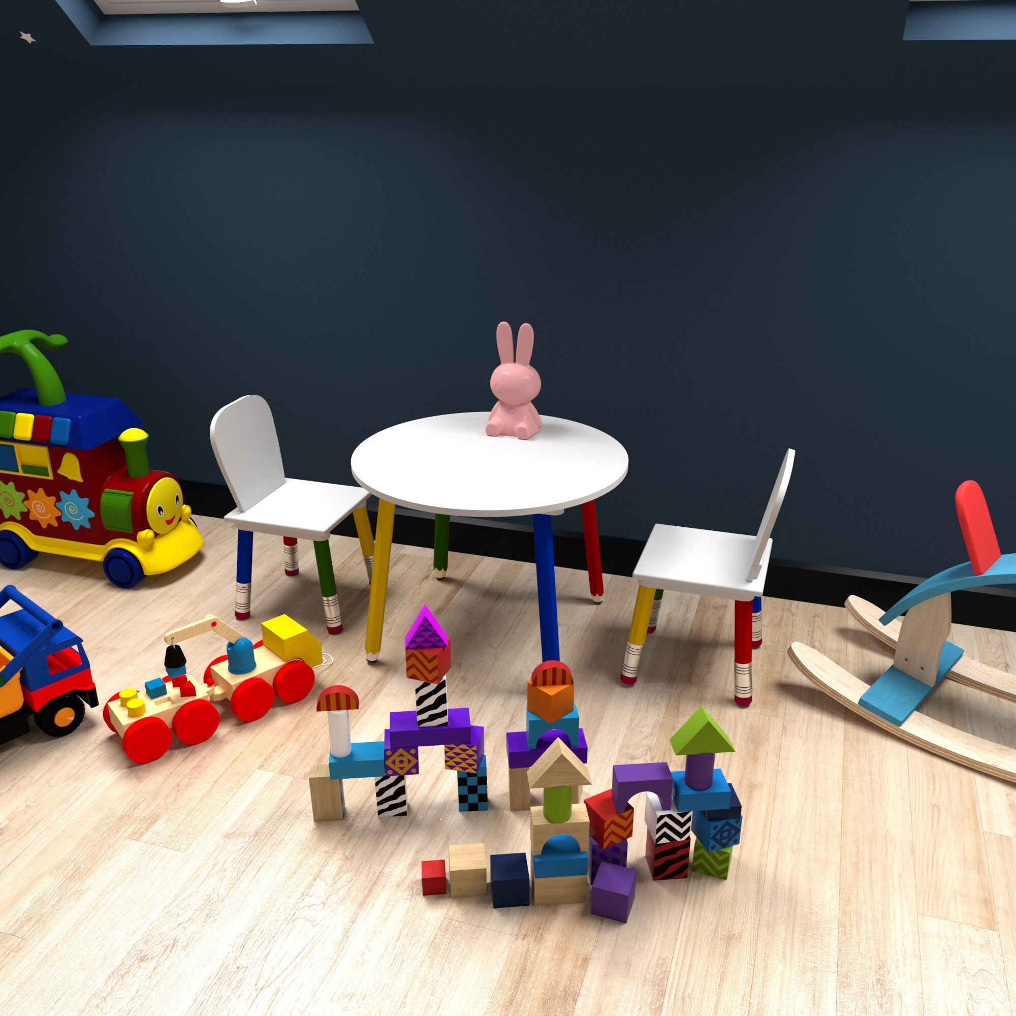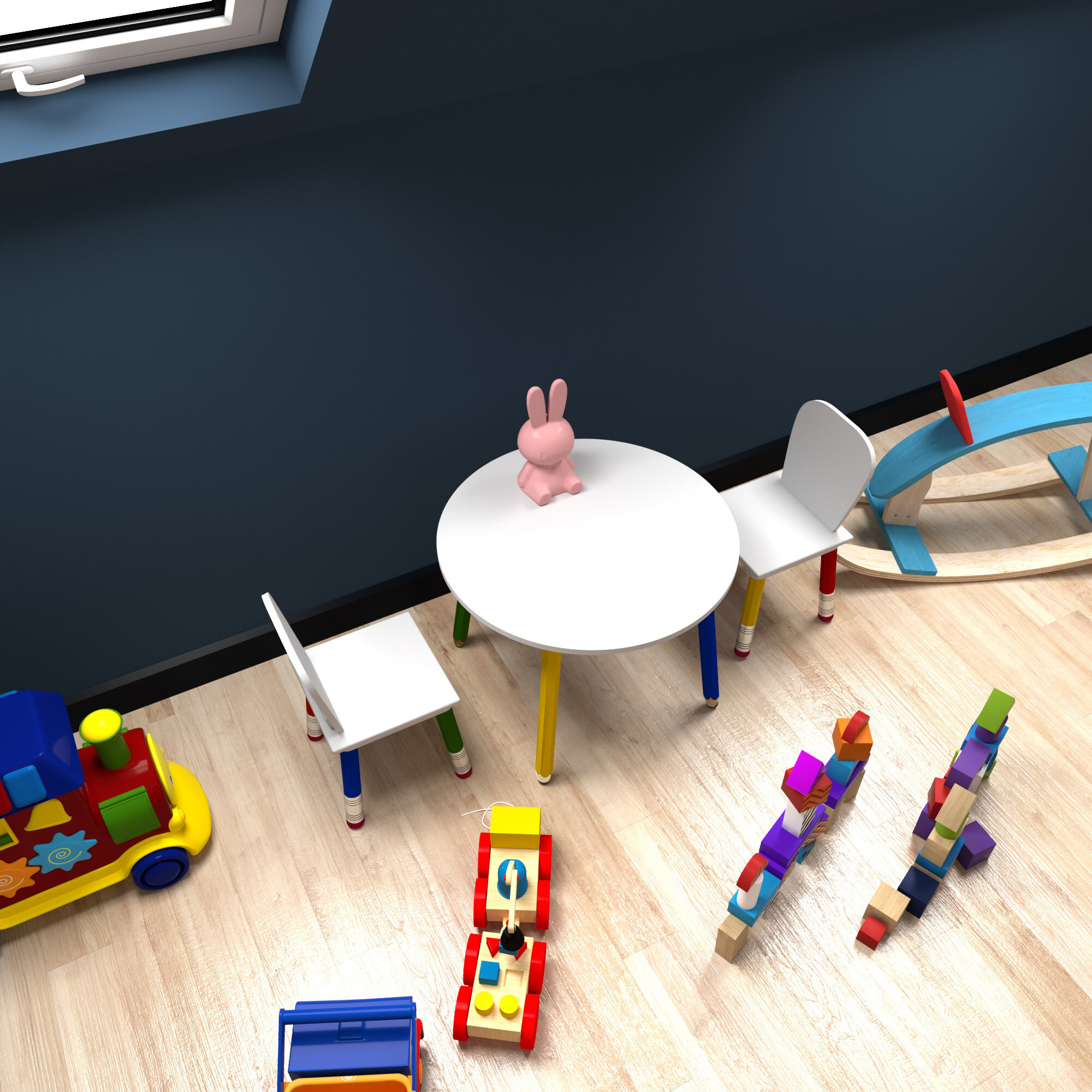 - Die Möbelbeine erinnern an Kinderbuntstifte
