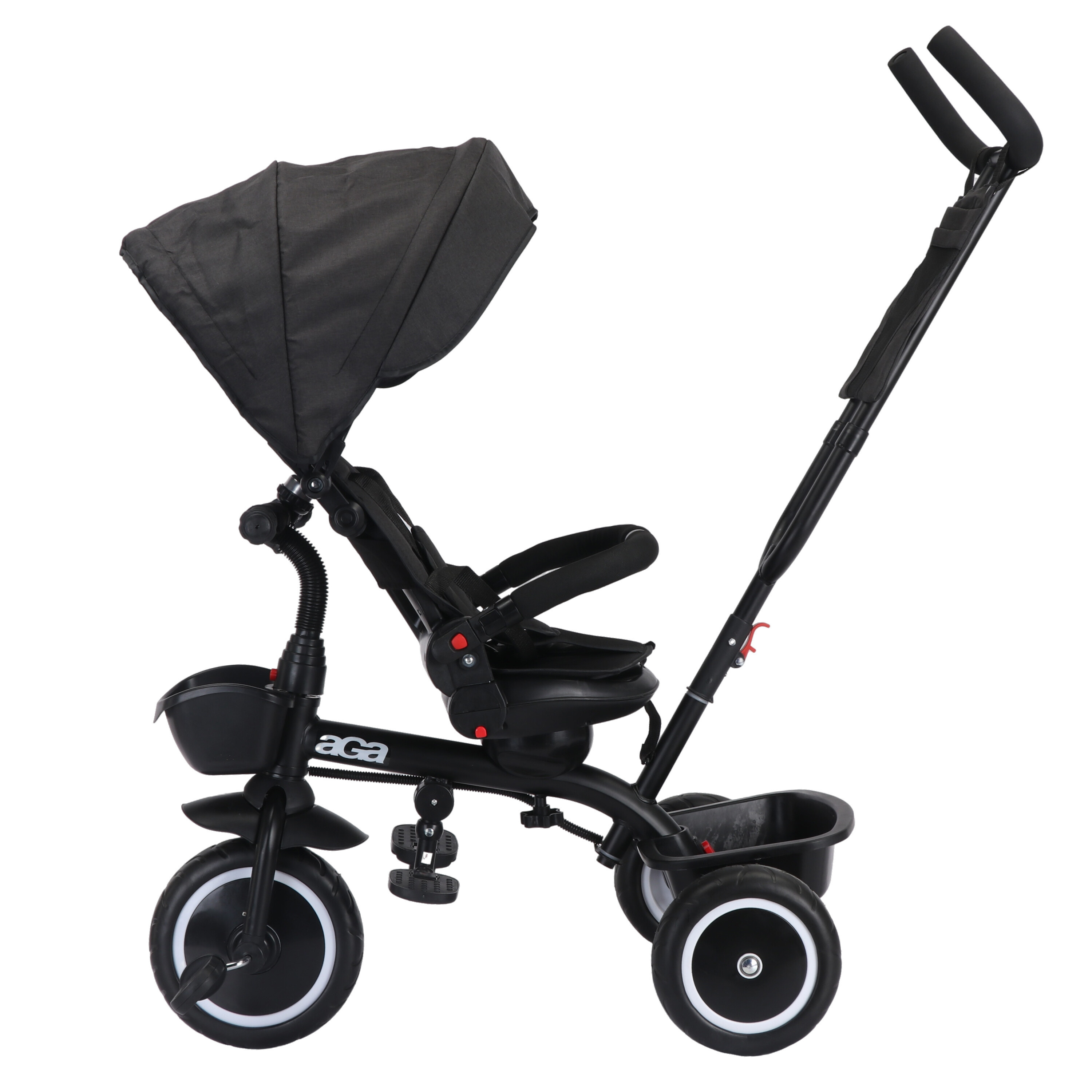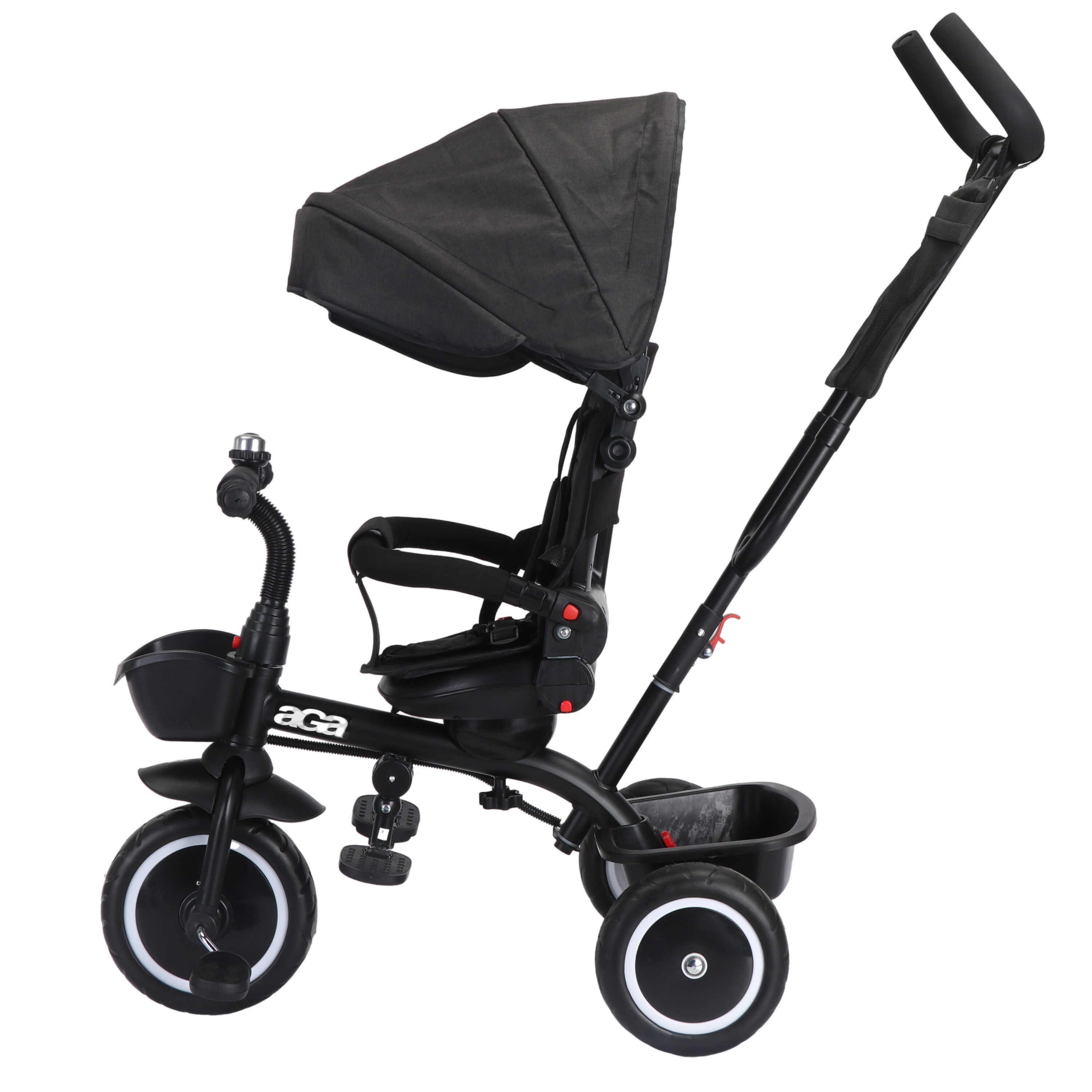Das Dreirad ist mit einem Sicherheitsgurt, rutschfesten Pedalen, ergonomisch geformten Lenkergriffen (Griffe) und einem Sonnenschutzdach ausgestattet.