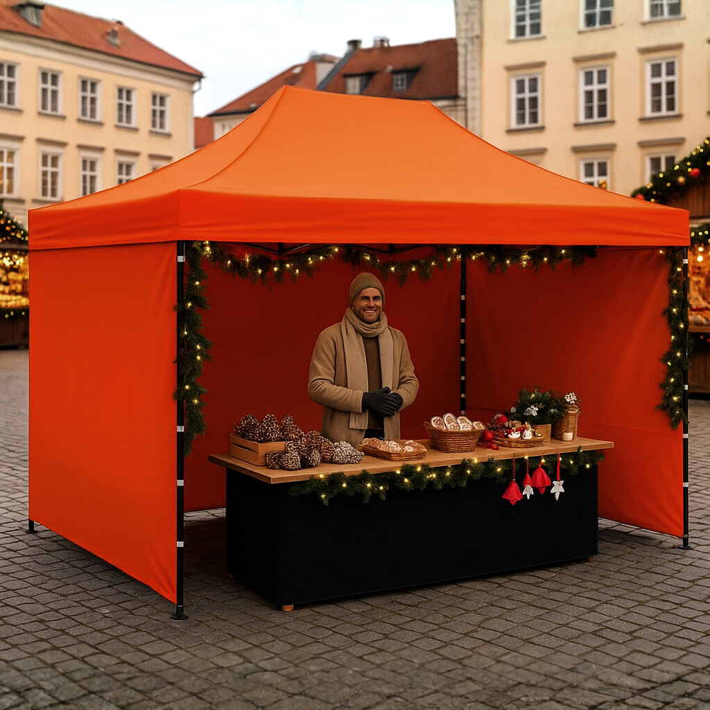 Verkaufsstand 3×4,5 m mit Stahl-Scherenkonstruktion bietet eine größere überdachte Fläche, die ideal für Präsentationen, Standverkäufe und Firmenveranstaltungen ist.