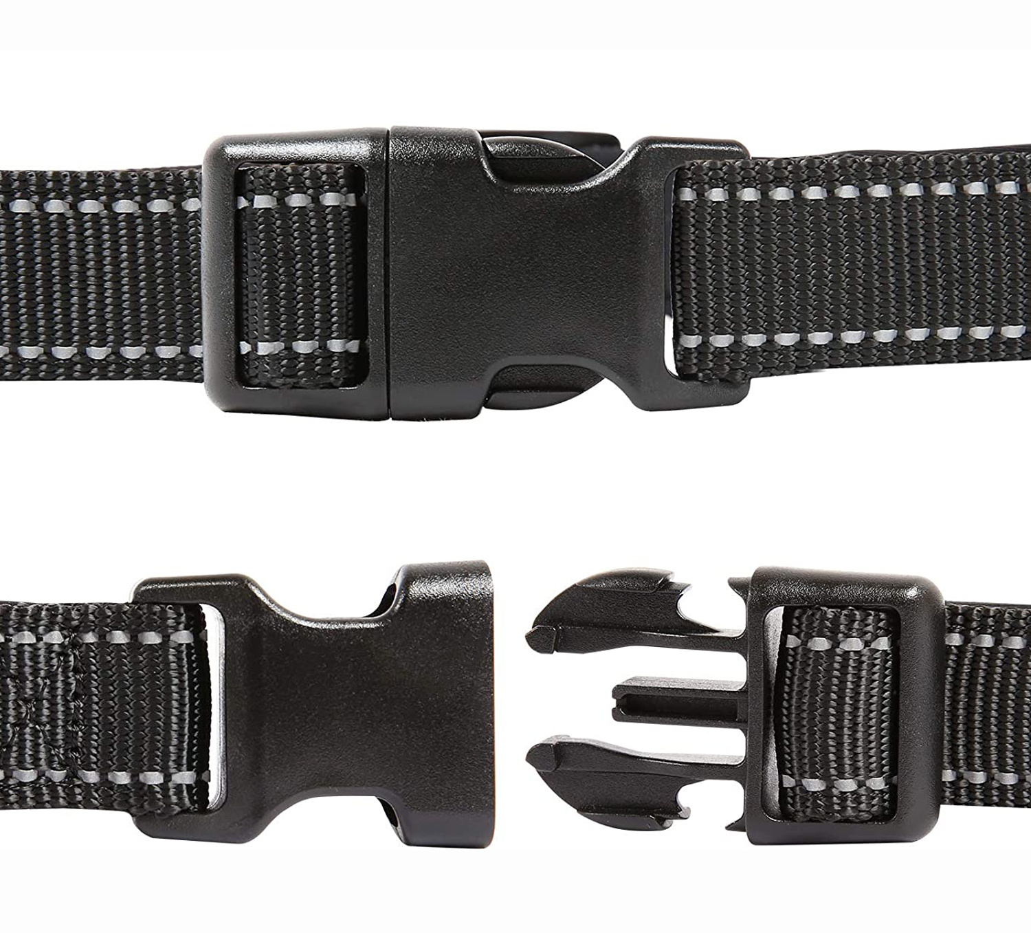 Das Halsband ist mit einem Kunststoffverschluss und einem Metallring zum Anbringen der Leine ausgestattet.