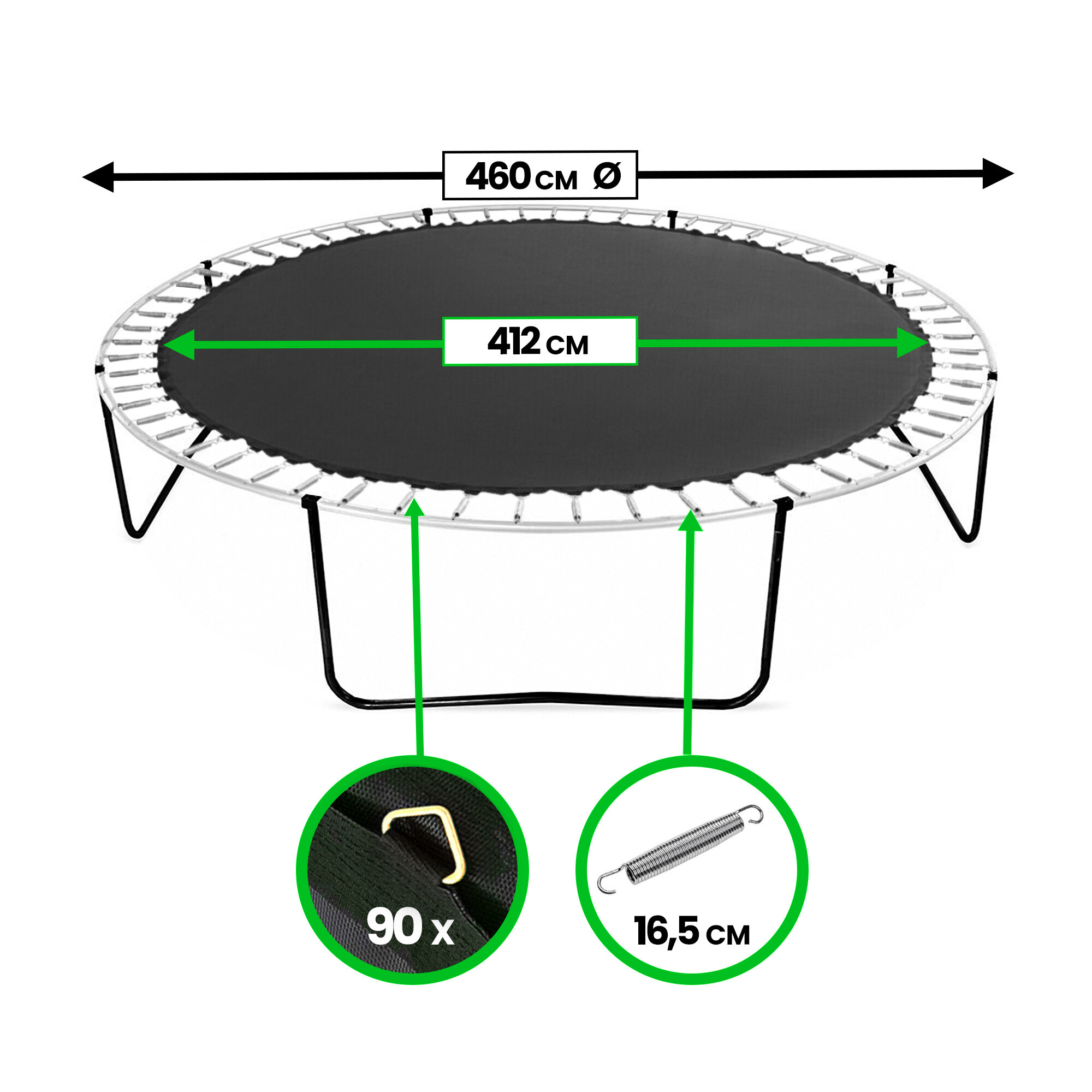 Bei Sprungflächen geben wir immer den Gesamtdurchmesser des Trampolins an, nicht den Durchmesser der Sprungfläche selbst!
