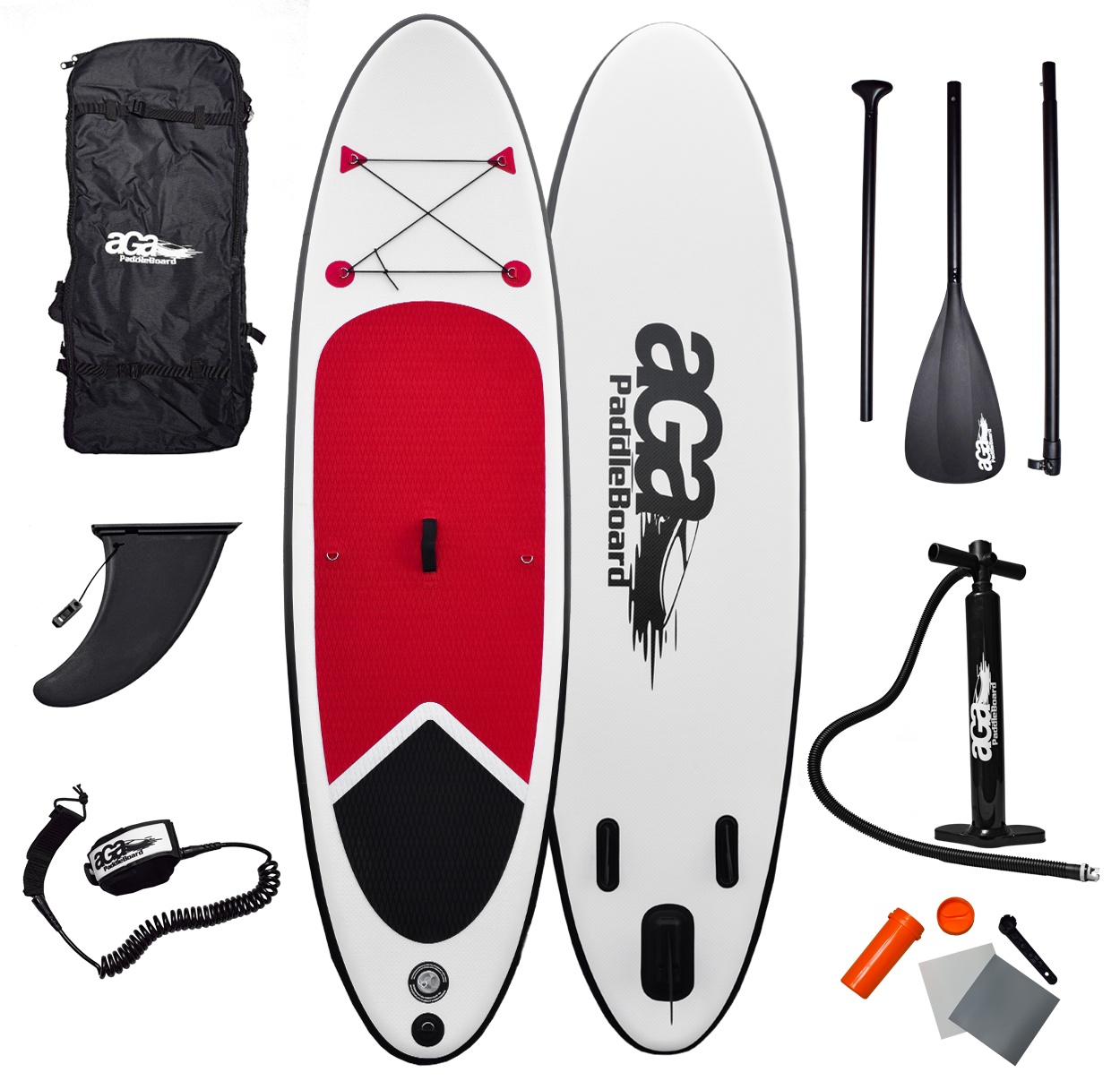 Im Paket finden Sie alles, was Sie brauchen, um aufs Wasser zu gehen: dreiteiliges Aluminiumpaddel mit verstellbarer Länge, Pumpe mit Manometer, Sicherheitsleine, fin,Reparatursatz.