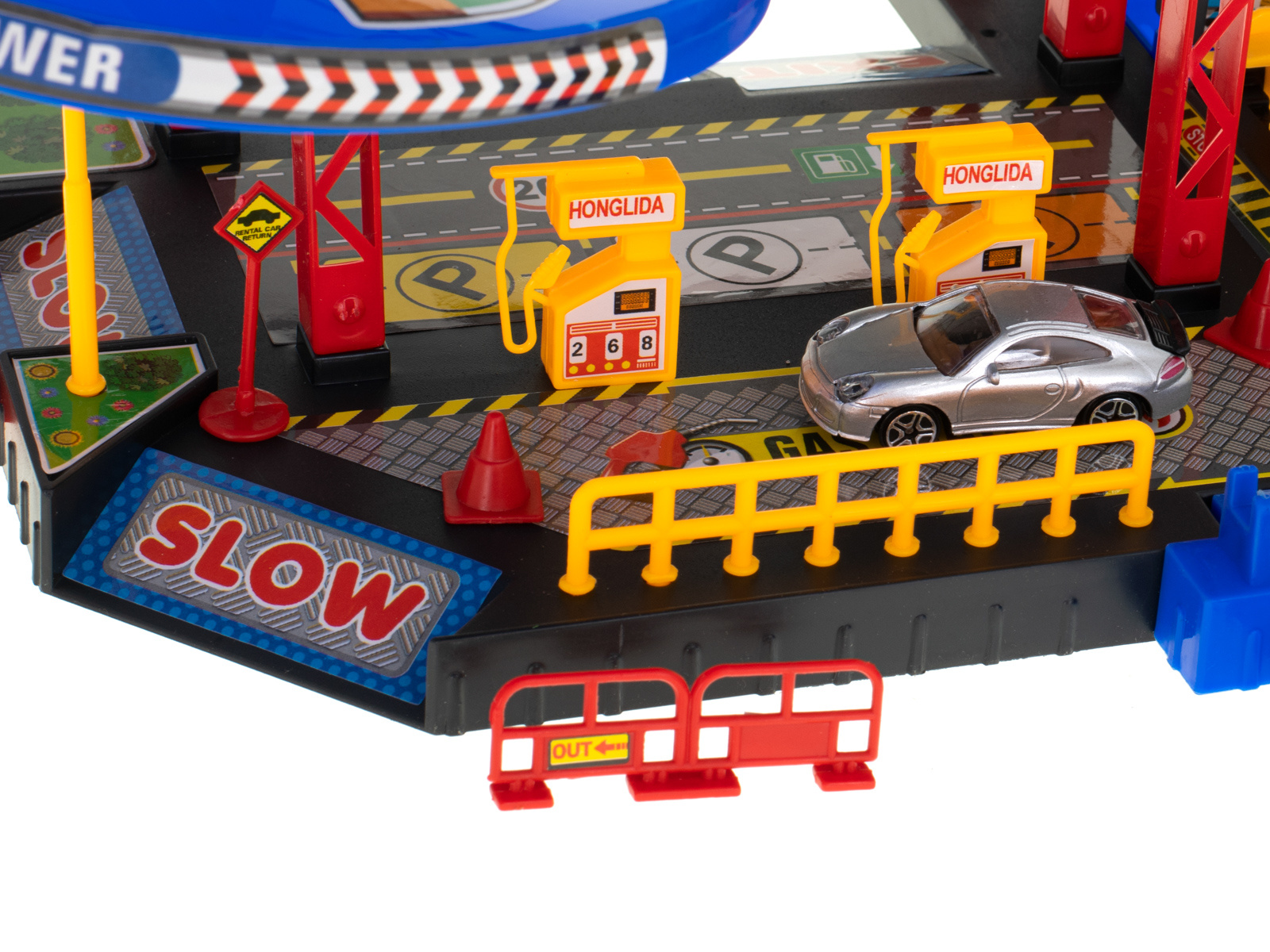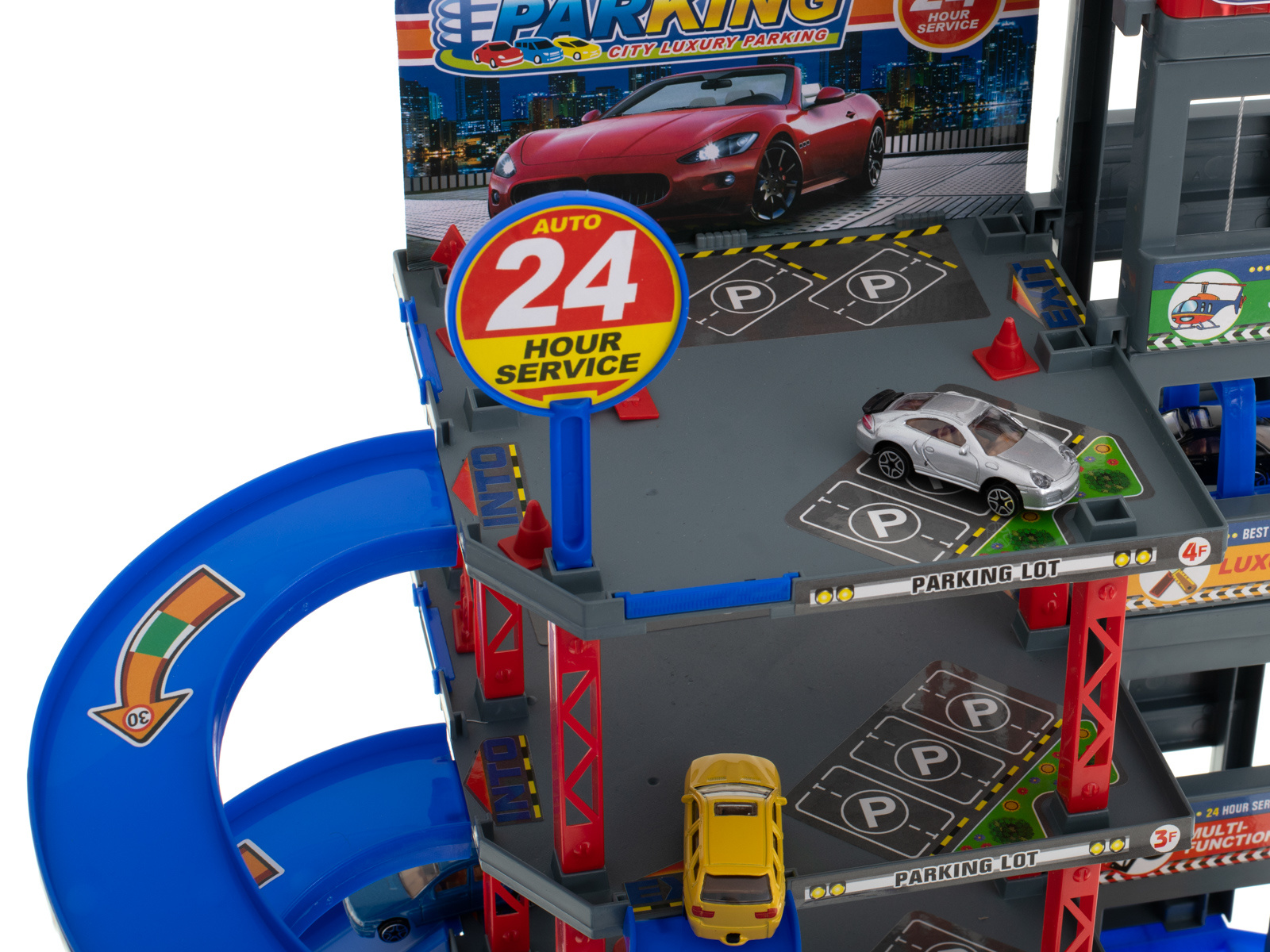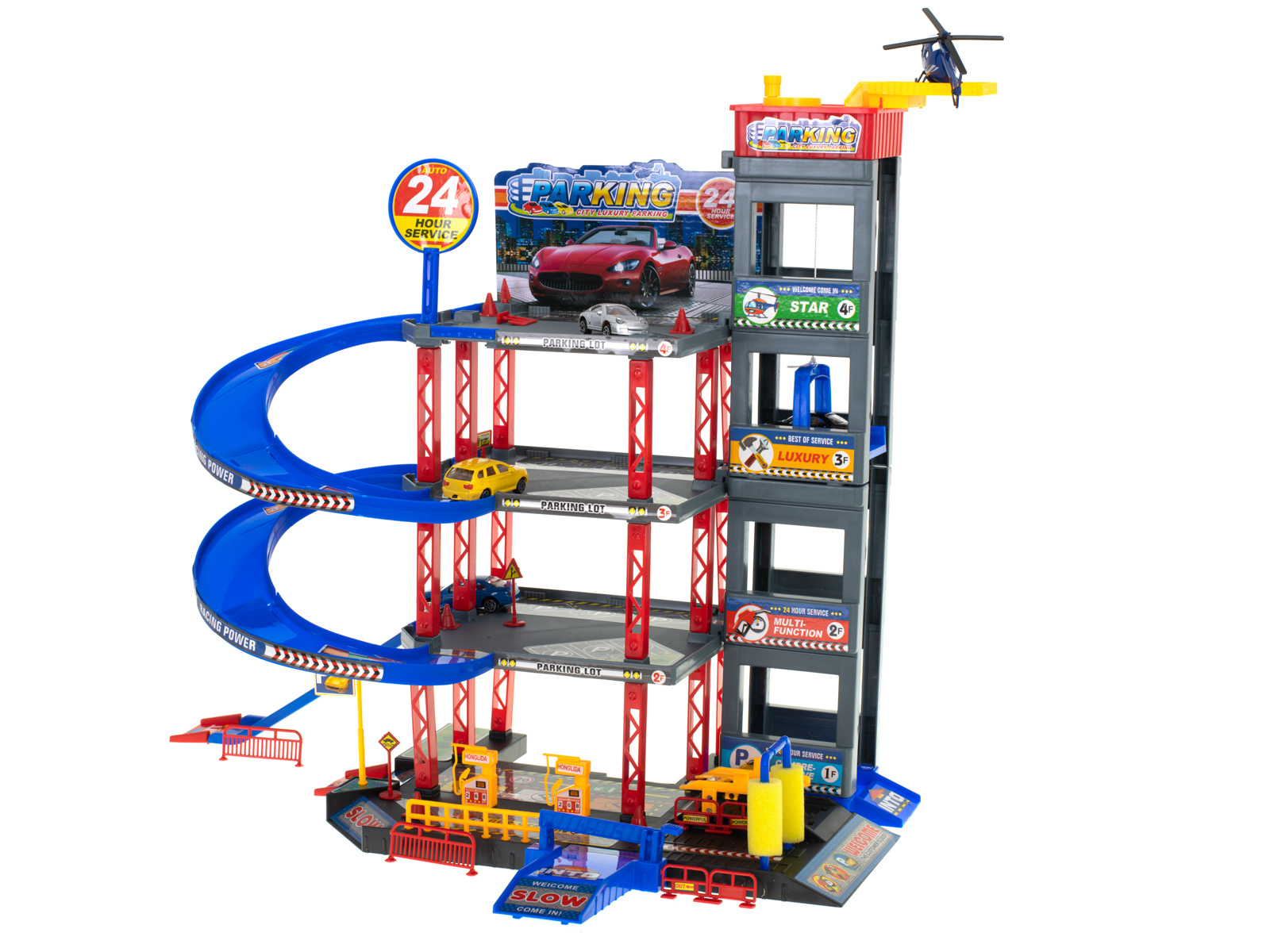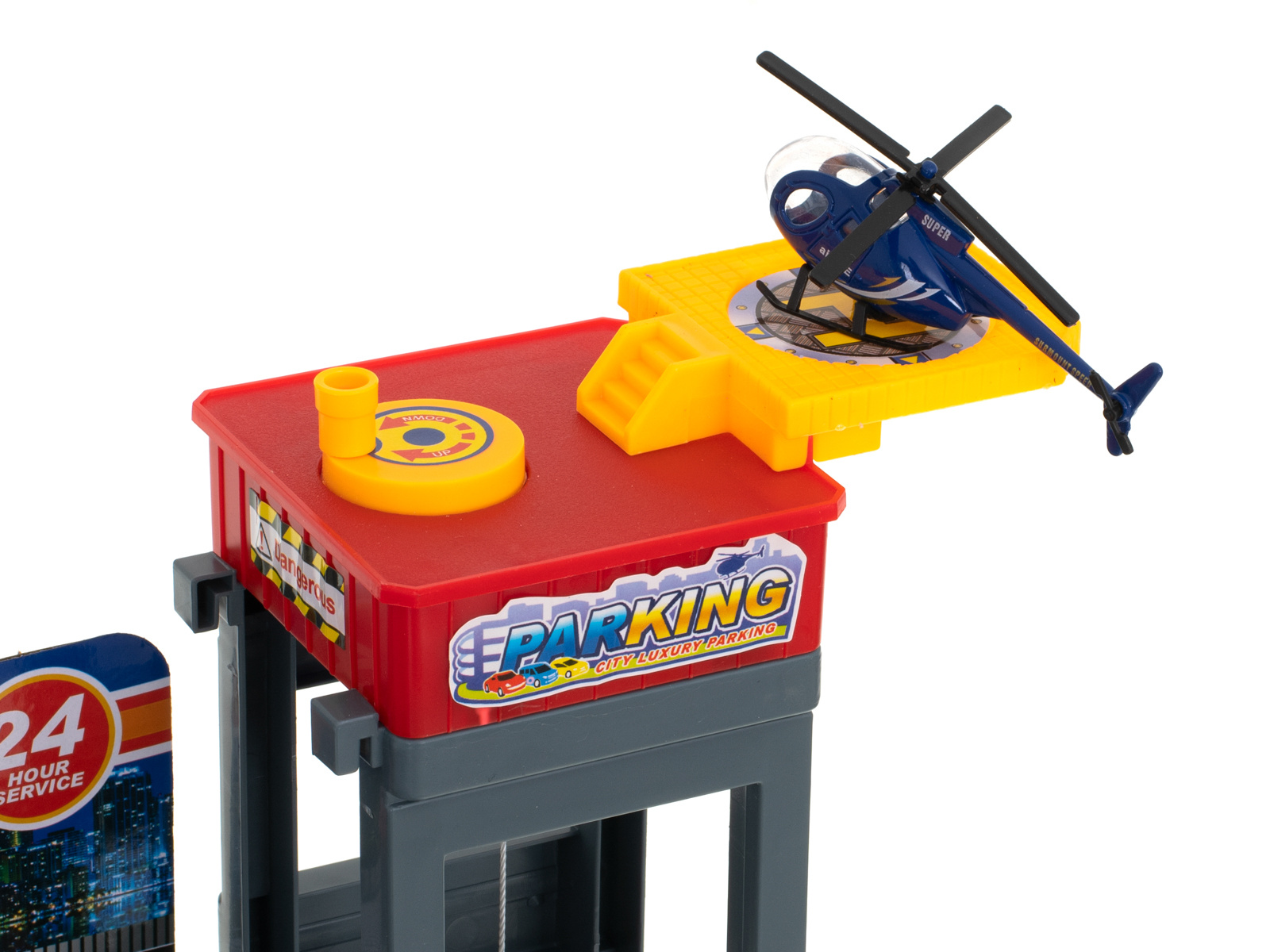 Eine Garage mit vielen Funktionen ist eine Freude für jeden kleinen Autoliebhaber. Jede Etage bietet Platz für 6 Autos, so dass der Parkplatz nicht nur für die im Set enthaltenen Fahrzeuge, sondern auch für andere Autos geeignet ist.Der Zugang zum Parkplatz erfolgt über eine erhöhte Schranke. Die anderen Etagen sind mit dem Aufzug zu erreichen. Vergessen Sie nicht zu tanken! Bereiten Sie Ihr Auto für das Rennen vor. Im Erdgeschoss befindet sich eine Tankstelle. kümmern Sie sich um Ihr Auto. Nutzen Sie die Autowaschanlage, damit Ihr Auto während des Rennens phänomenal aussieht.Lust auf ein Abenteuer in den Wolken? Steigen Sie aus dem Auto aus und ein... hubschrauber! an der Spitze des Gebäudes befindet sich ein Landeplatz, von dem aus Sie eine einzigartige Reise antreten können.Außerdem gibt es eine Zugangsrampe und zahlreiche Zufahrten im Erdgeschoss. Markierungen, Hindernisse und Pfosten sind ebenfalls Teil des Spiels, um es noch abwechslungsreicher zu gestalten.